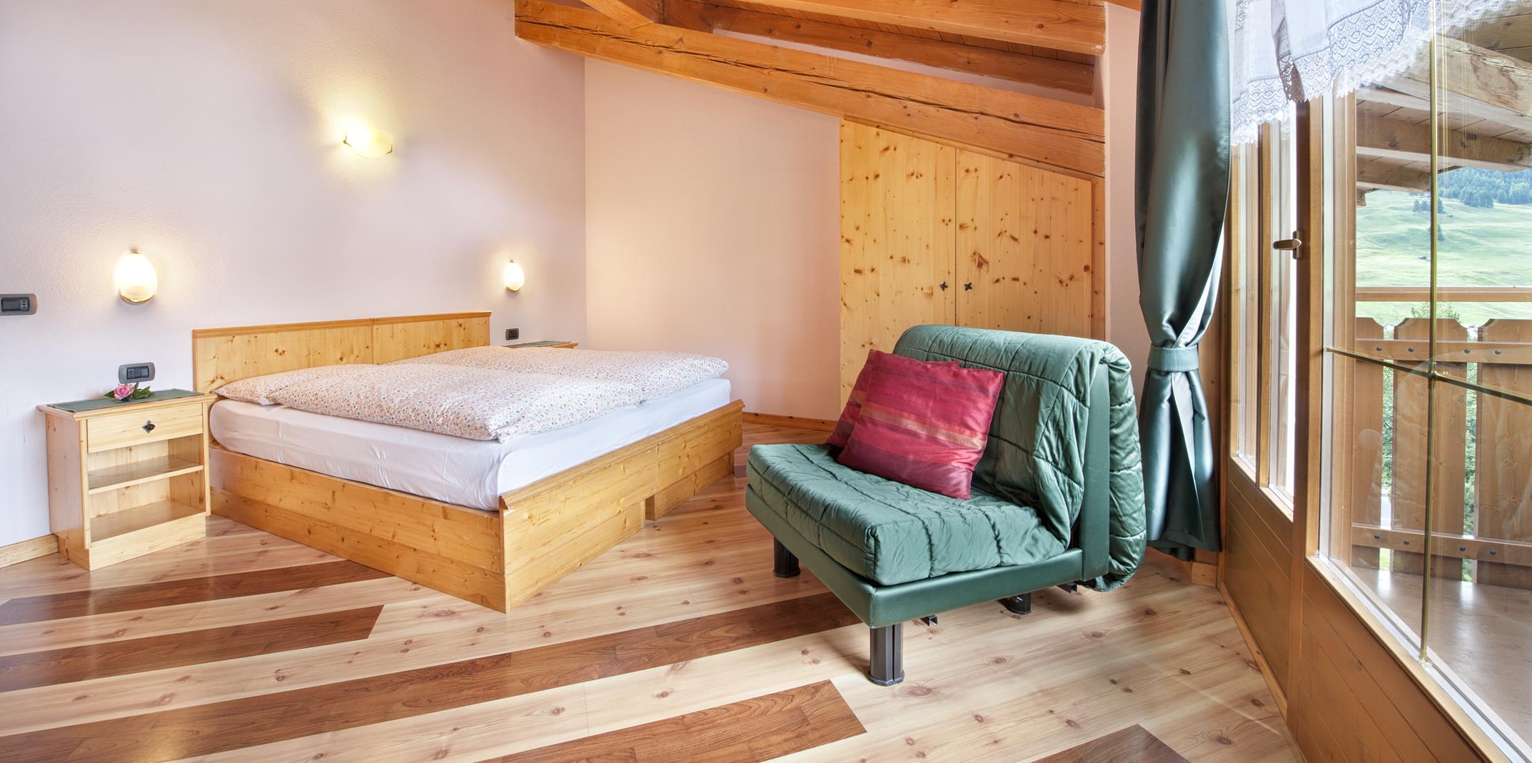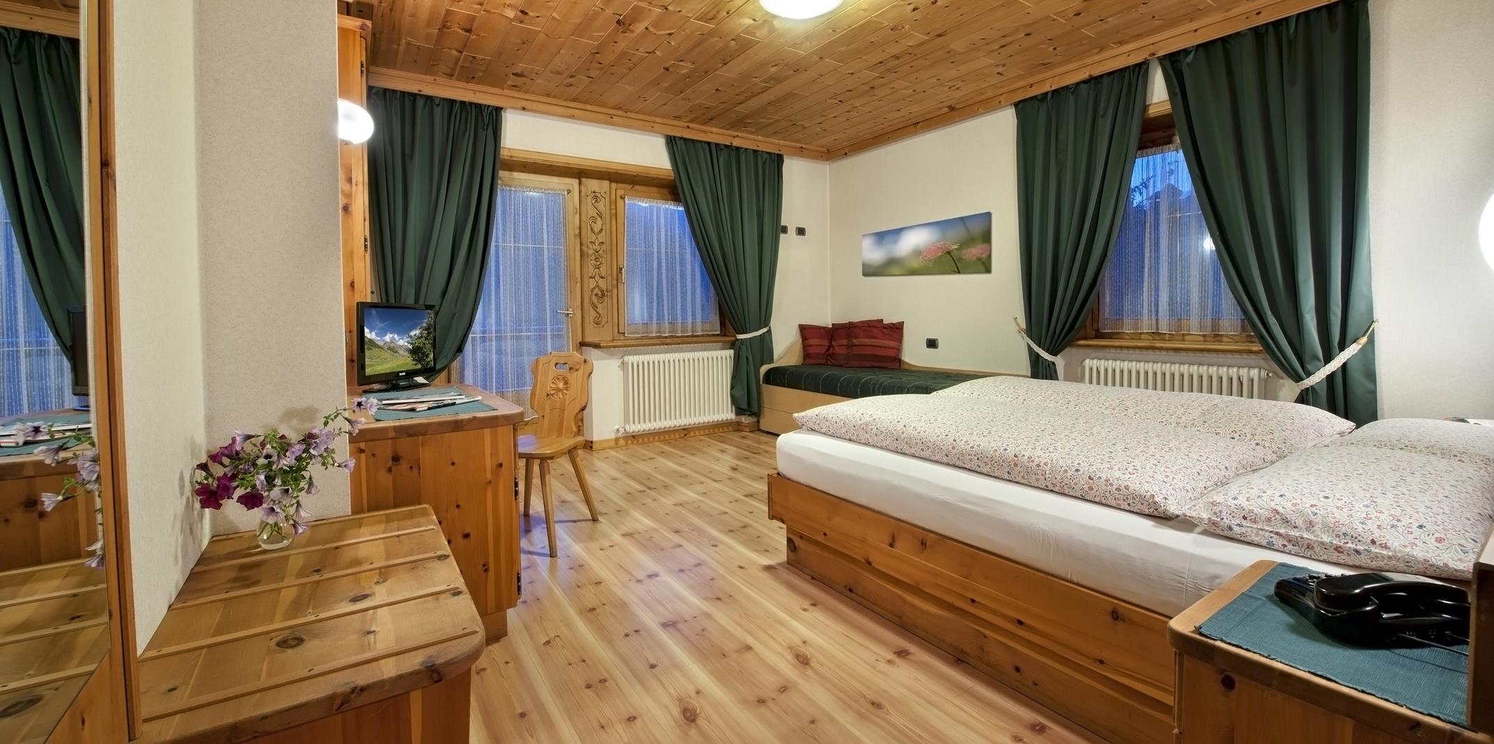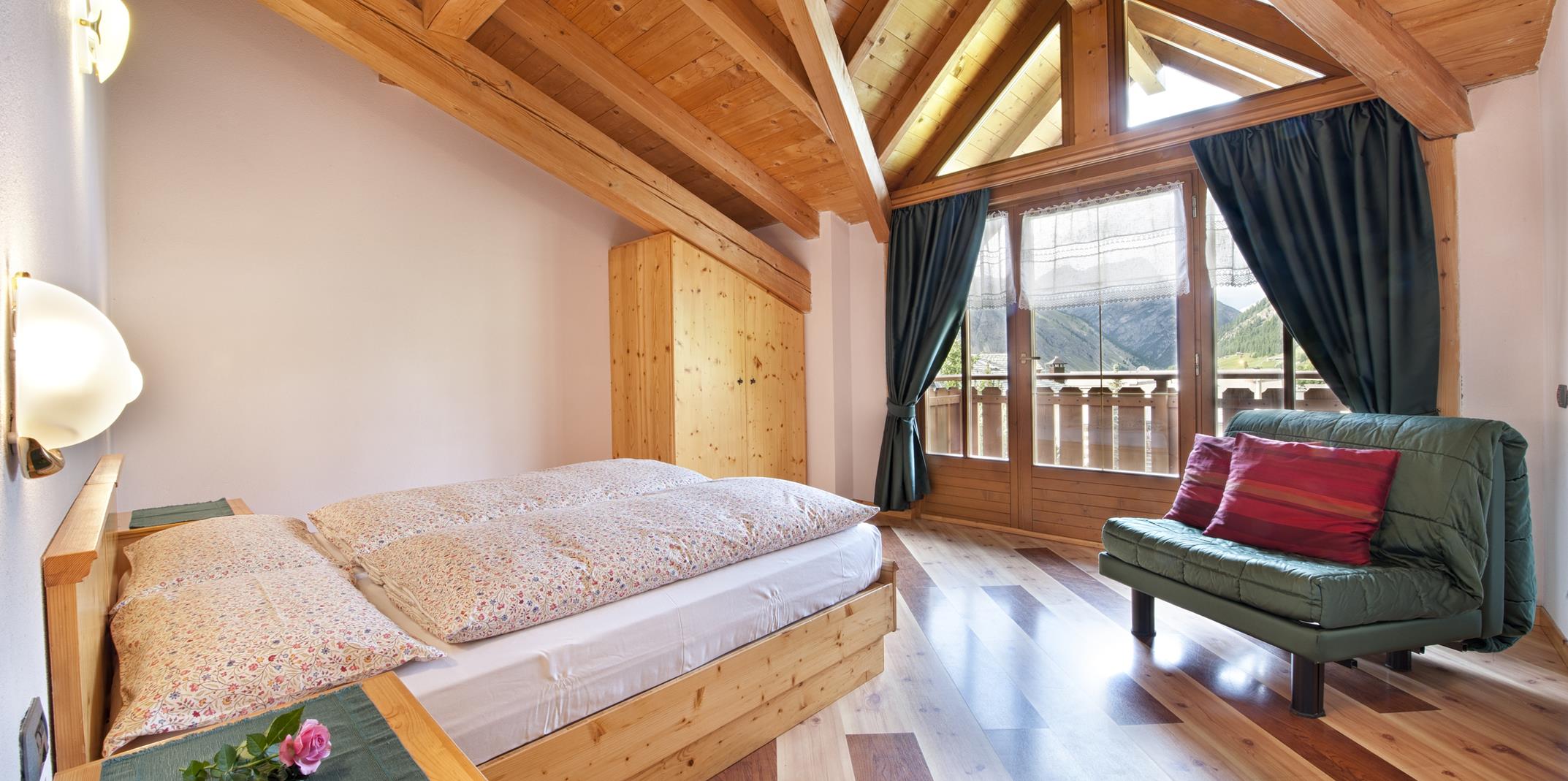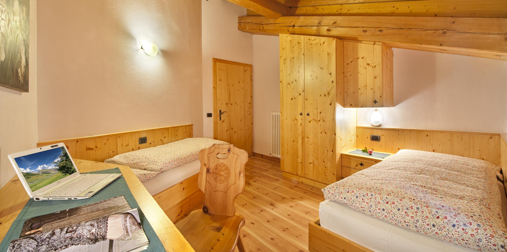 La stanza è munita di tutte le comodità e ammobiliata in tipico stile montano, con pavimenti in parquet e soffitto e arredi in legno massiccio: è ideale per le vostre vacanze in famiglia con gli amici.
