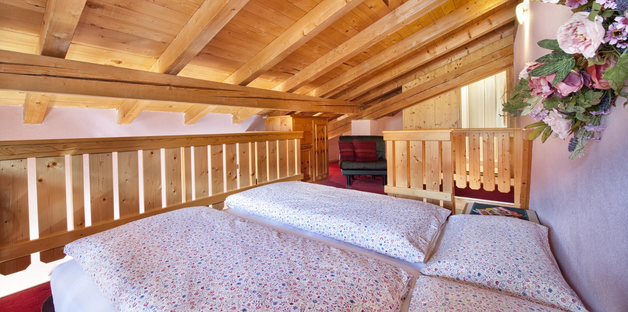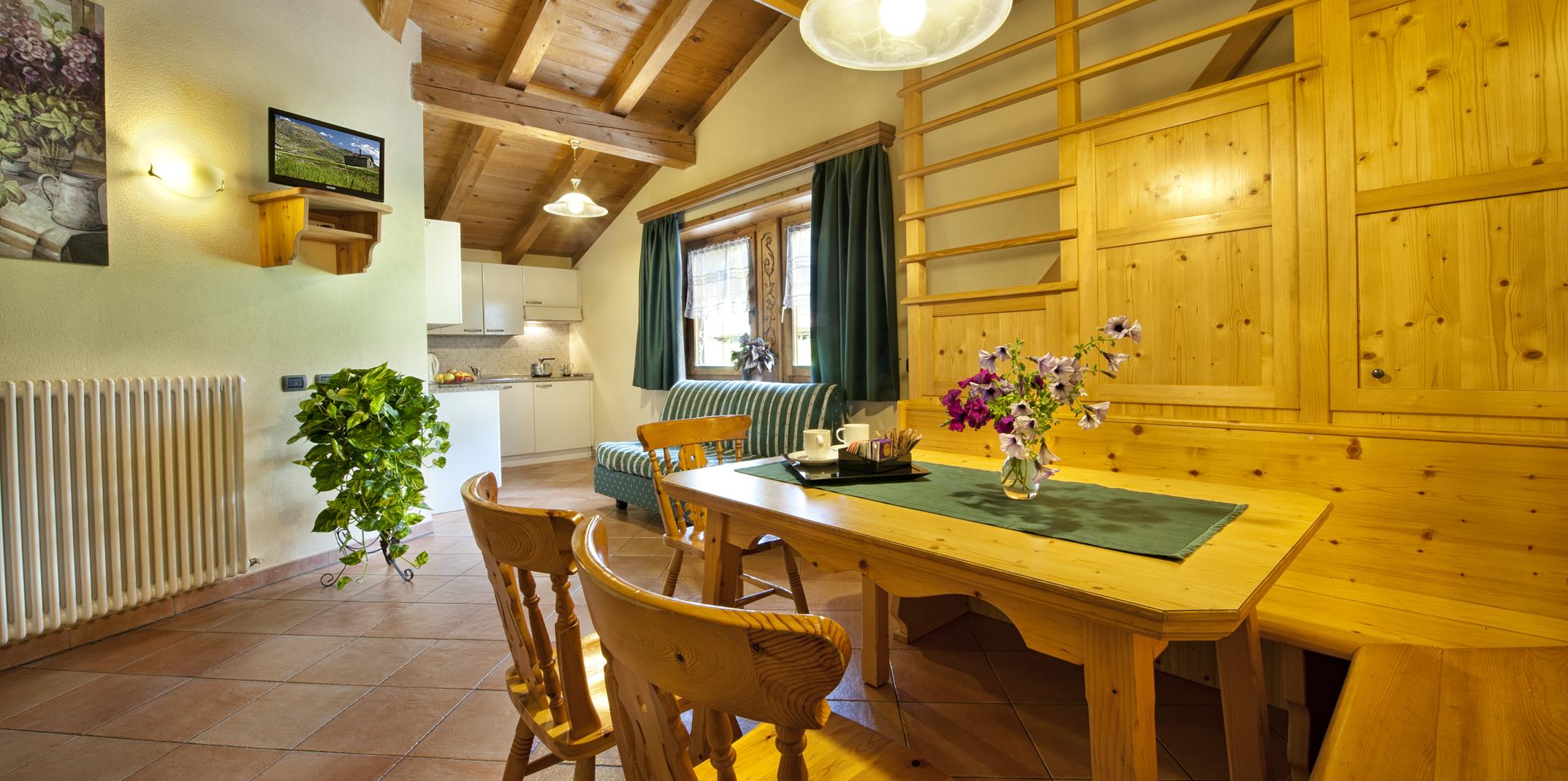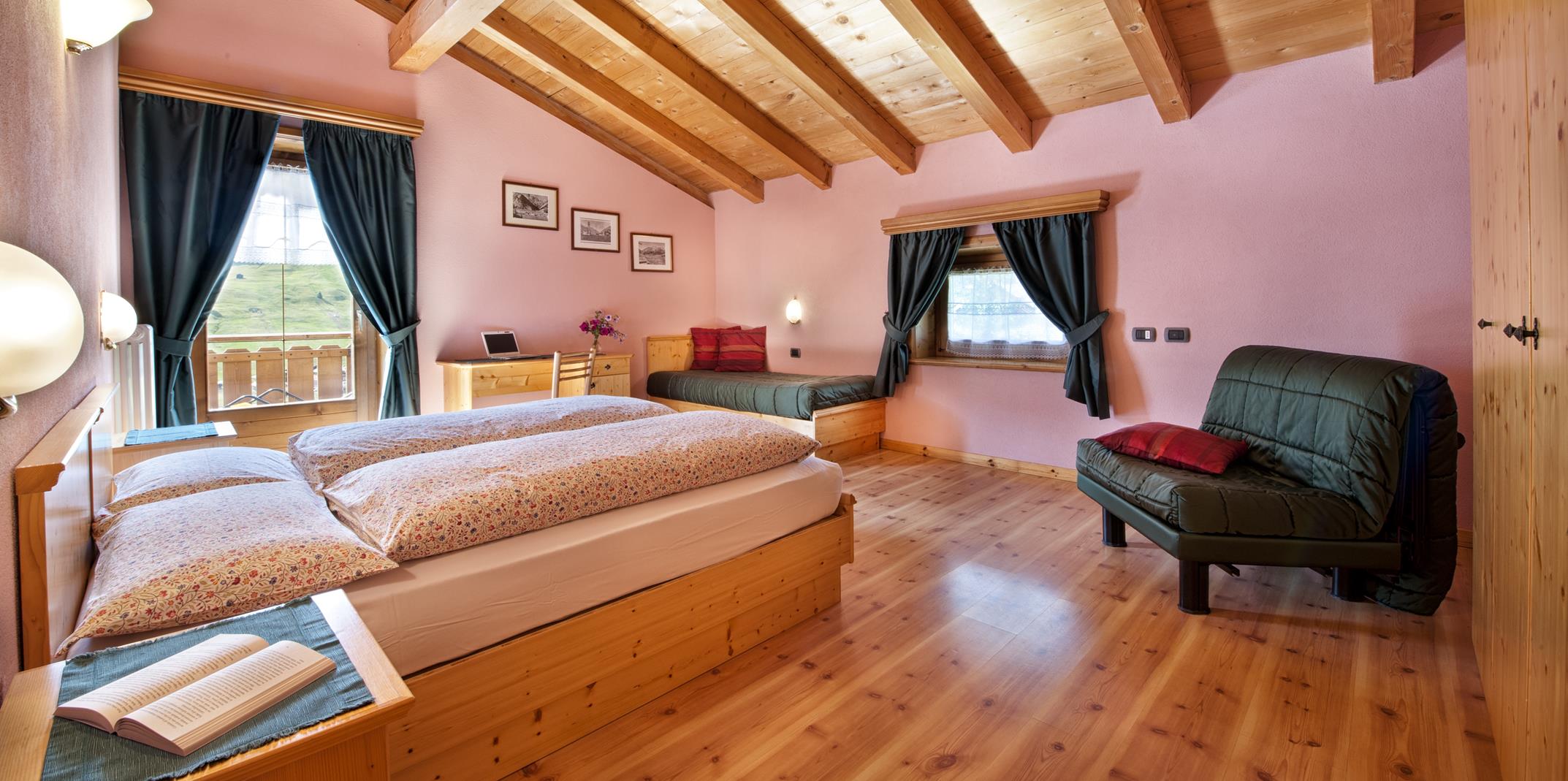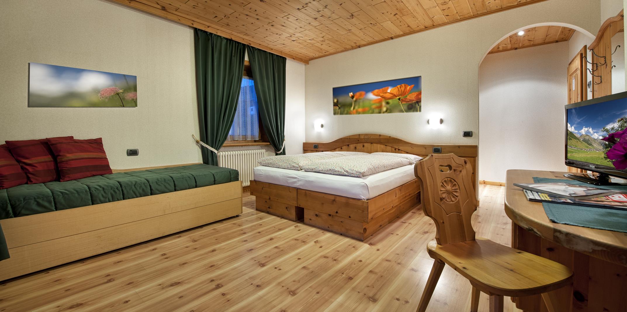 La stanza è munita di tutte le comodità e ammobiliata in tipico stile montano, con pavimenti in parquet e soffitto e arredi in legno massiccio: è ideale per le vostre vacanze in famiglia con gli amici.