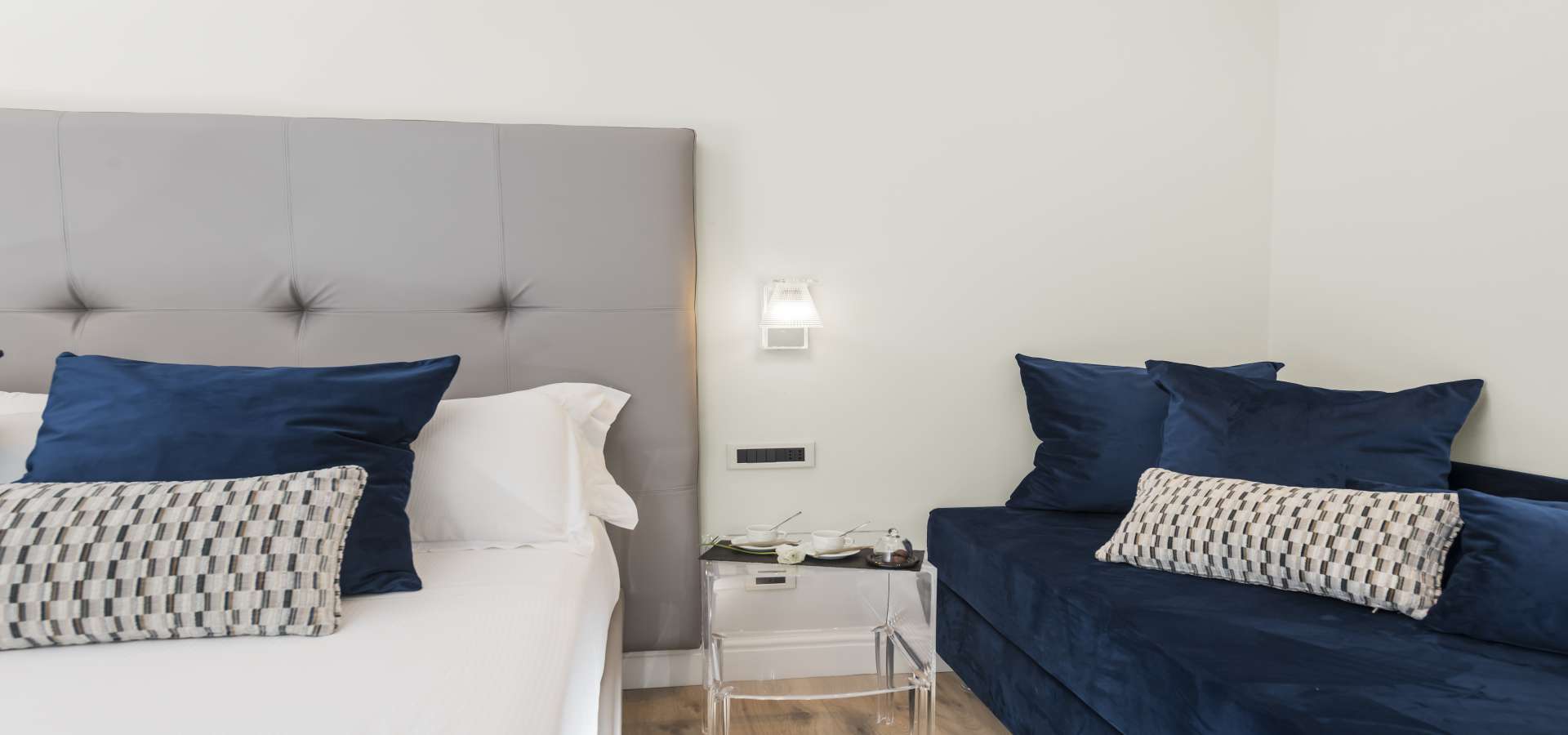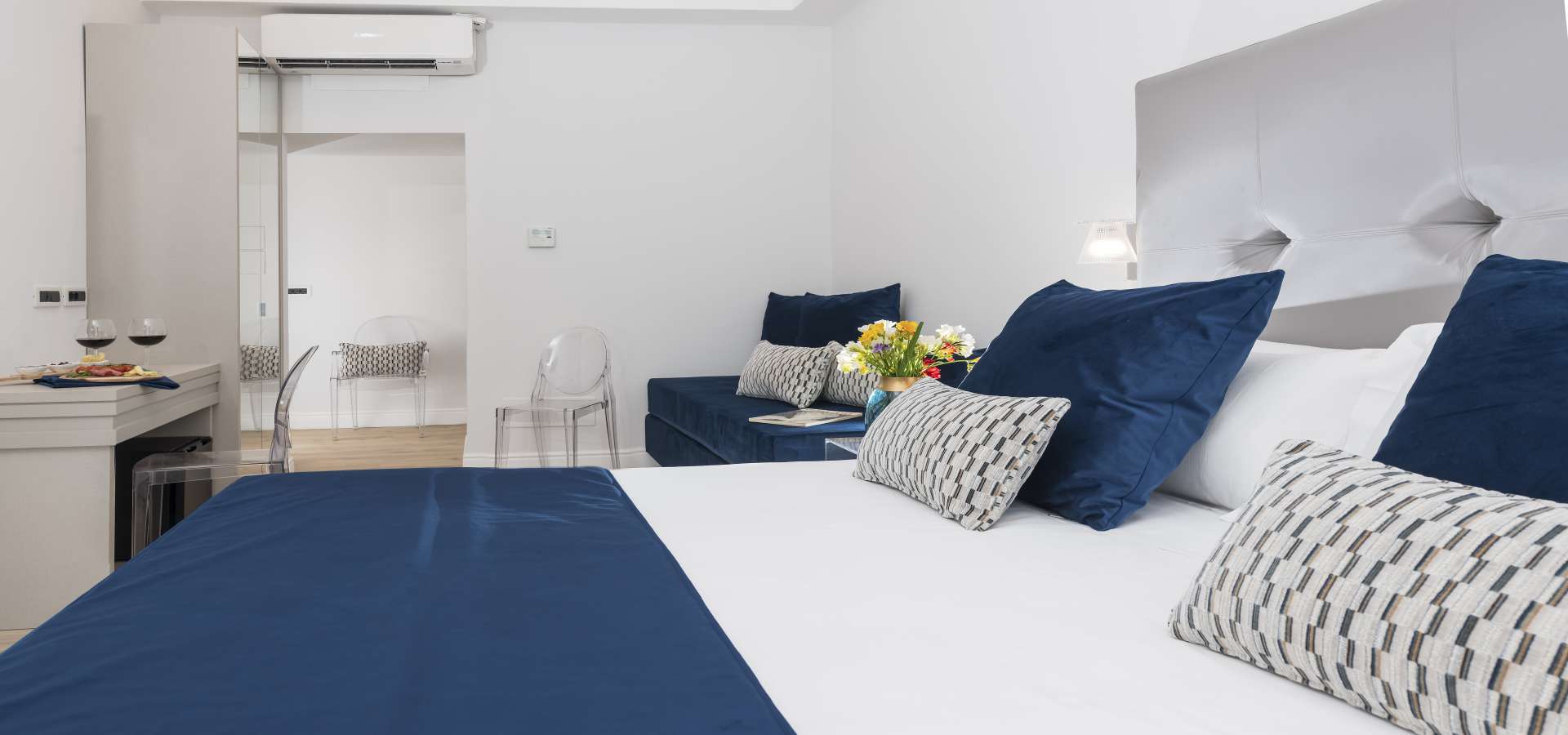 La chambre Deluxe est le choix idéal pour un séjour jusqu’à 3 personnes, étant équipée d’un lit double et d’un canapé-lit, d’une salle de bain en marbre avec grande douche et de produits naturels pour les soins du corps.