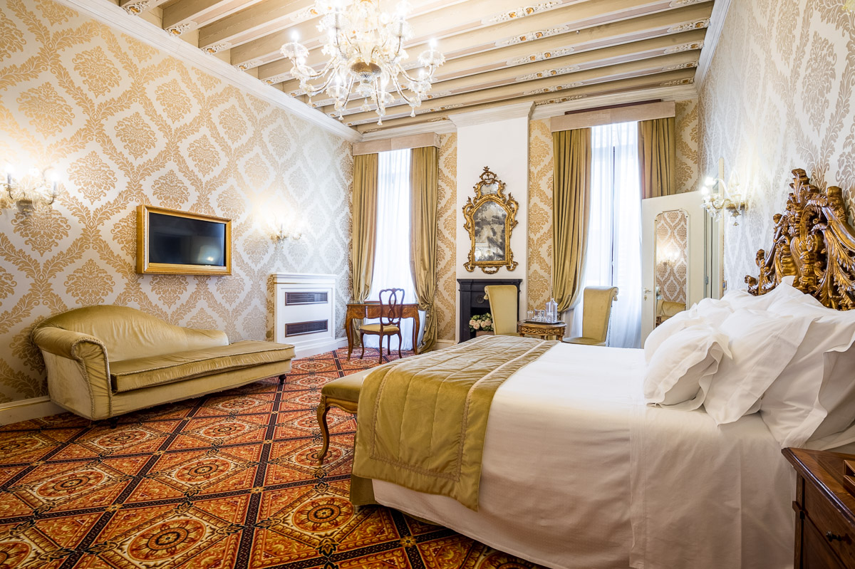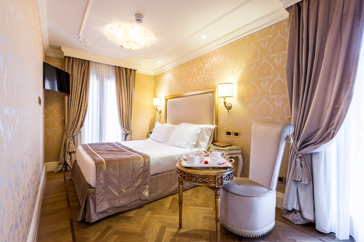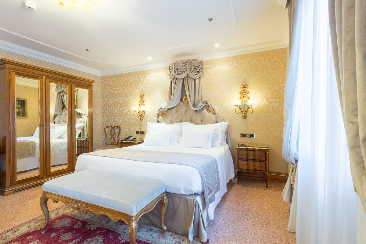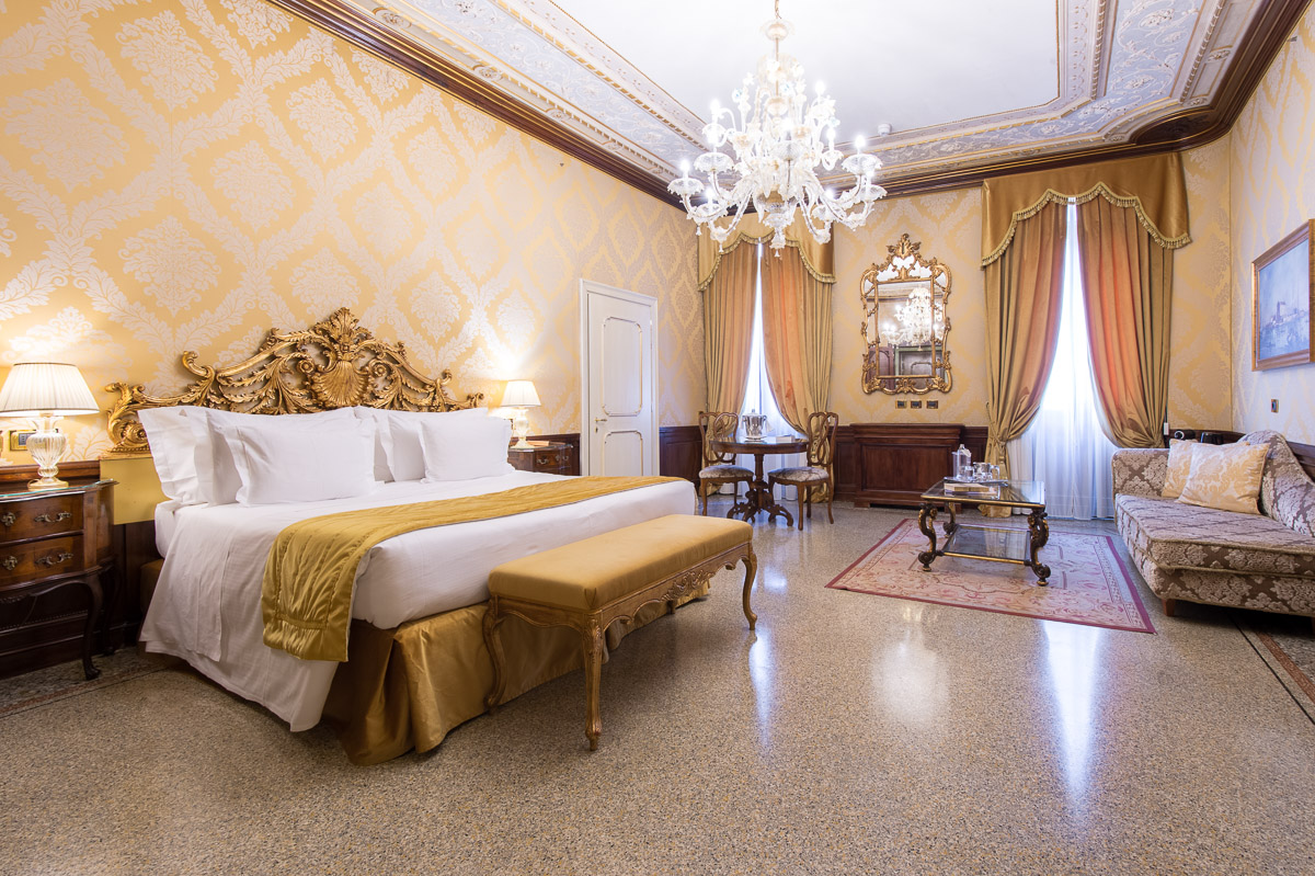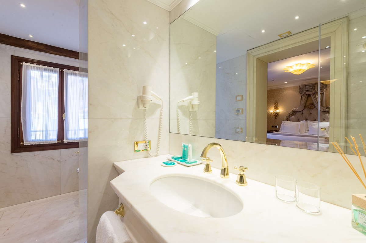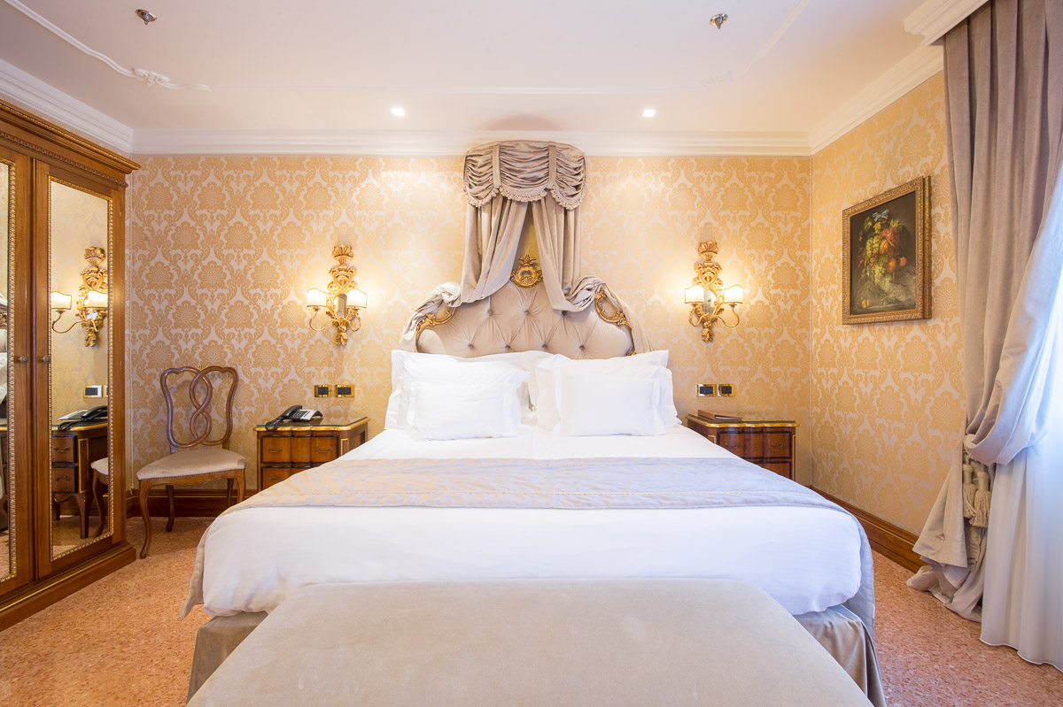 Our Superior rooms of about 20 Sqm have a high level of comfort. They are all furnished in warmVenetian style with antique textile on the walls, ancient wooden flooring or the typical “Venetian terrace”,which can be found in the most elegant aristocratic palaces. All rooms are equipped with a mini-bar, laptop-size safe, direct phone line, Internet, state-of-the-art flat screen TV, wireless connection. All polychrome marble bathrooms are equipped with shower or bathtub