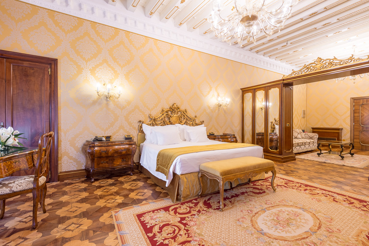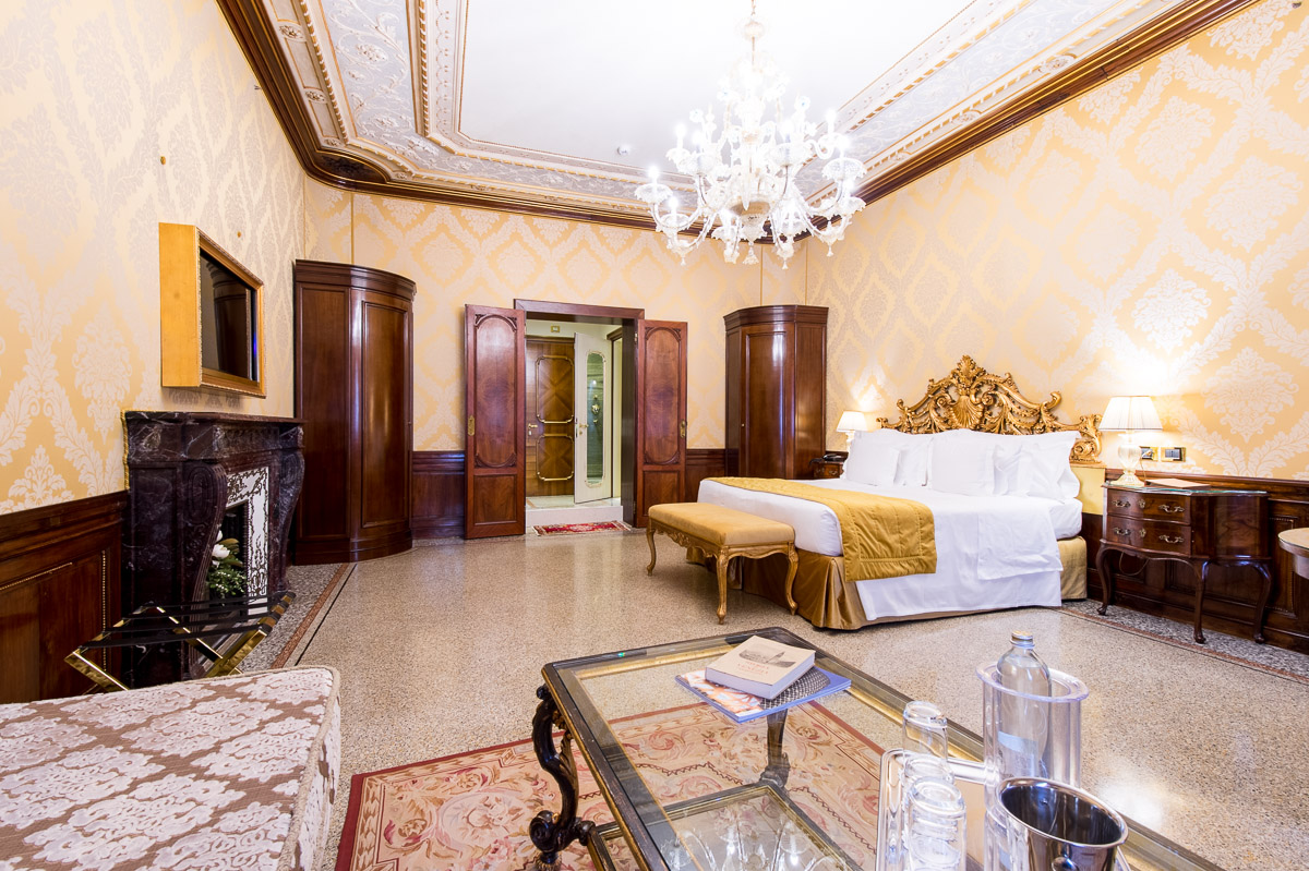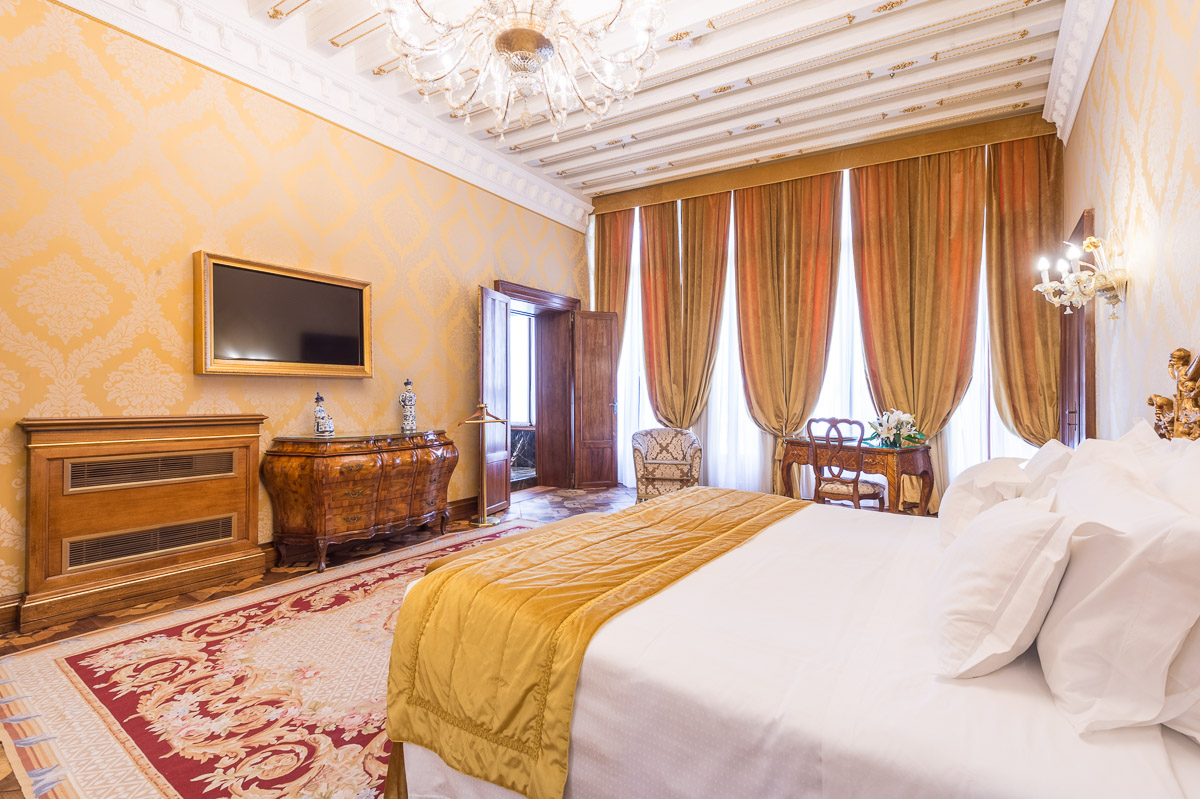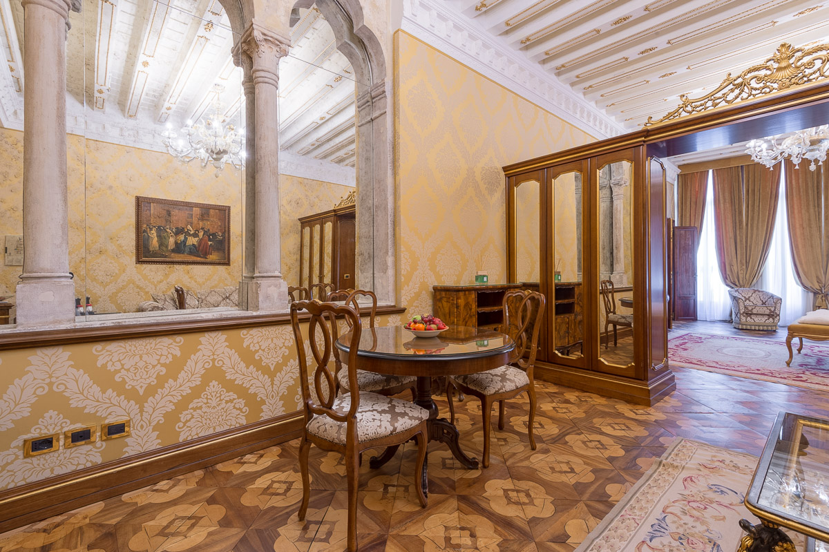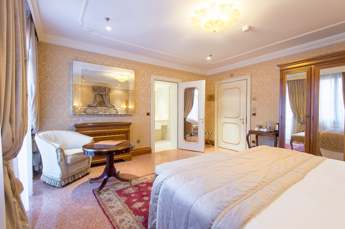 Our Junior Suite rooms are quite generous in size – each one has about a 40 Sqm surface – and they are furnished in sumptuous historical Venetian style. Many of them also have a small fireplace dating back to late 1600, entirely refurbished ancient wooden flooring or the typical “Venetian terrace”, which can be found in the most elegant aristocratic palaces. All rooms are equipped with a desk,mini-bar, laptop-size safe, direct phone line, Internet, state-of-the-art flat screen TV, wireless connection. All polychrome marble bathrooms are equipped with shower or bathtub. All our Junior Suiterooms overlook a quiet canal.