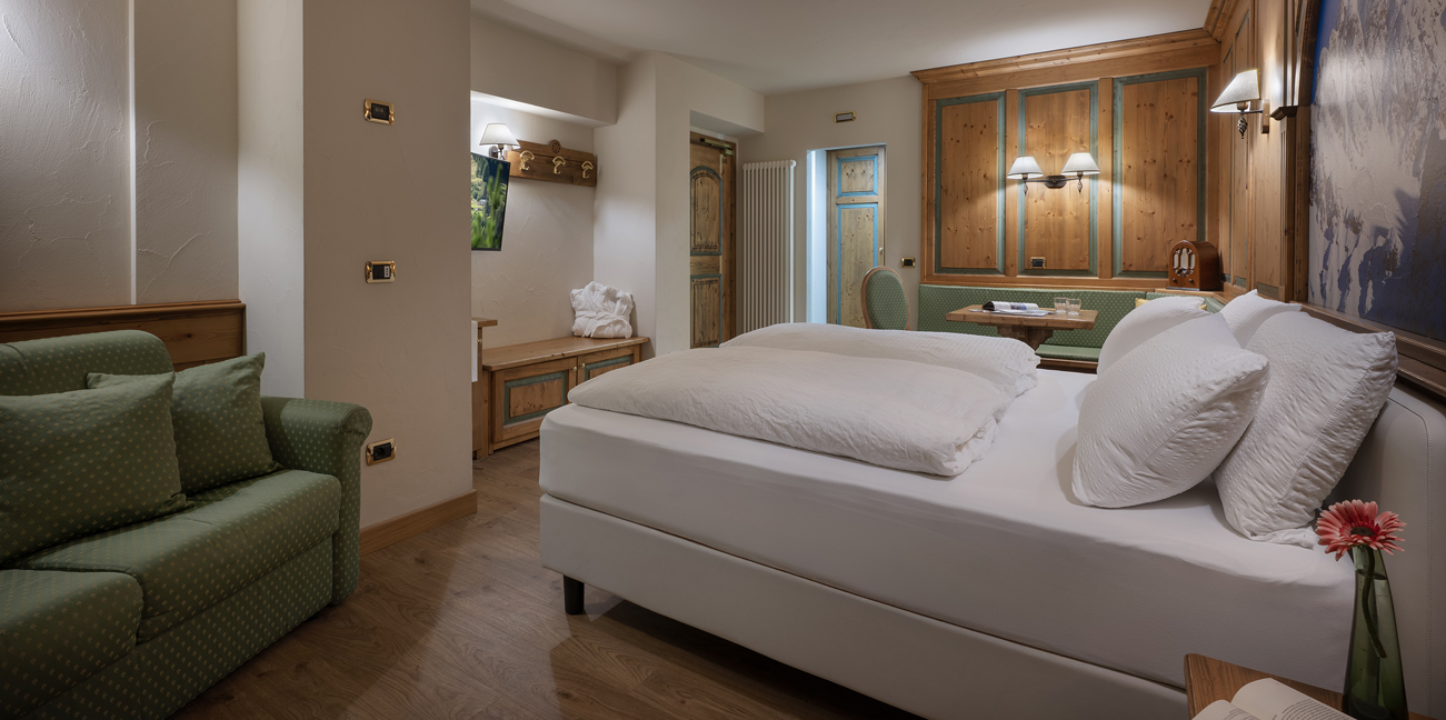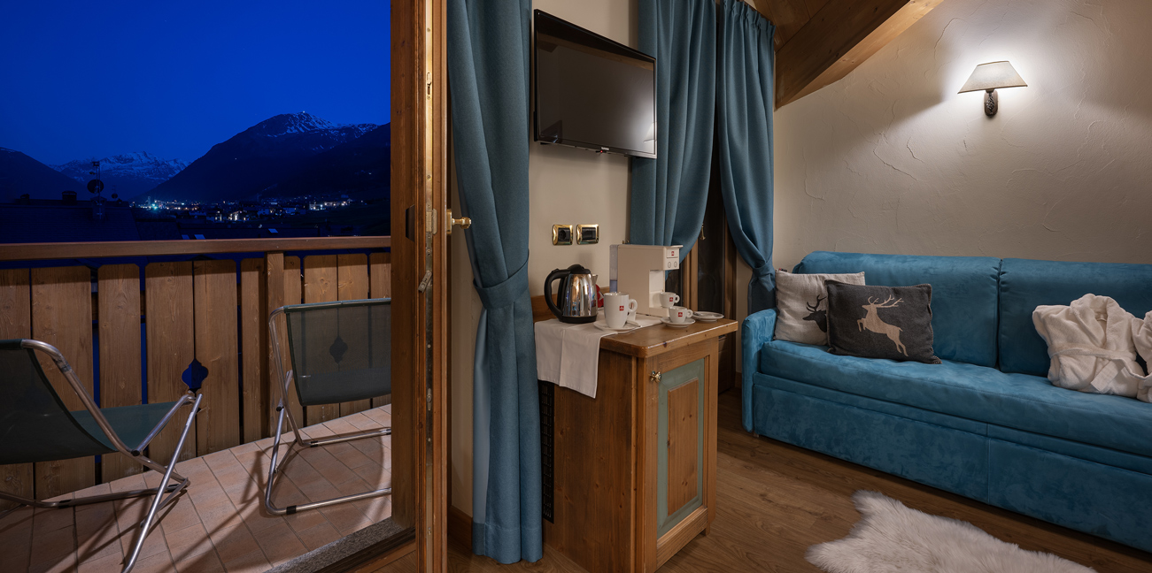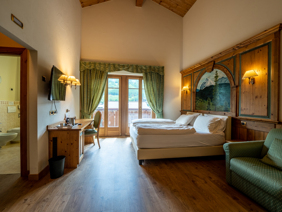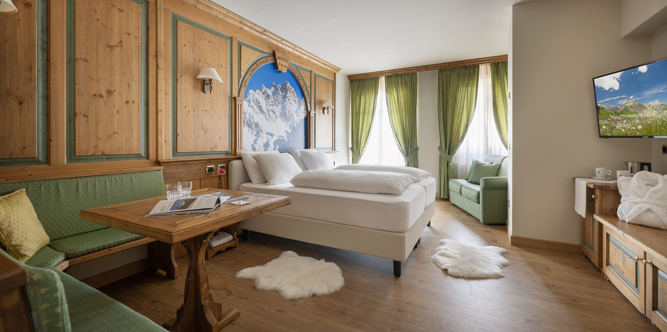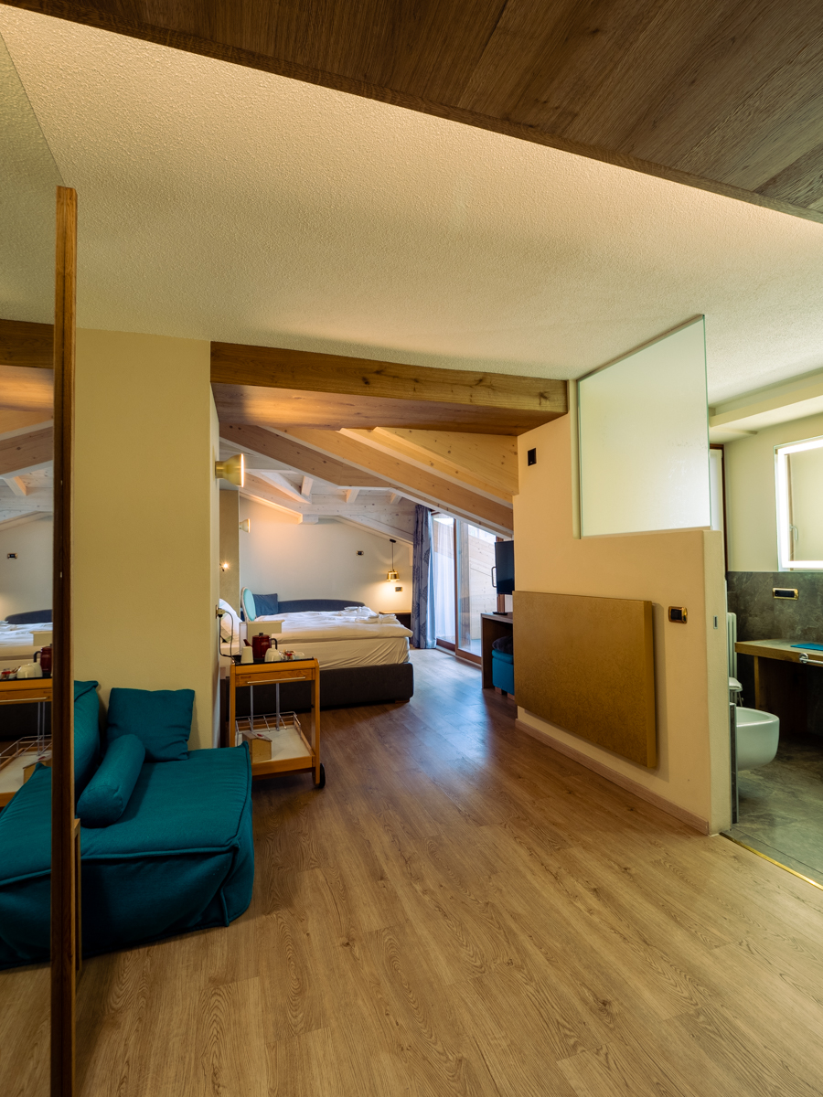 Ampia camera di mq 40 con arredo moderno in legno di rovere massiccio, tessuti di pregio, complementi illuminanti e riscaldanti di design. Letto matrimoniale sommier, divano (letto 80x200) e poltrona (letto 90x200). Balcone riscaldato con vista montagne. Bagno con cabina doccia walk-in e bagno turco integrato. Minibar, altoparlanti bluetooth, cassaforte, bollitore the e macchinetta per espresso.