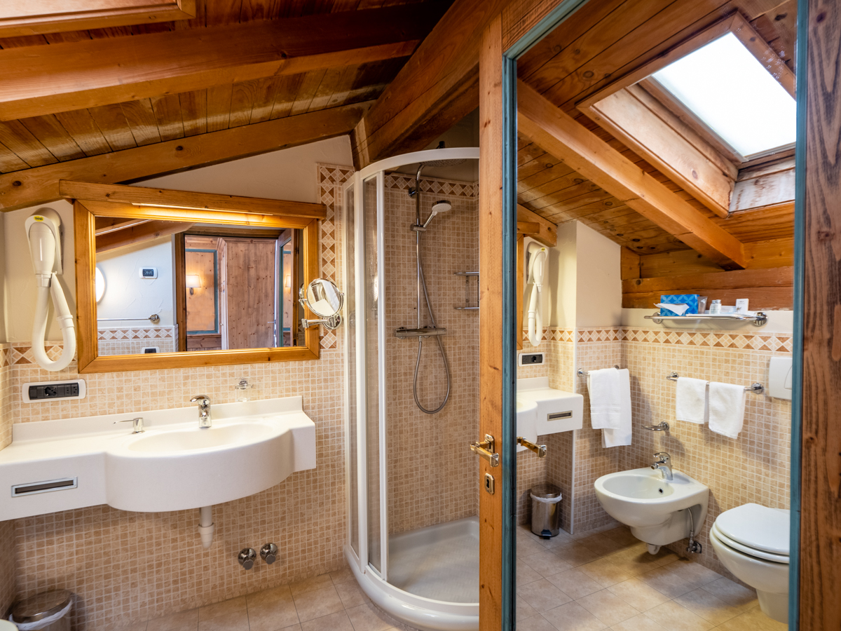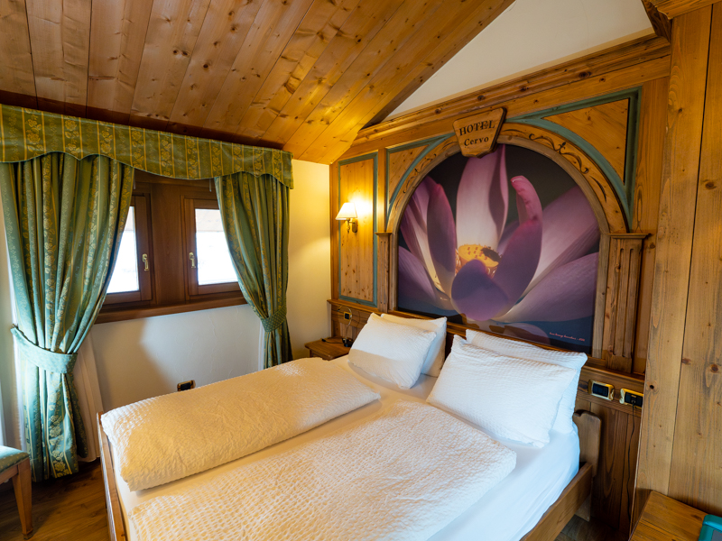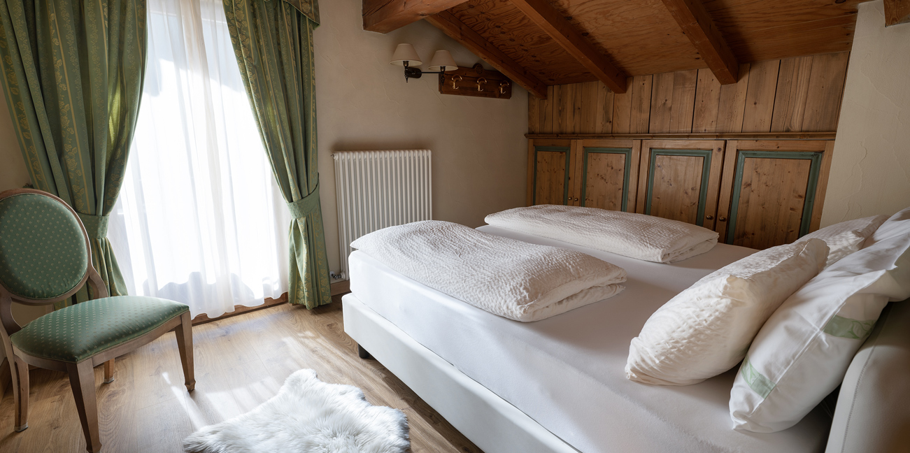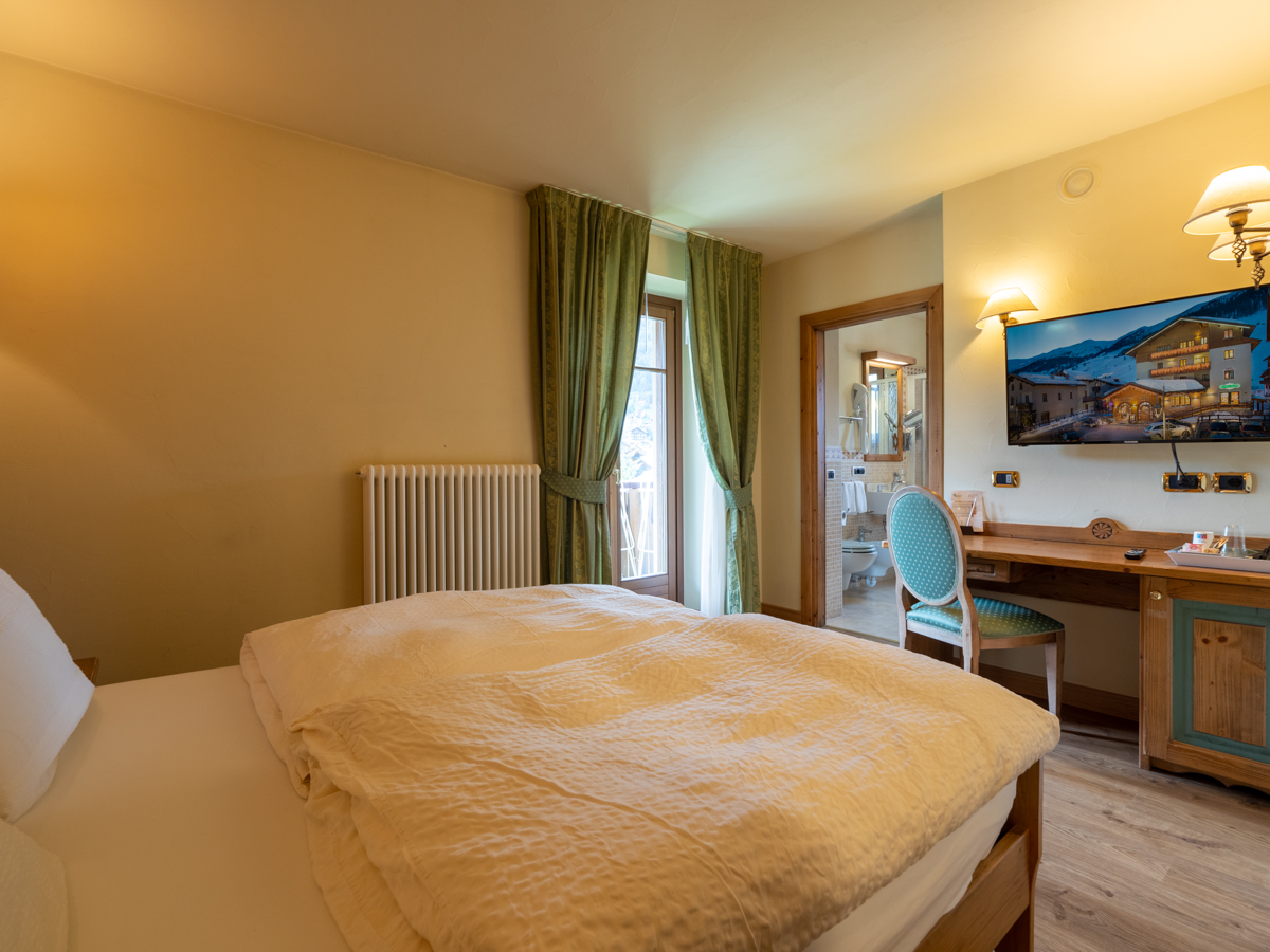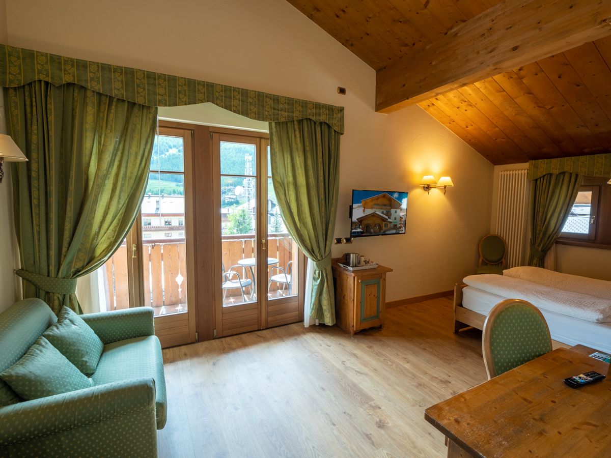 Ampia camera di mq 40 con arredo moderno in legno di rovere massiccio, tessuti di pregio, complementi illuminanti e riscaldanti di design. Letto matrimoniale sommier, divano (letto 80x200) e poltrona (letto 90x200). Balcone riscaldato con vista montagne. Bagno con cabina doccia walk-in e bagno turco integrato. Minibar, altoparlanti bluetooth, cassaforte, bollitore the e macchinetta per espresso.