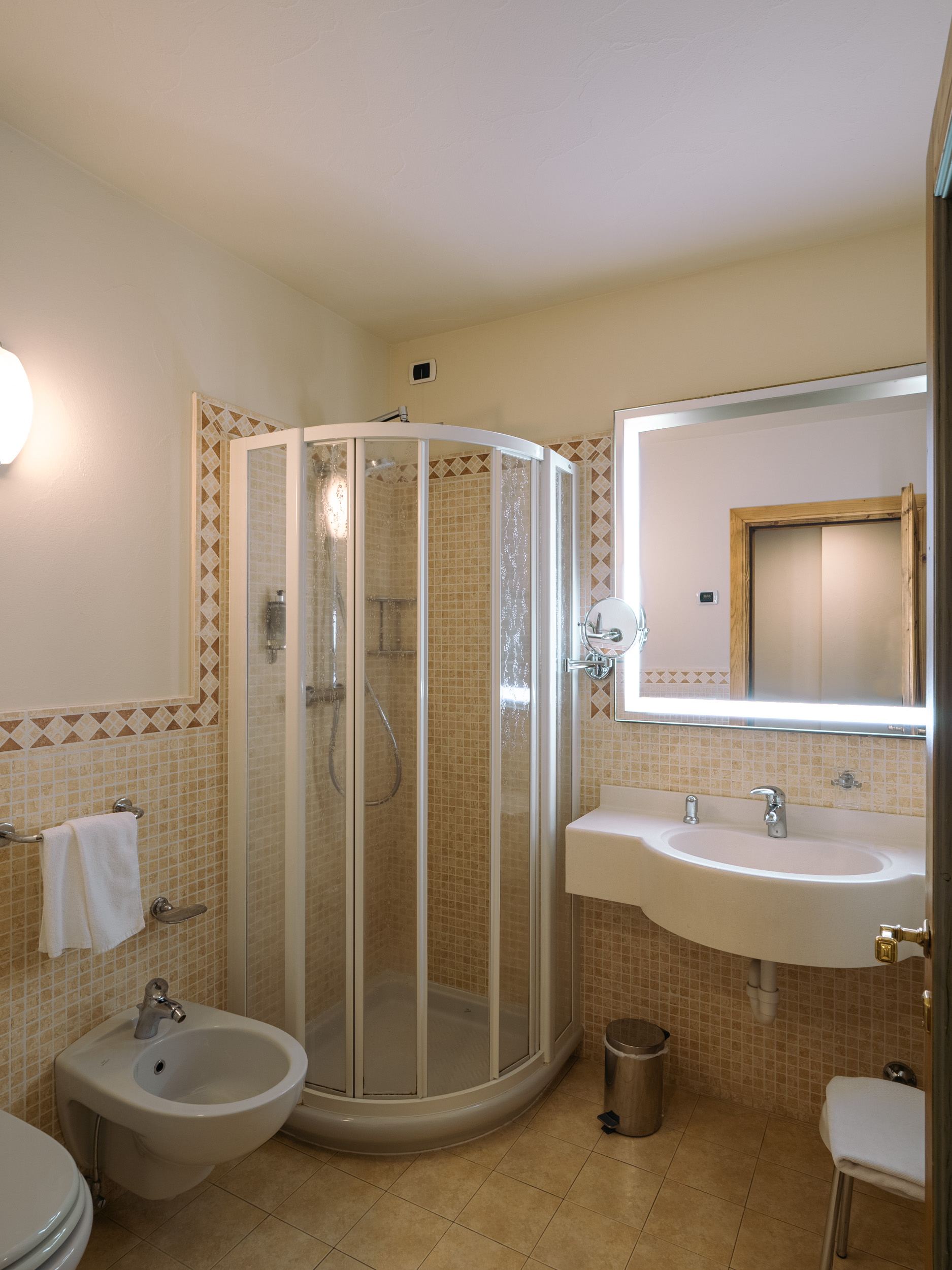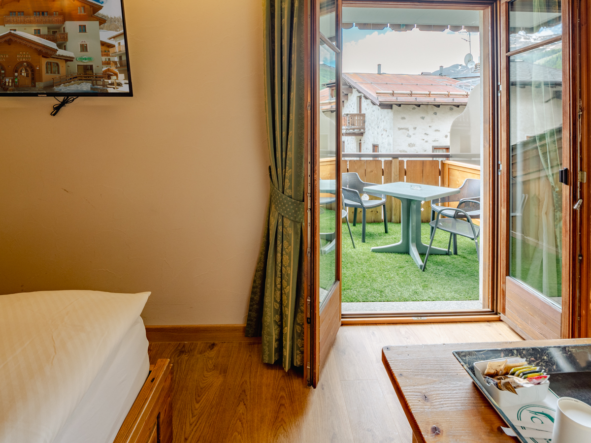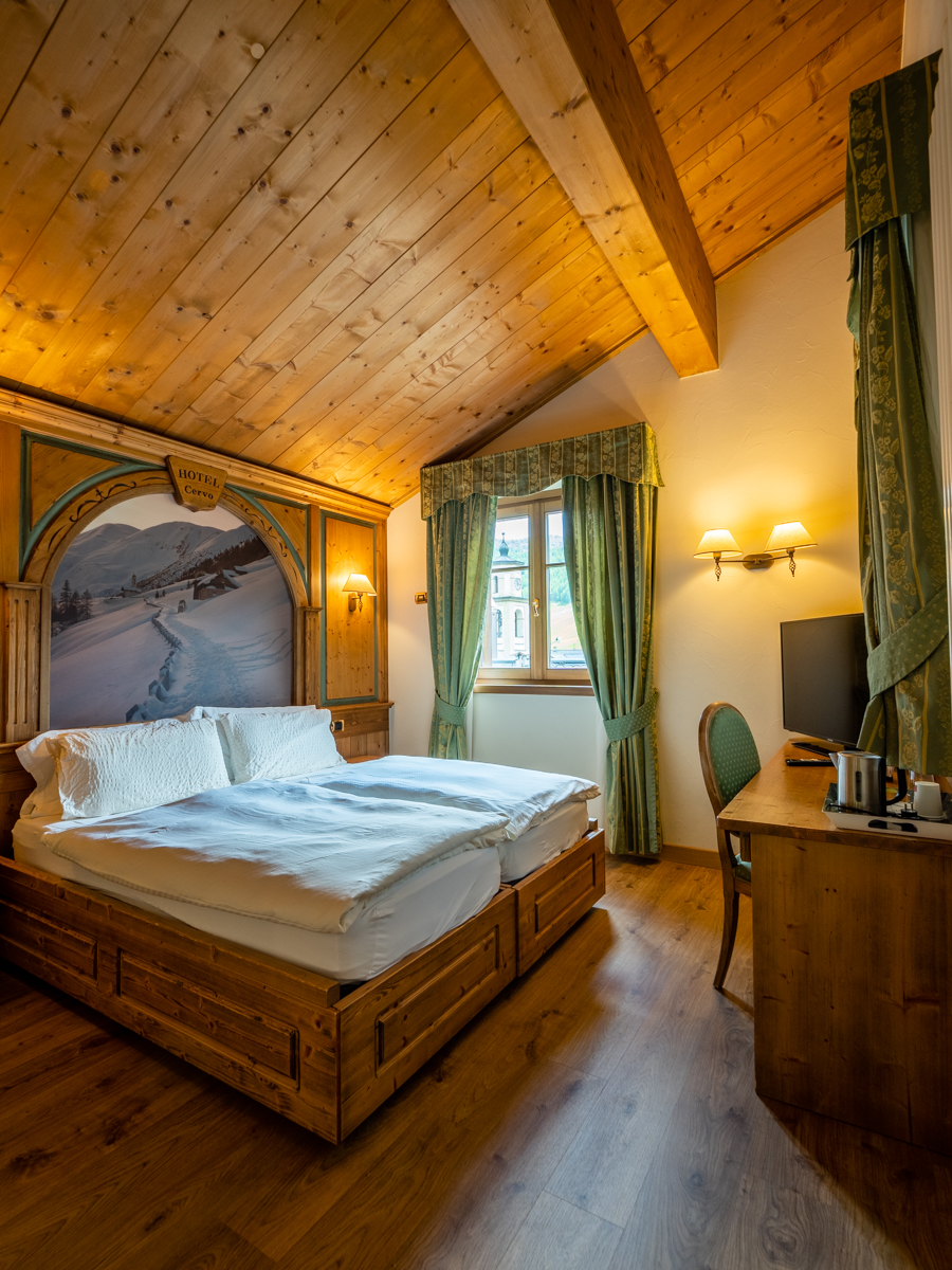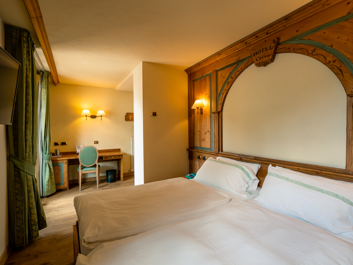 Ampia camera di mq 40 con arredo moderno in legno di rovere massiccio, tessuti di pregio, complementi illuminanti e riscaldanti di design. Letto matrimoniale sommier, divano (letto 80x200) e poltrona (letto 90x200). Balcone riscaldato con vista montagne. Bagno con cabina doccia walk-in e bagno turco integrato. Minibar, altoparlanti bluetooth, cassaforte, bollitore the e macchinetta per espresso.