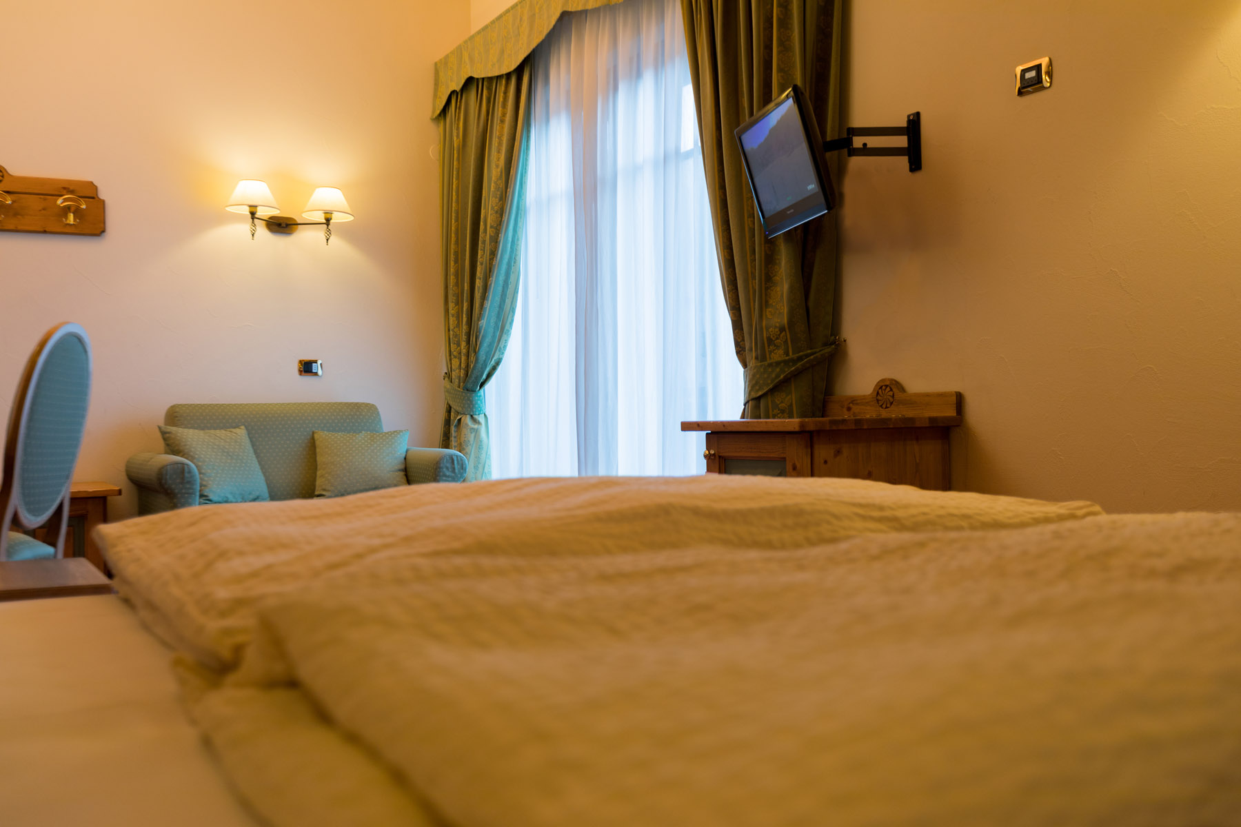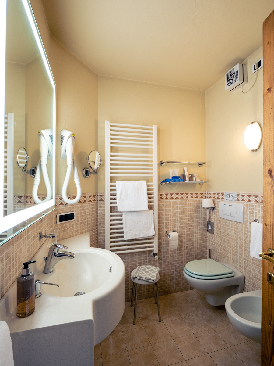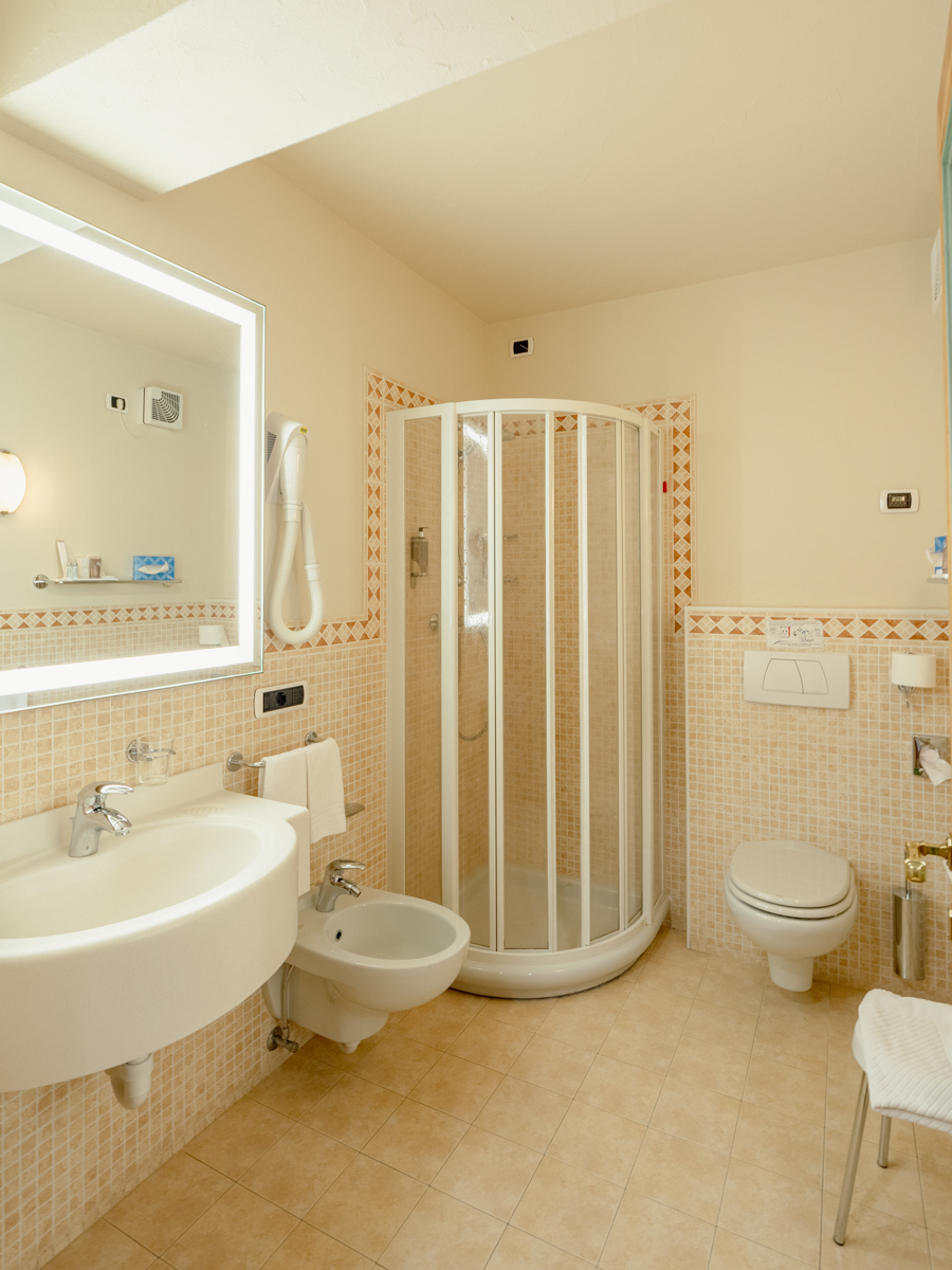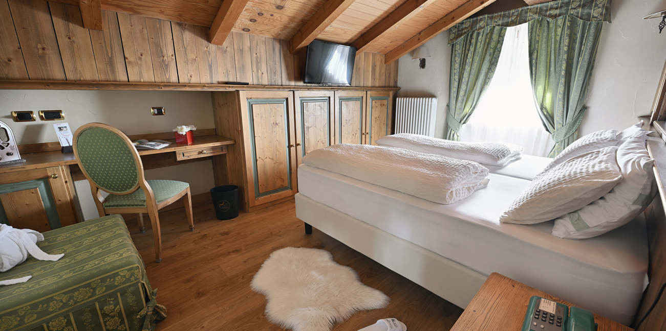 Ampia camera doppia o matrimoniale, letti sommier, mq 28. Preparazione con piumini danesi e doppi cuscini, divano (letto 120x 200). Ideale per famiglia con 2 bimbi piccoli o 3 adulti. Balcone, TV 40', bollitore the, minibar, wi-fi, cassaforte. Bagno con doccia, specchio ingranditore, phon.