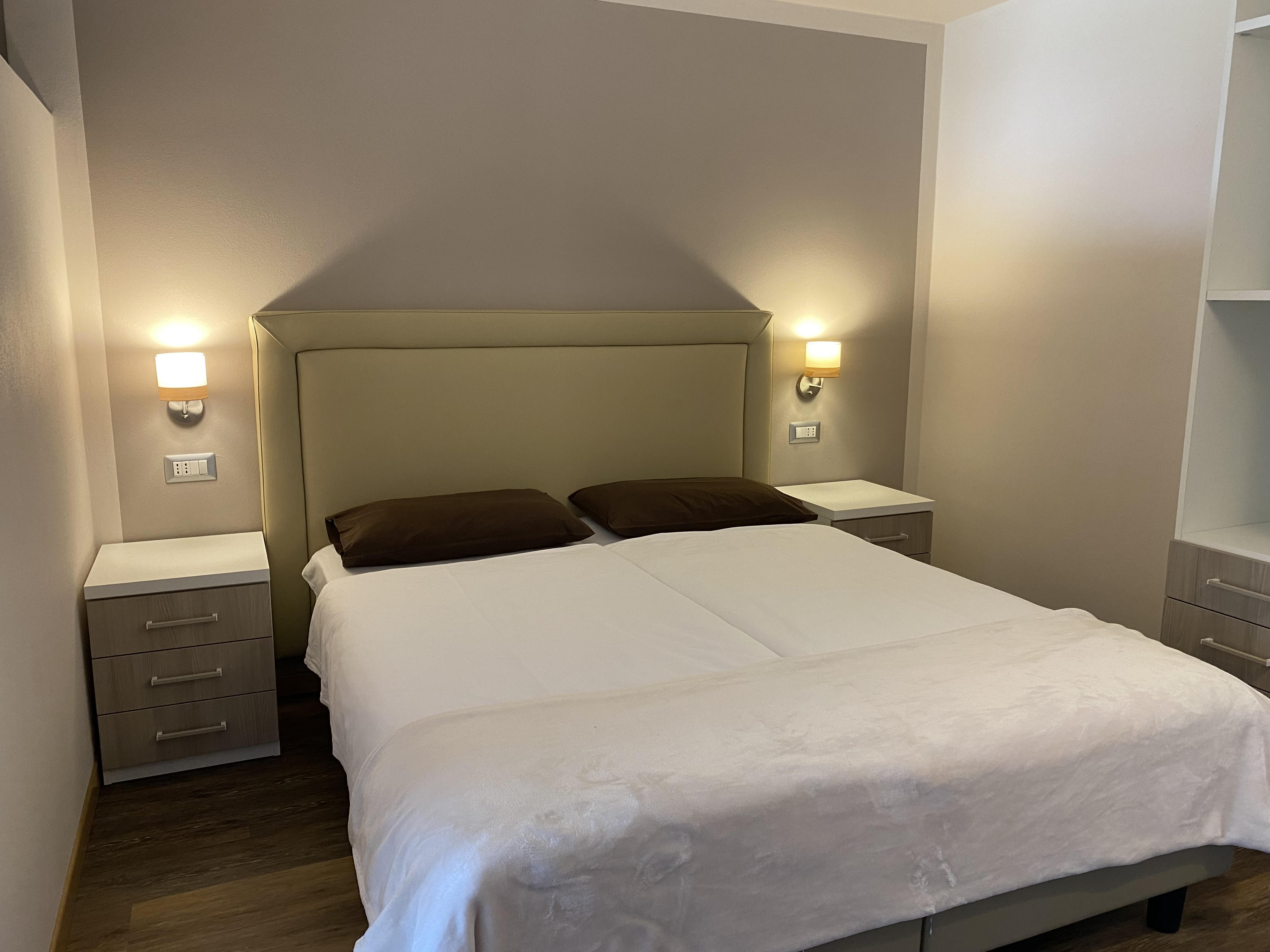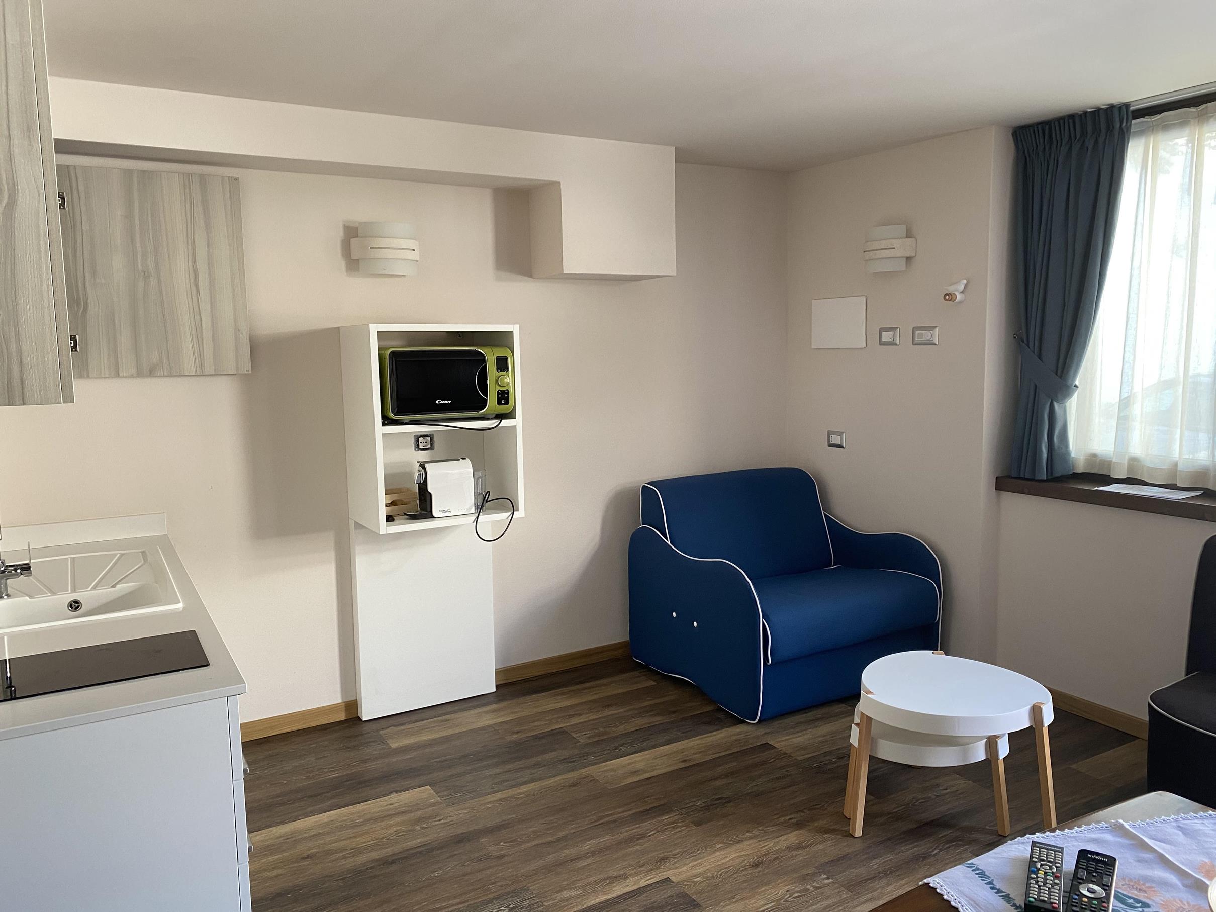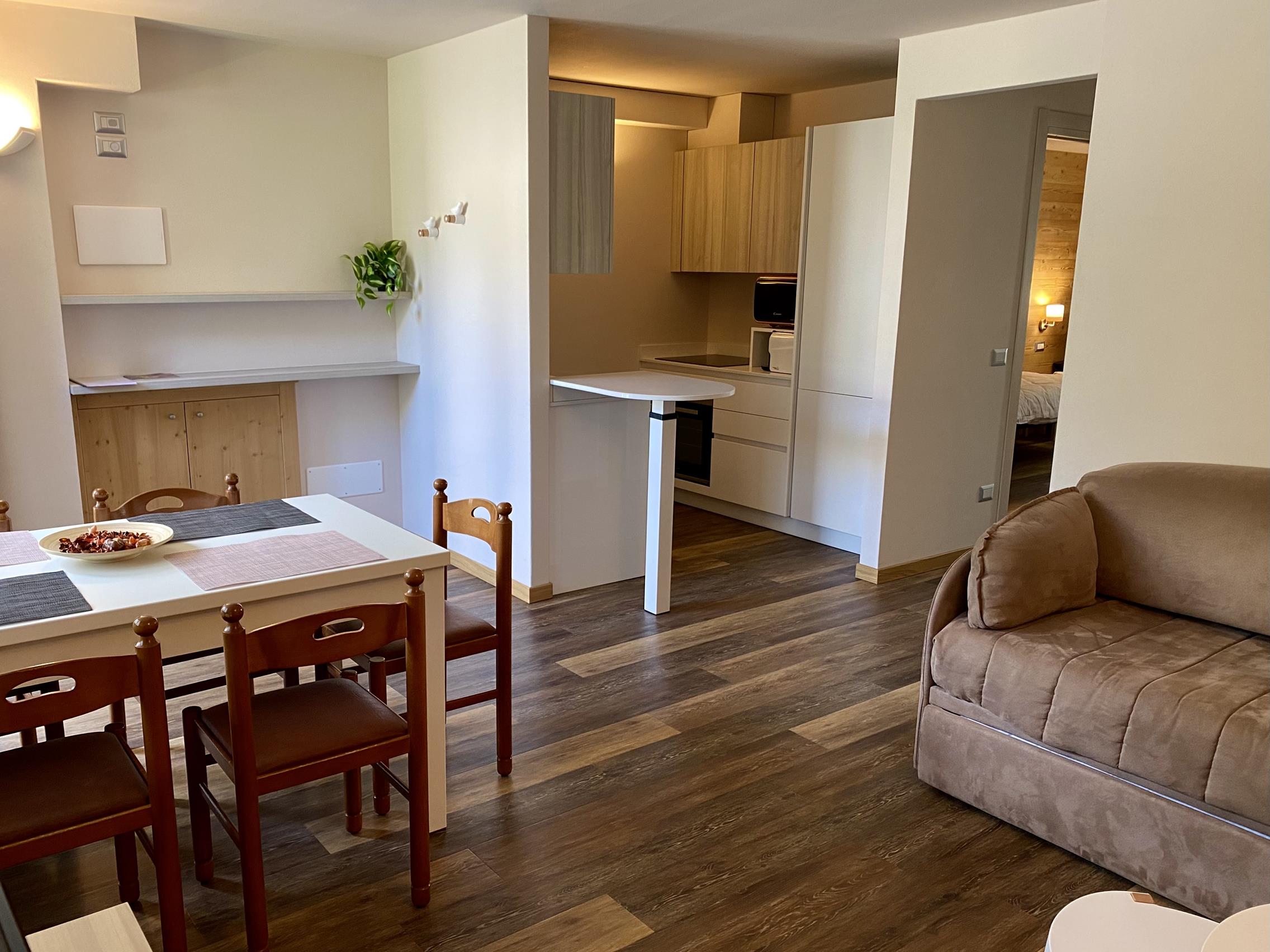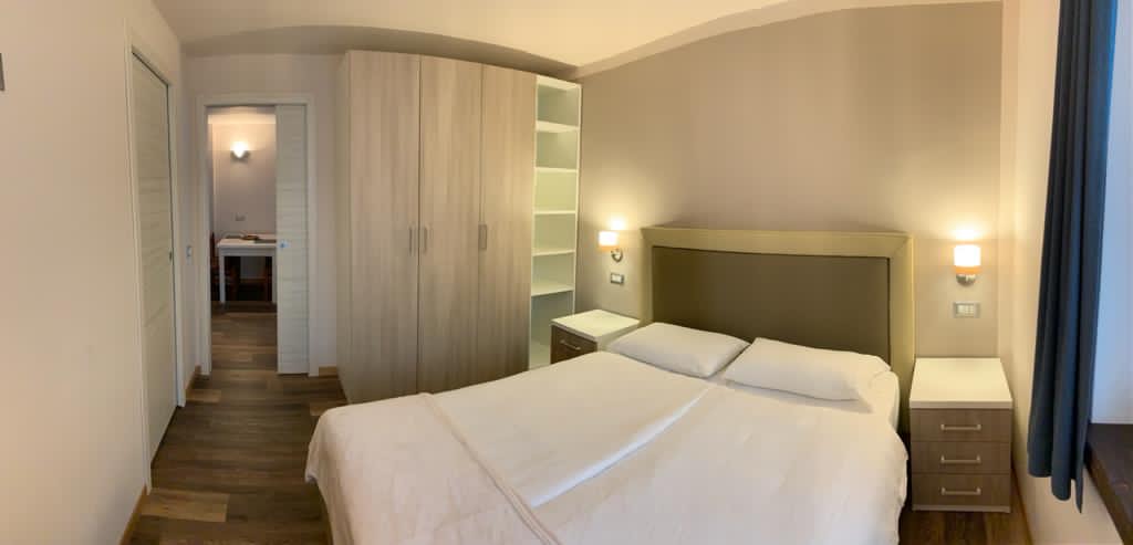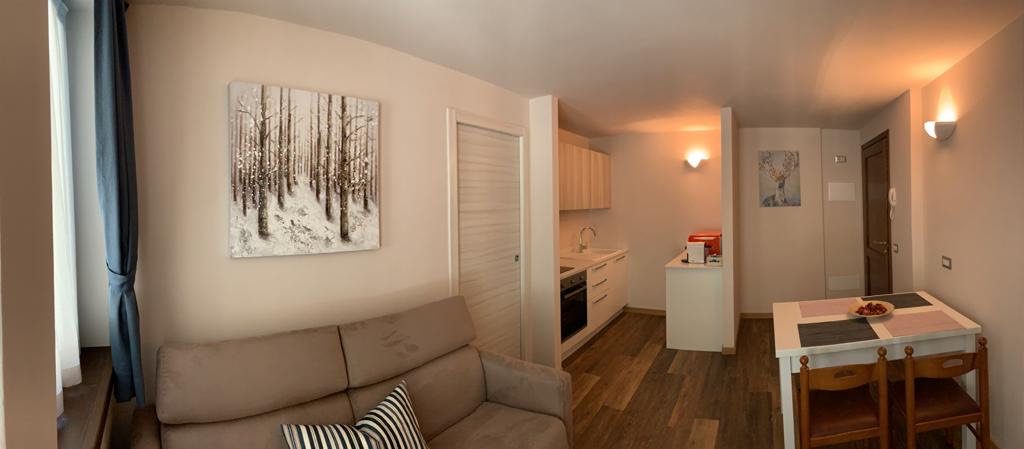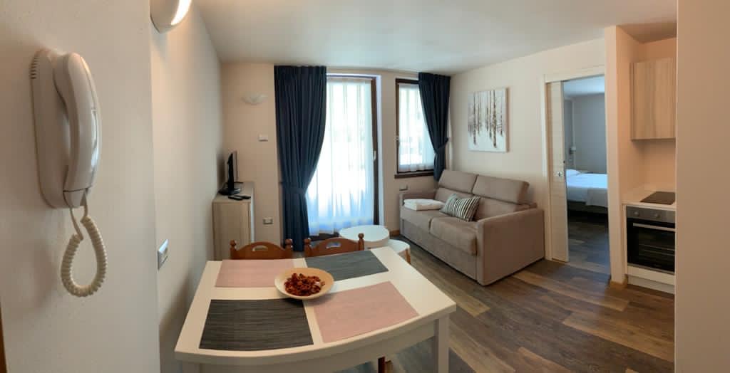 E' composto da ingresso, soggiorno con cucina e zona pranzo e divano letto singolo, camera da letto doppia\matrimoniale, servizi con doccia, WC, bidet, asciugacapelli, set da bagno;