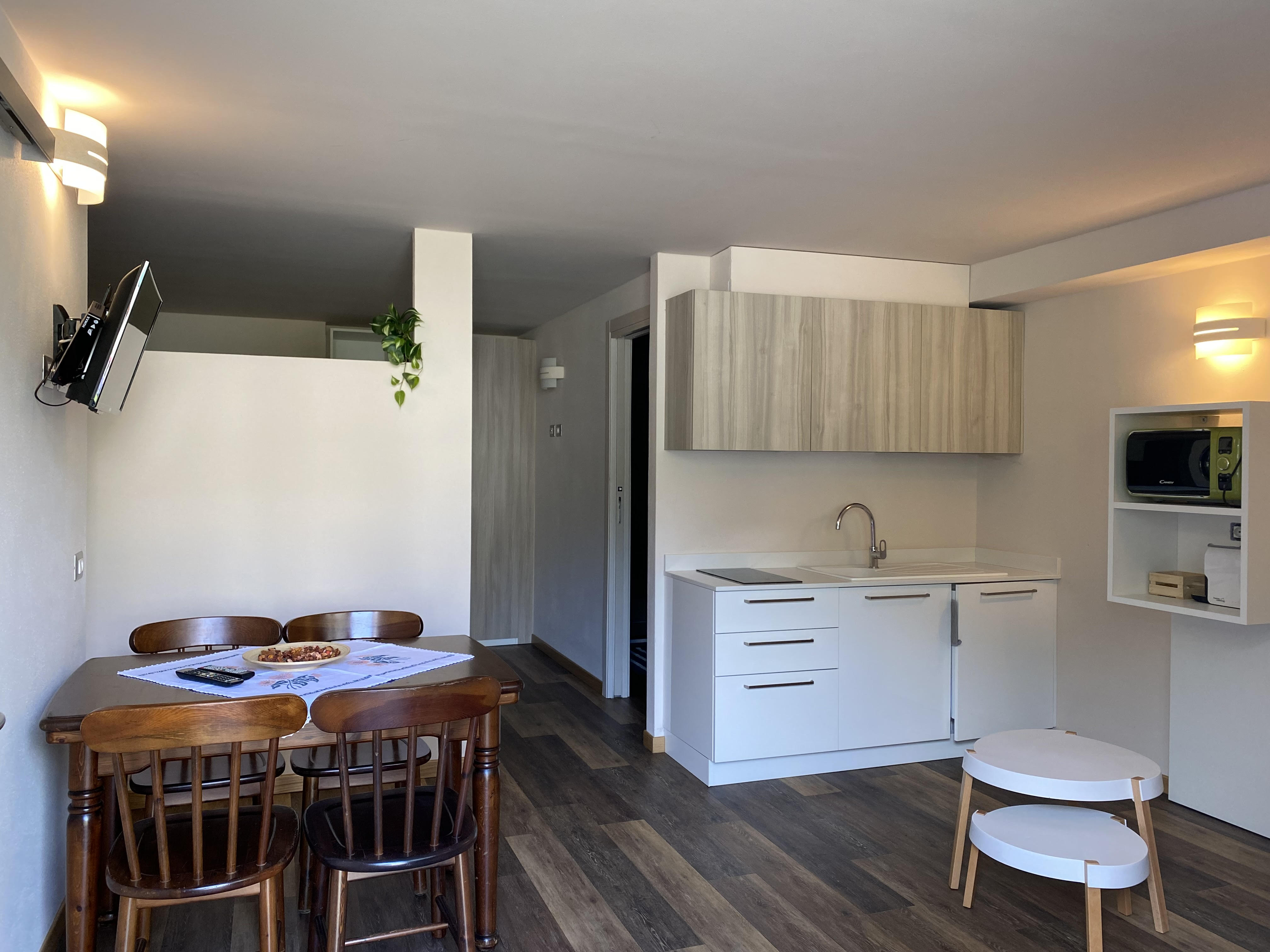 E' composto da ingresso, soggiorno con cucina e zona pranzo e divano letto matrimoniale, camera da letto doppia\matrimoniale, servizi con doccia, WC, bidet, asciugacapelli, set da bagno; Wi-Fi, TV a schermo piatto.