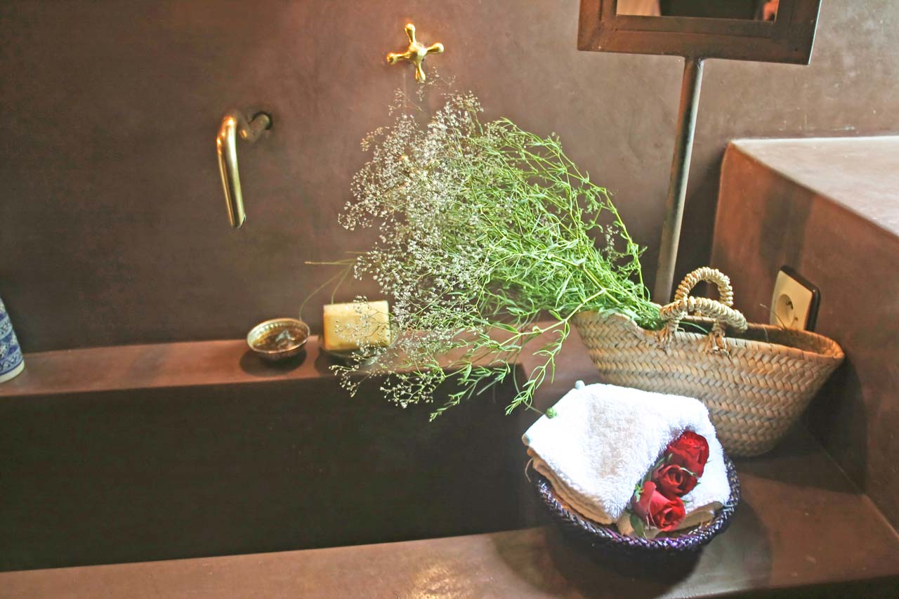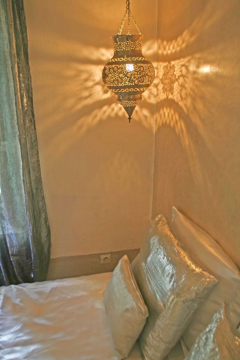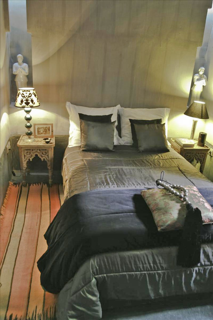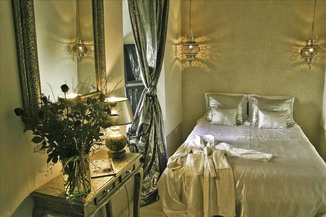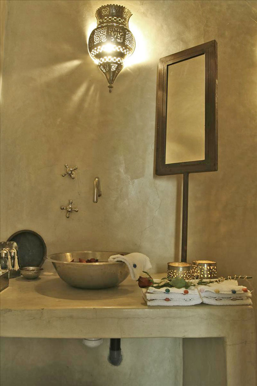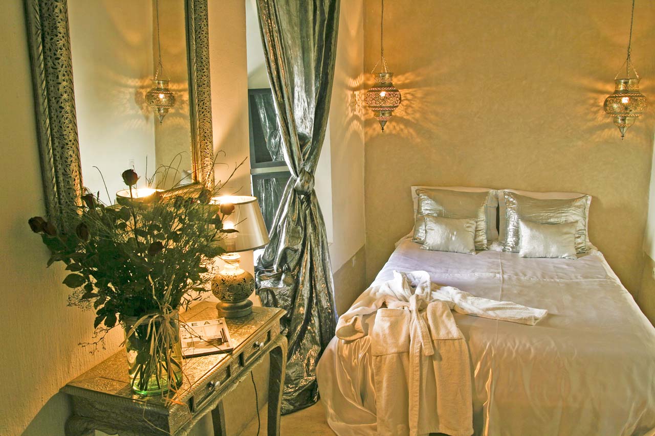 L'austerità e l'eleganza del grigio perla si unisce al calore degli oggetti in ottone. Preziosi caftani decorano i muri in calce lavorati a mano, tappeti berberi del deserto in mille sfumature rendono la Selim calda e avvolgente. Bagno in zellij di Féz e tadelakt sui toni bordeaux con vasca.