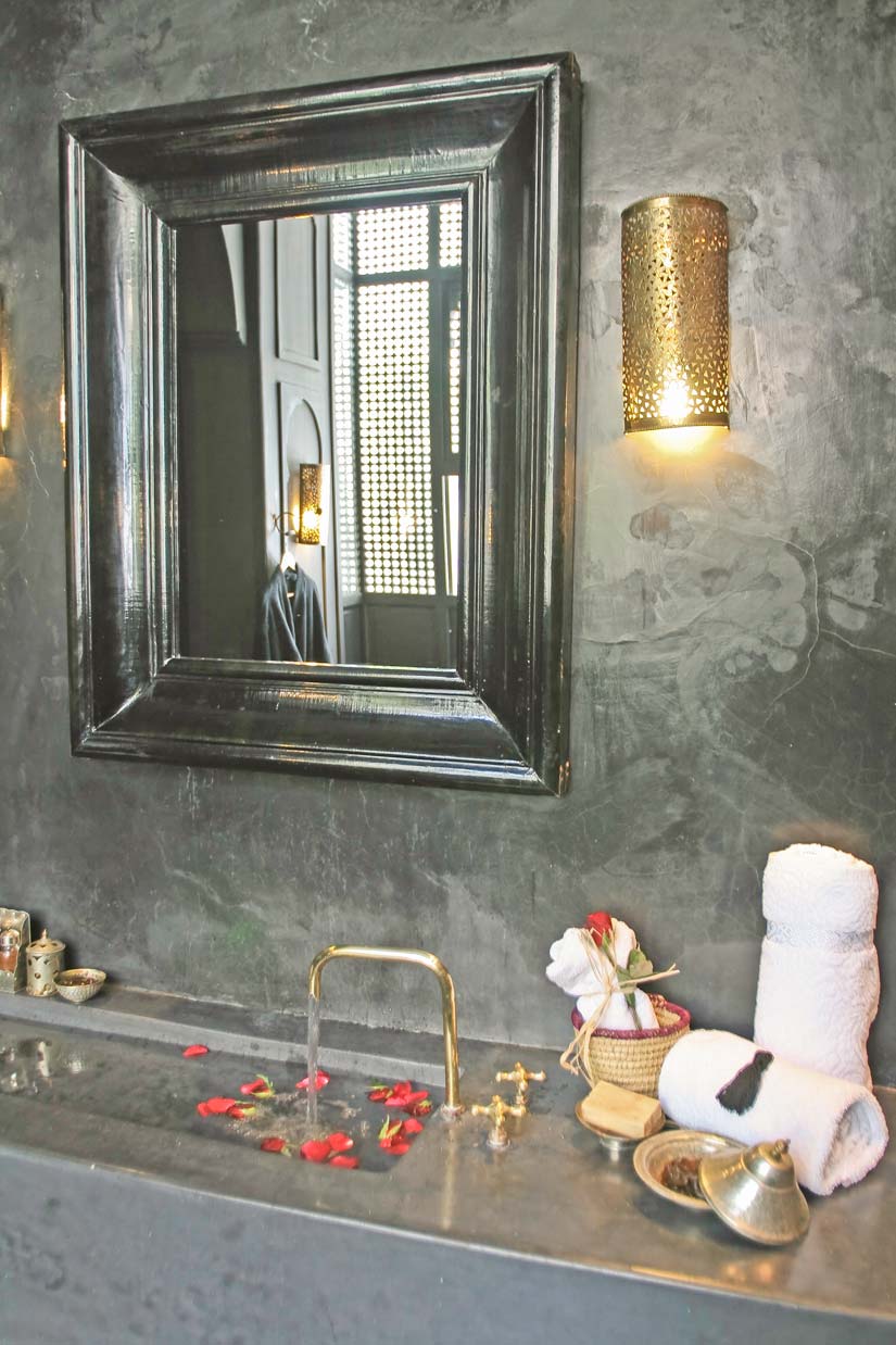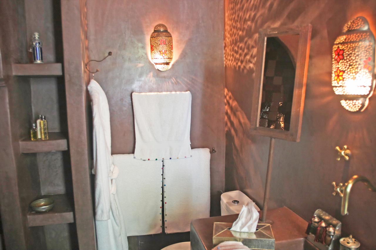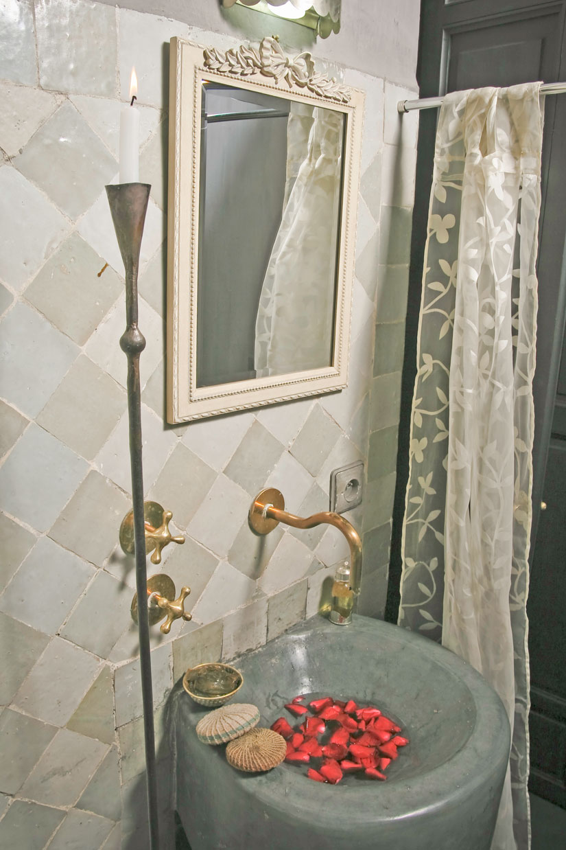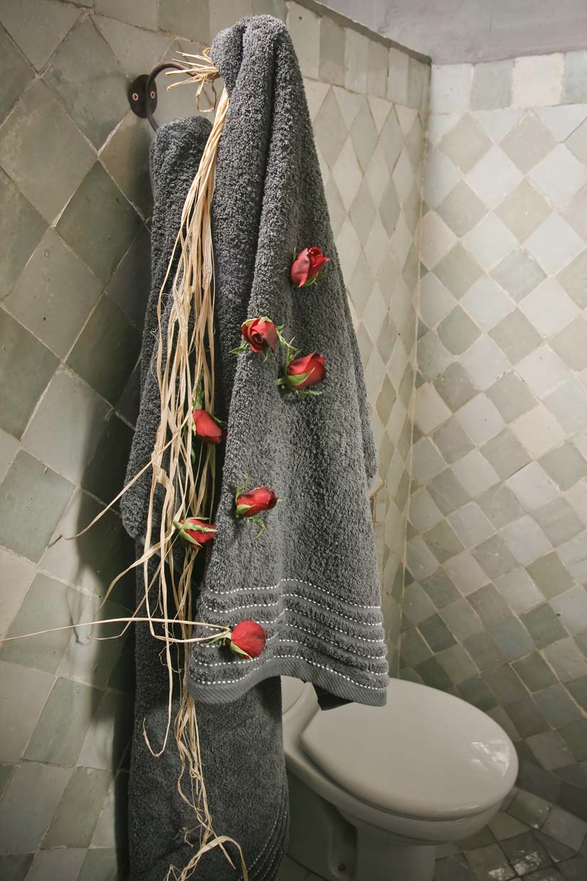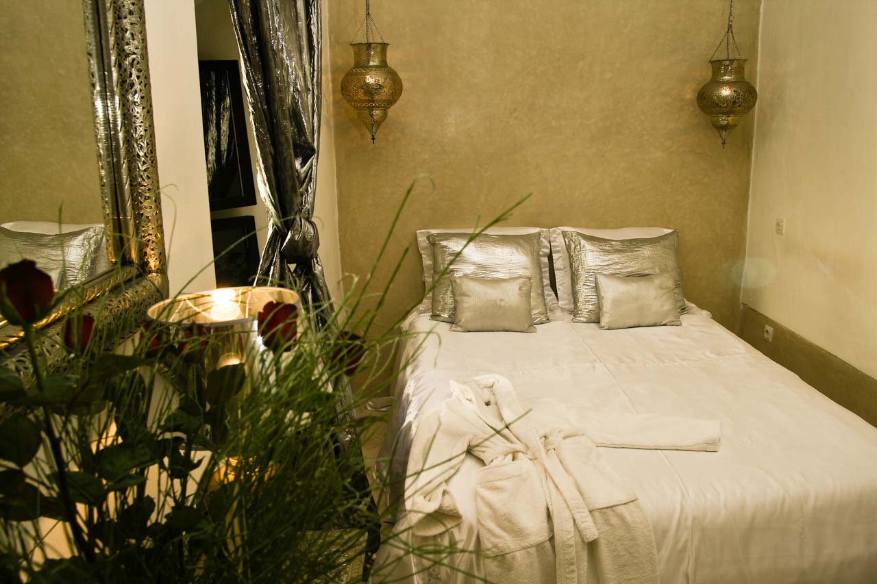 L'austerità e l'eleganza del grigio perla si unisce al calore degli oggetti in ottone. Preziosi caftani decorano i muri in calce lavorati a mano, tappeti berberi del deserto in mille sfumature rendono la Selim calda e avvolgente. Bagno in zellij di Féz e tadelakt sui toni bordeaux con vasca.