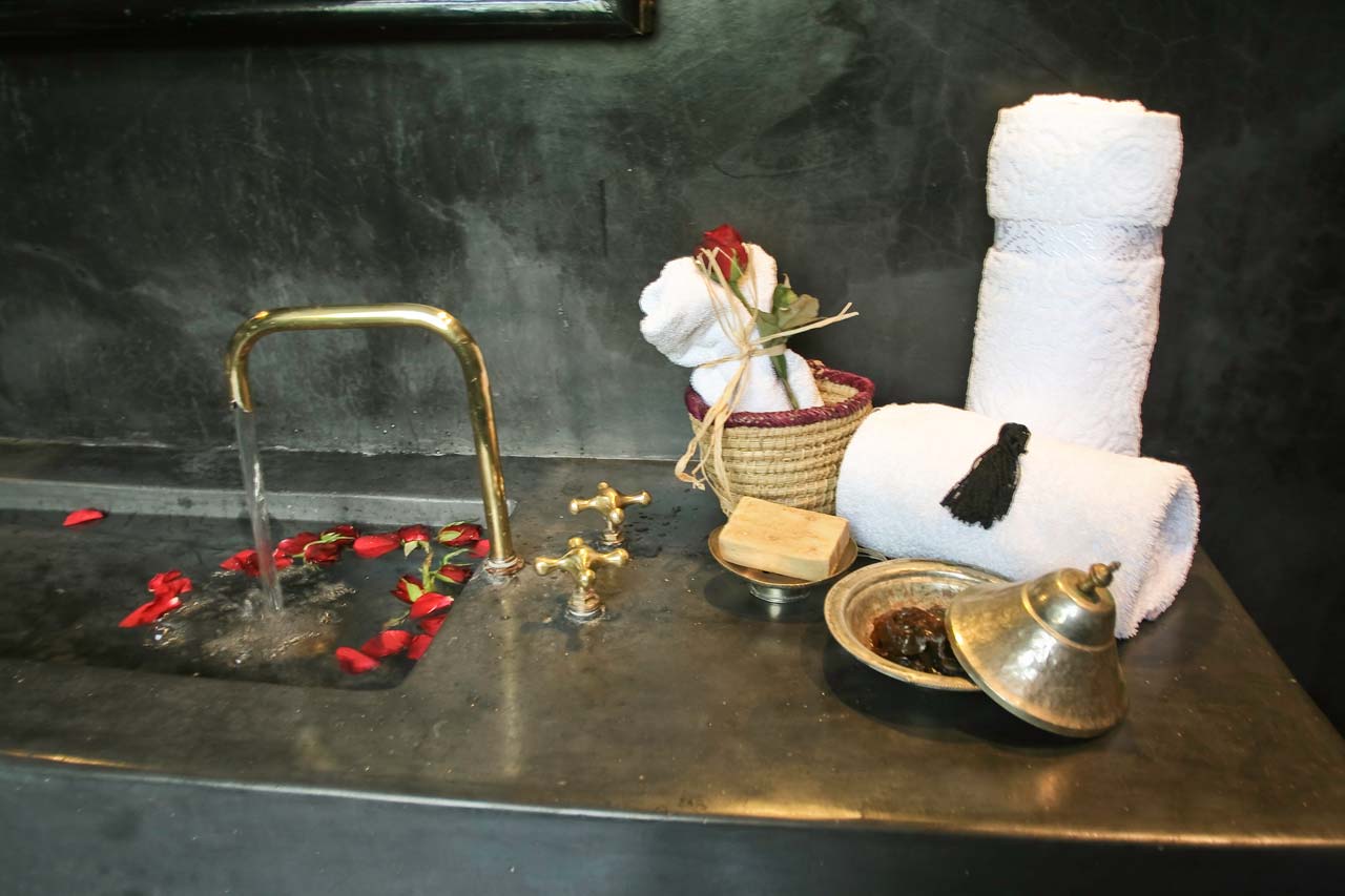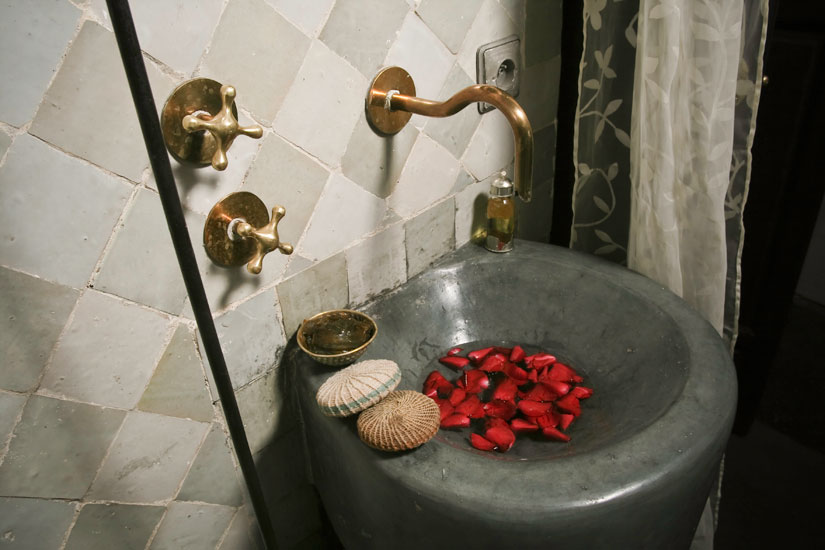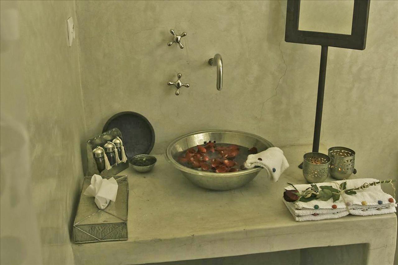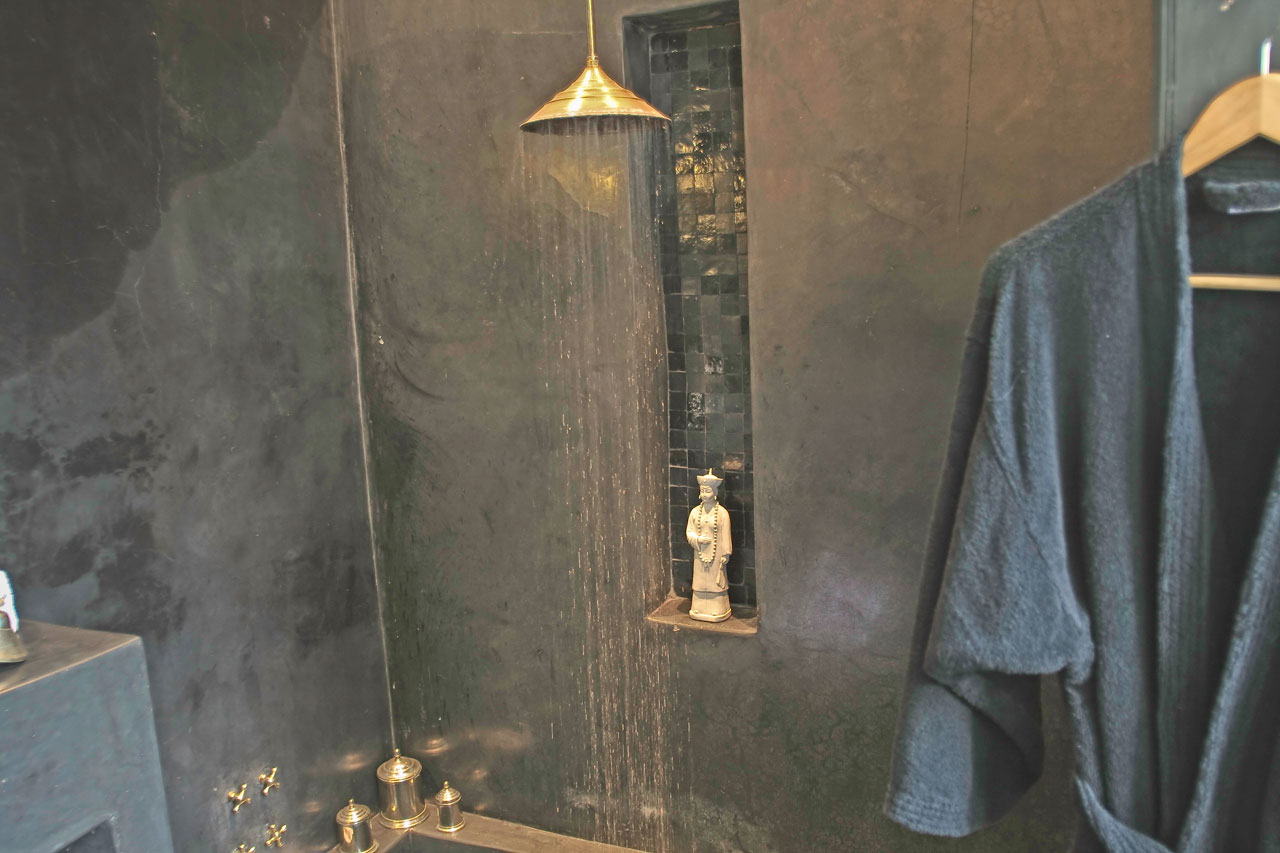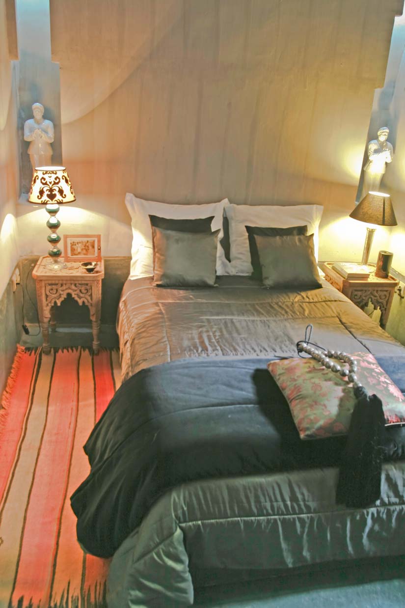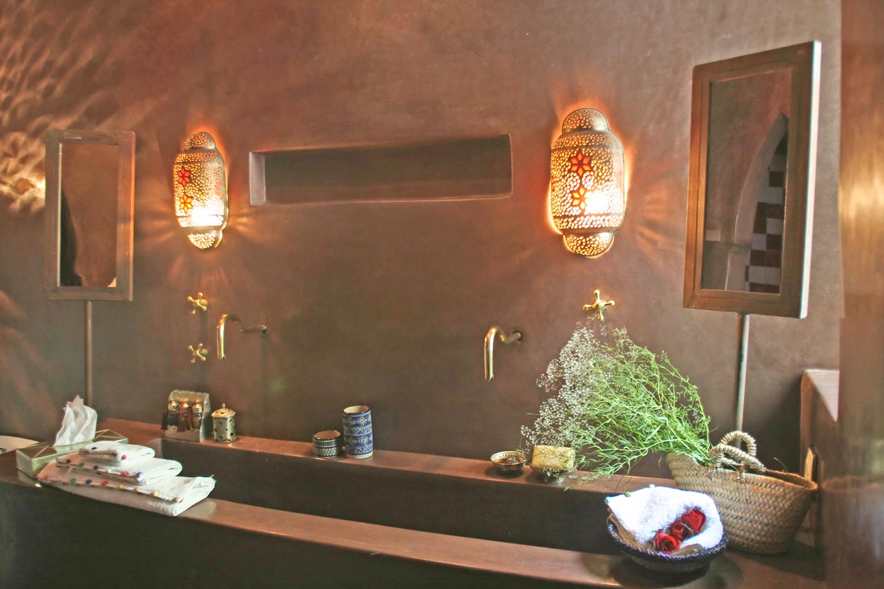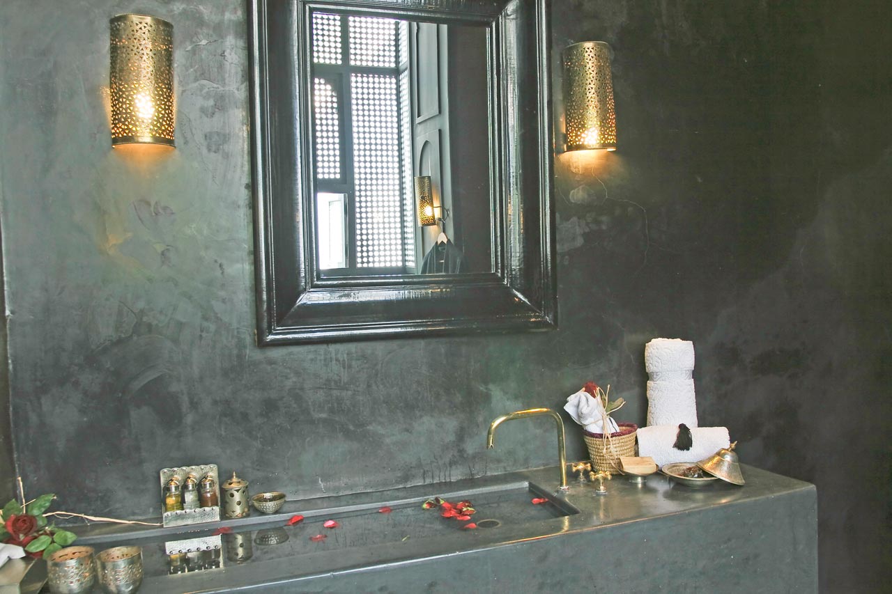 L'austerità e l'eleganza del grigio perla si unisce al calore degli oggetti in ottone. Preziosi caftani decorano i muri in calce lavorati a mano, tappeti berberi del deserto in mille sfumature rendono la Selim calda e avvolgente. Bagno in zellij di Féz e tadelakt sui toni bordeaux con vasca.