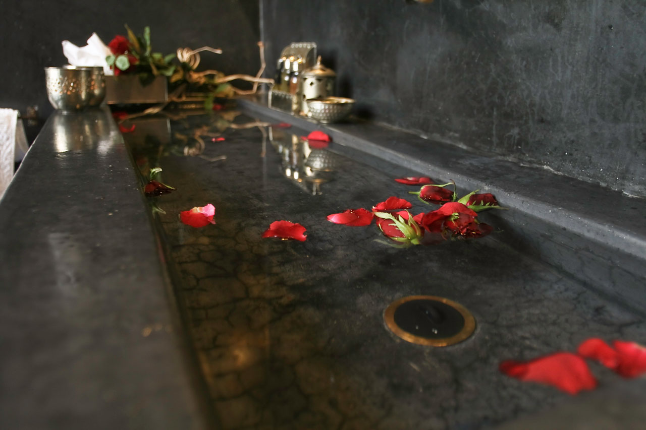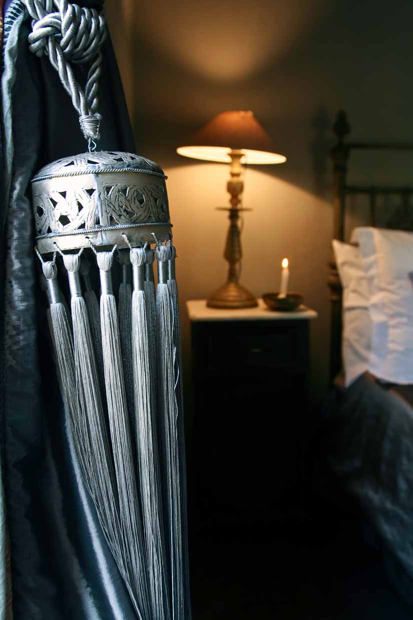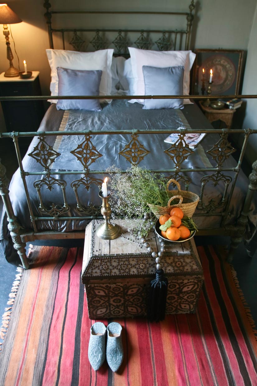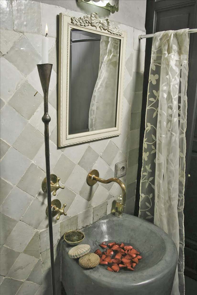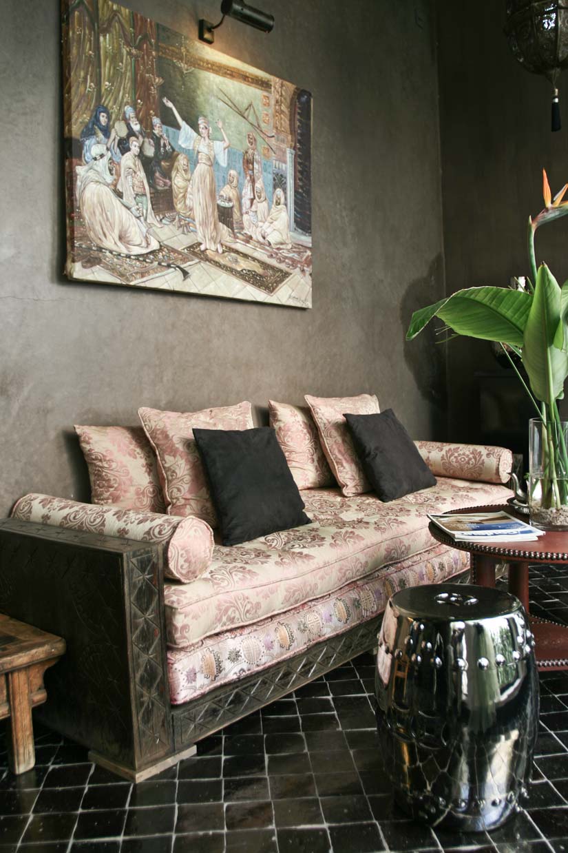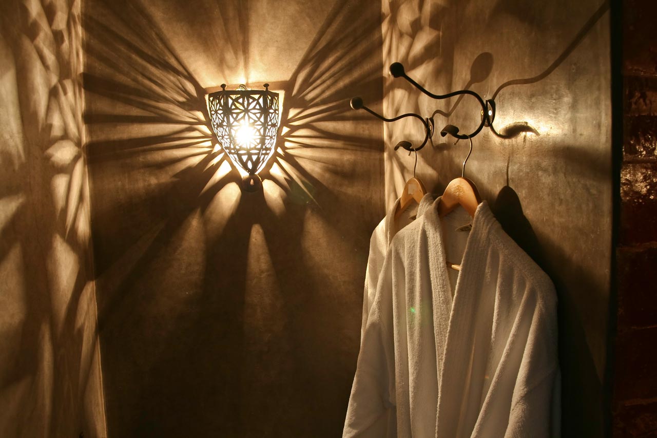L'austerità e l'eleganza del grigio perla si unisce al calore degli oggetti in ottone. Preziosi caftani decorano i muri in calce lavorati a mano, tappeti berberi del deserto in mille sfumature rendono la Selim calda e avvolgente. Bagno in zellij di Féz e tadelakt sui toni bordeaux con vasca.