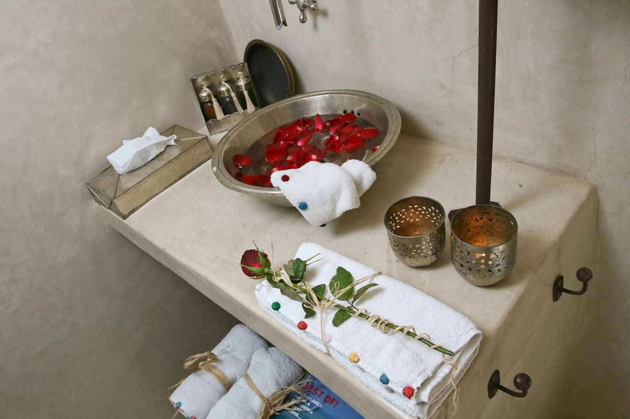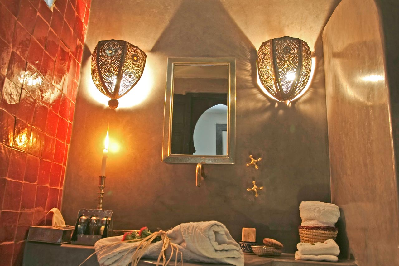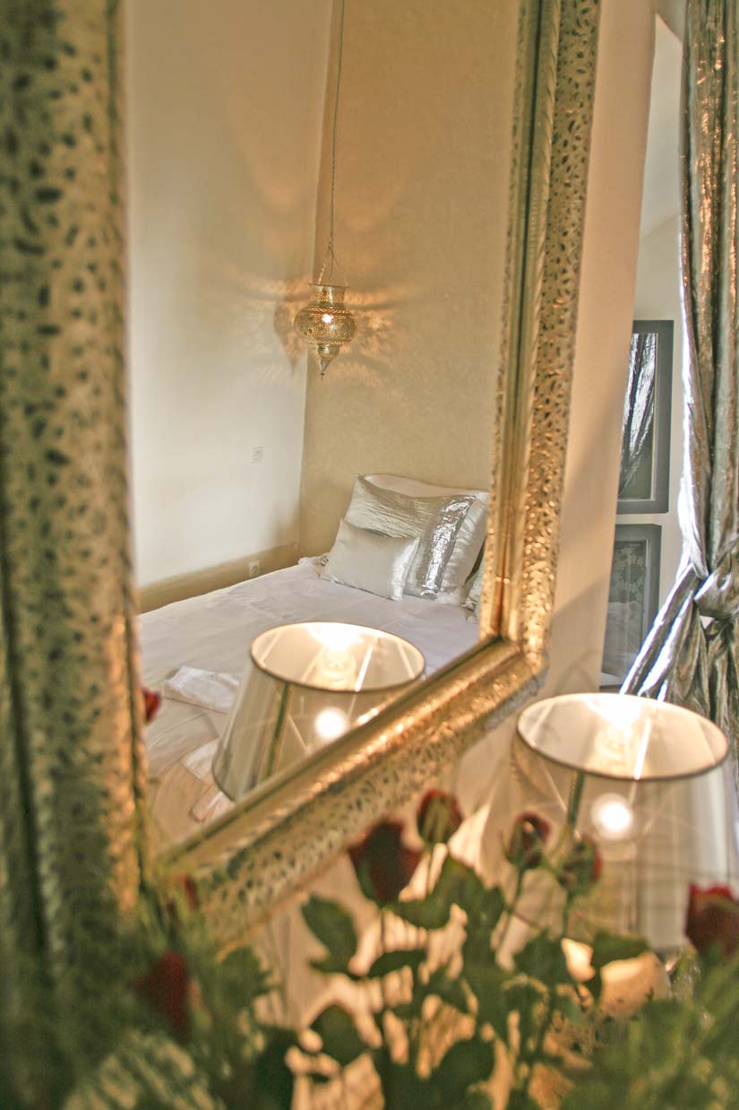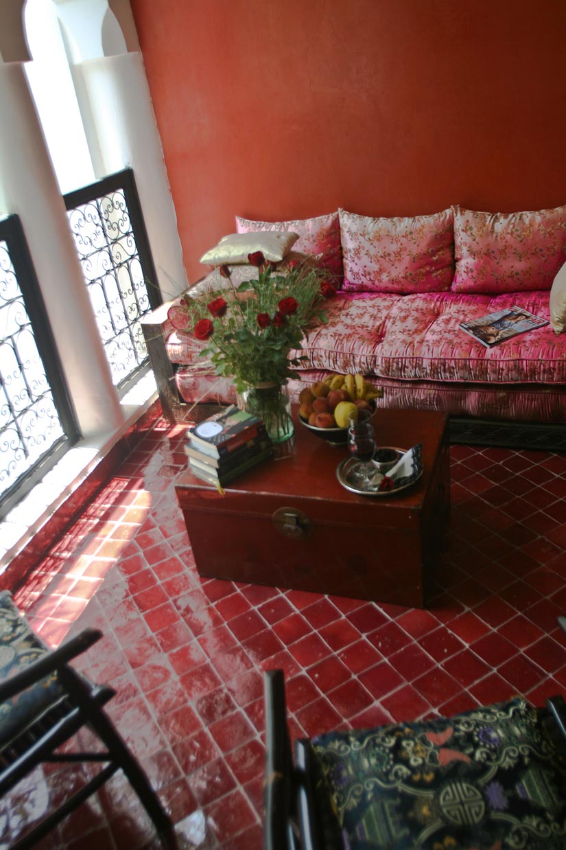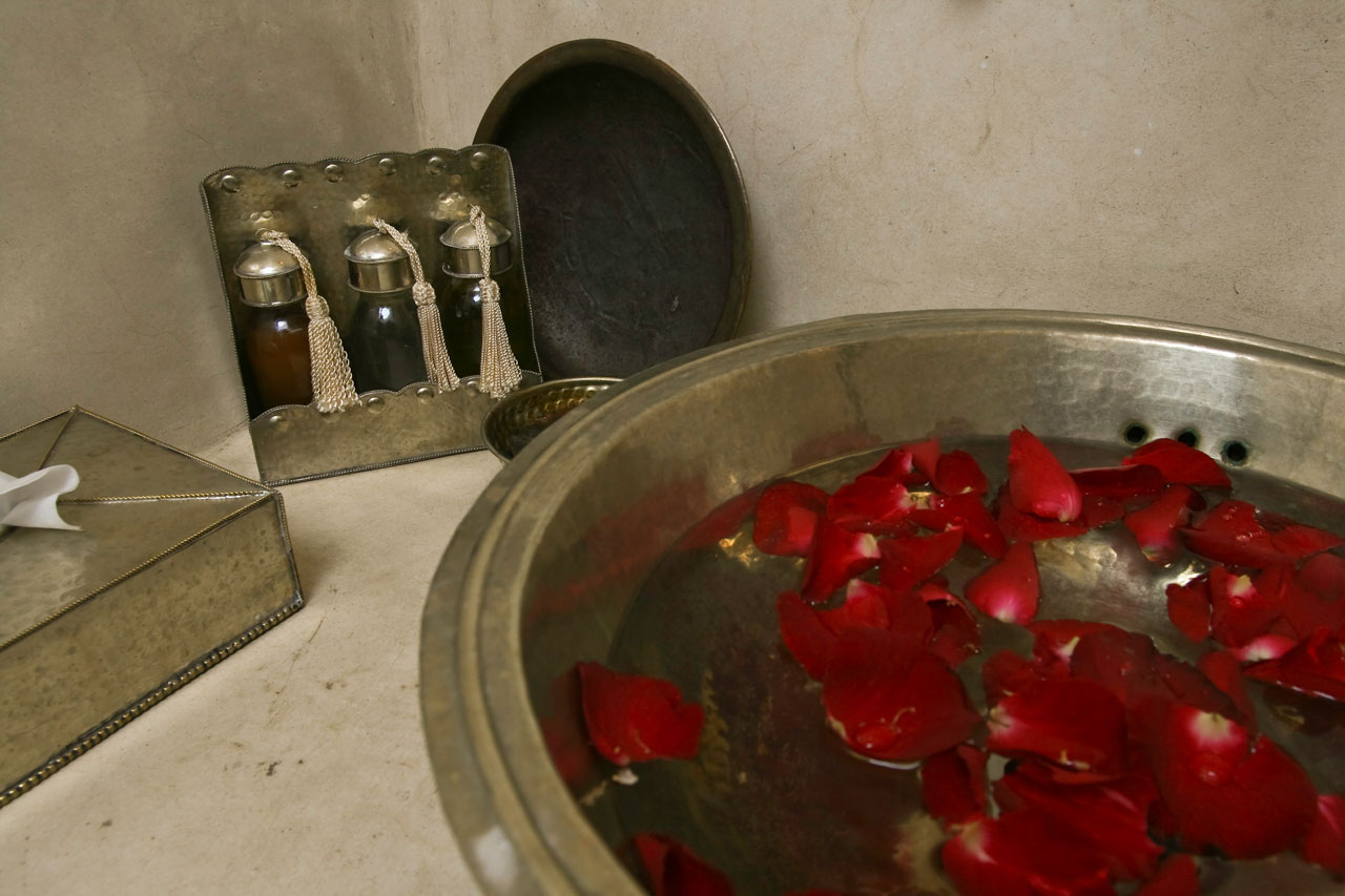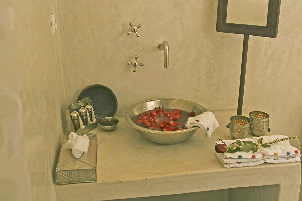 Il rosso predomina in ogni sua sfumatura avvolgendo preziosi tessuti e tappeti d'epoca. Lavorazioni berbere dell'Alto Atlas per il letto ed accenni metallici per gli oggetti, in un gioco di luci d'atmosfera unico e raffinato. Bagno in zellij di Féz e tadelakt amaranto che si amalgamano con delicatezza alla ricchezza dell'ottone lavorato a mano. Loggia privata, che affaccia sul patio della piscina, decorata con zellij rosso cina arredata con canapé indien e antiche cassapanche orientali.