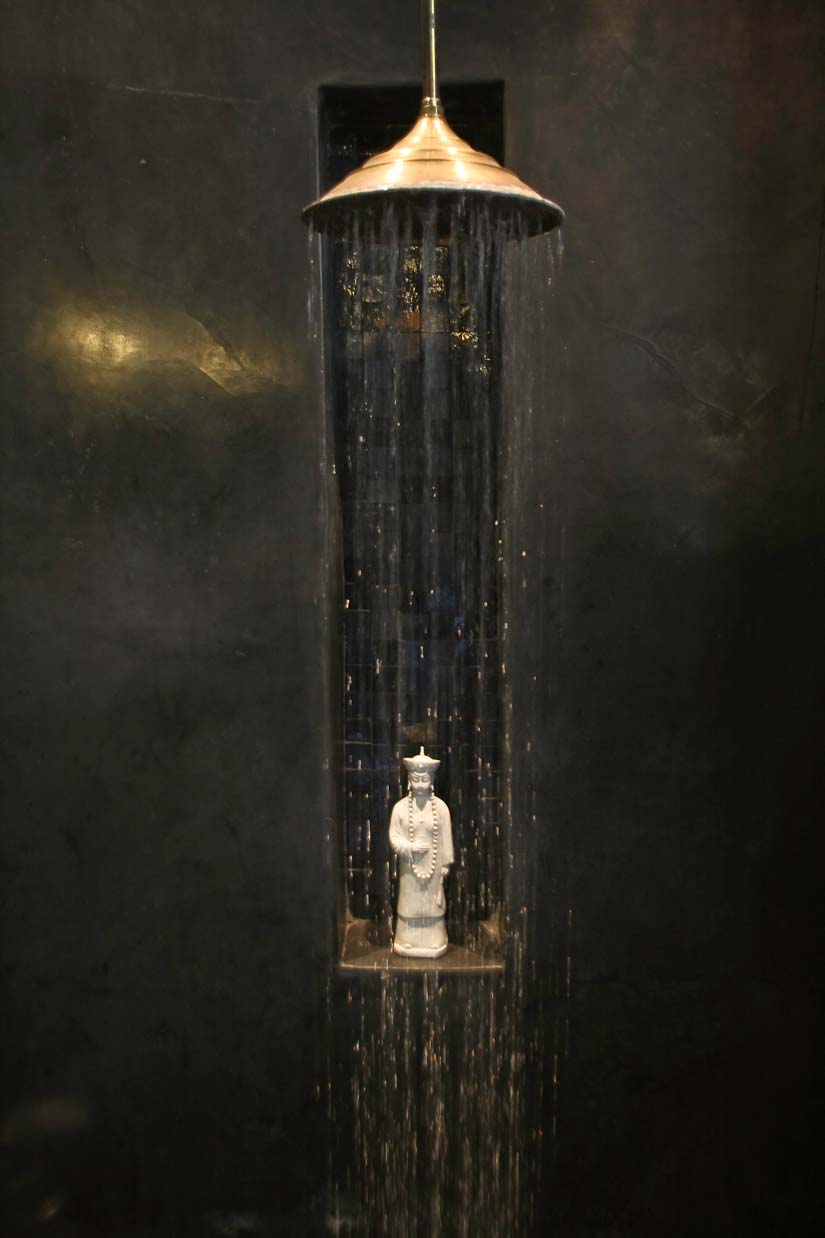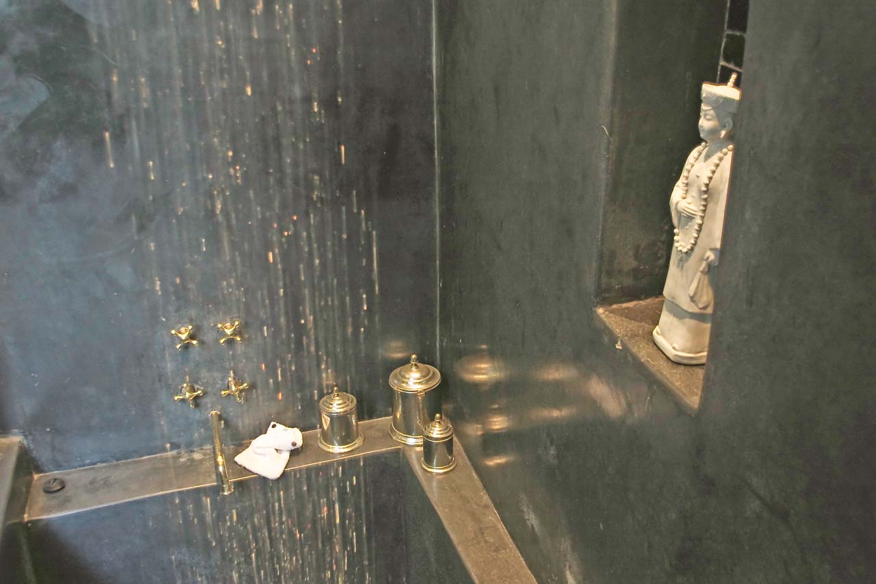 L'eleganza assoluta del bianco incontra l'argento. Riflessi di luci che si specchiano nelle pareti in tadelakt panna per sottili giochi di seduzione. Camino e oggetti d'arte di provenienze lontane si mixano e si completano in un gioco spettacolare di sfumature preziose. Bagno total-white in tadelakt con doccia.
