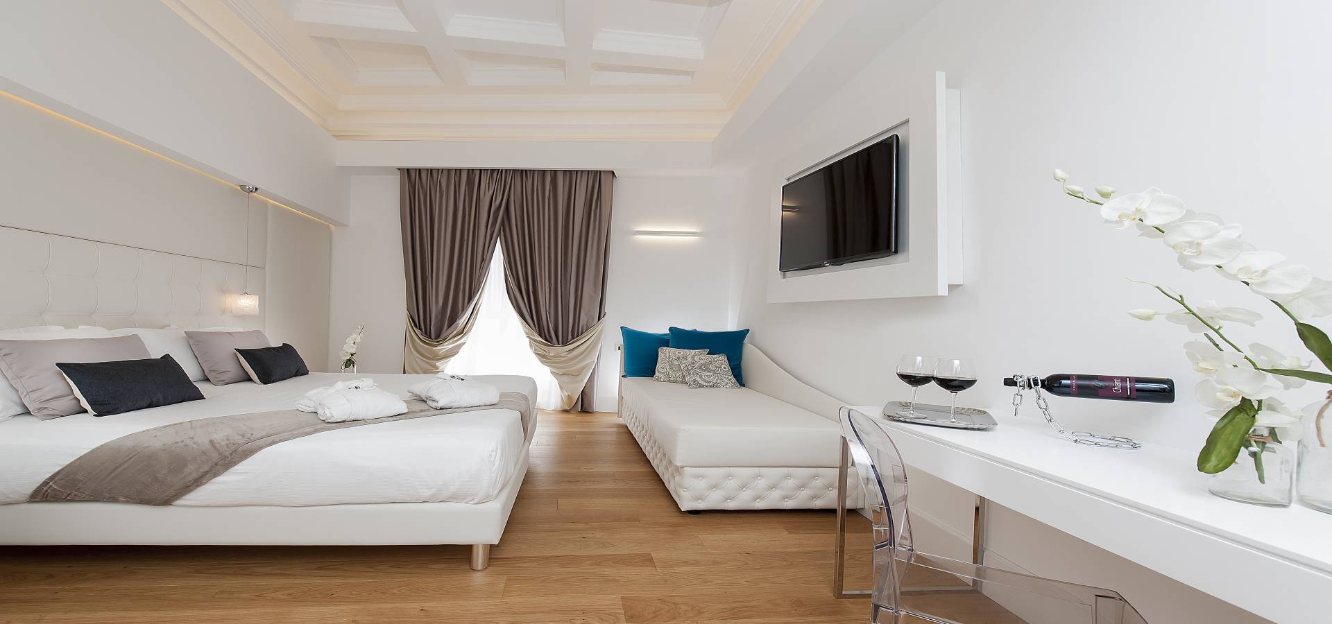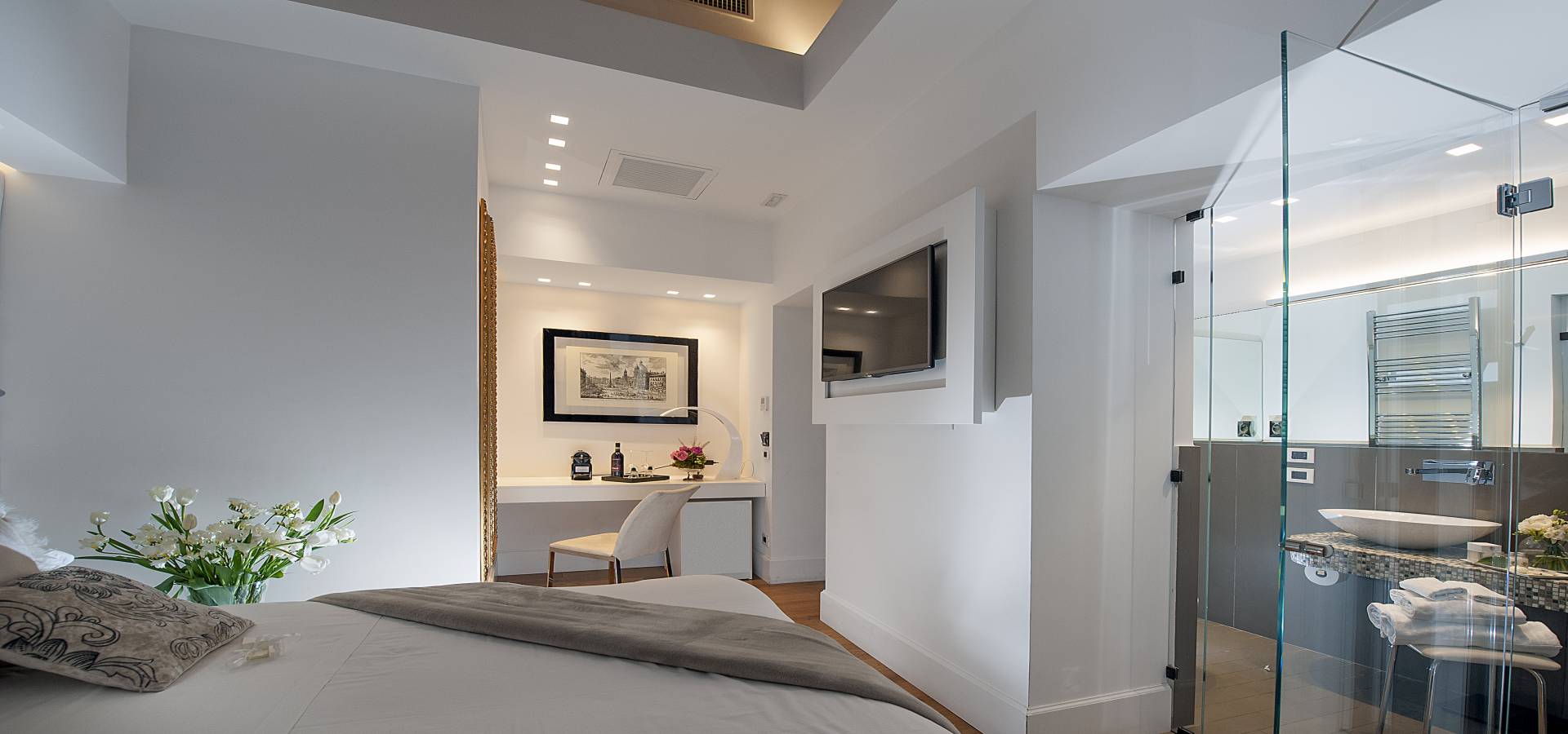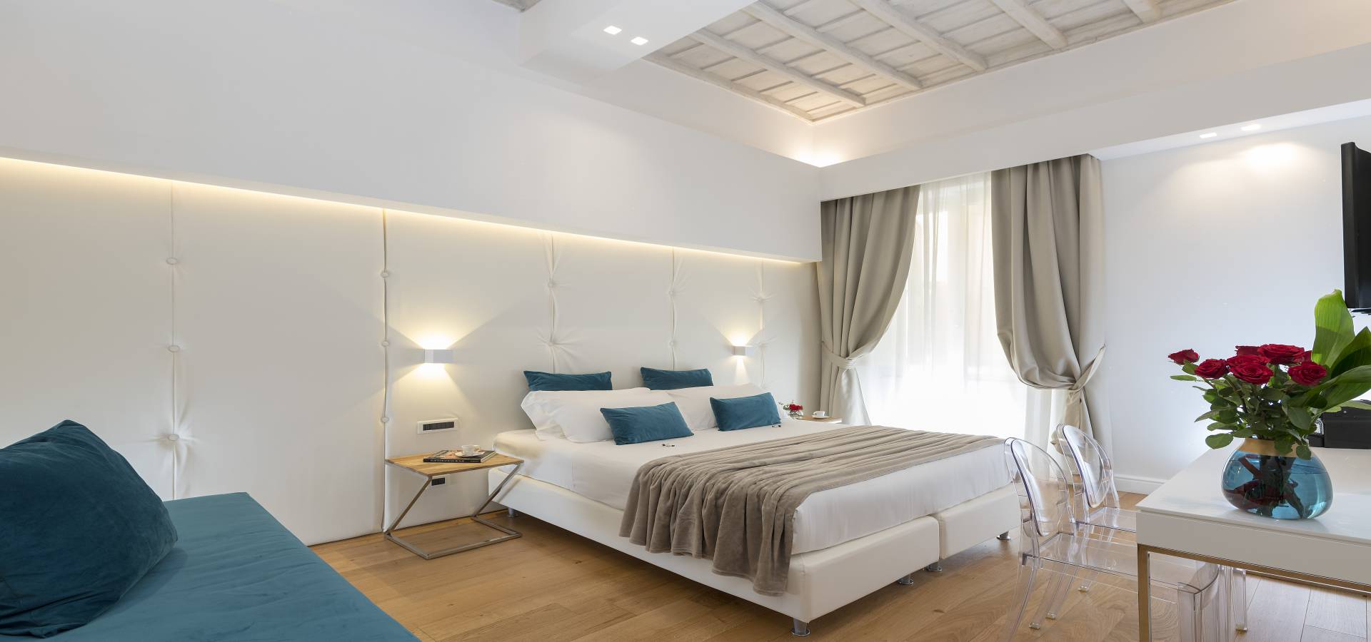 La Suite Executive è un ambiente particolarmente ampio, ideale per ospitare fino a 4 persone. Un ambiente moderno arredato arredato con ementi di design, dotato di un ampia zona soggiorno, un letto queen size, un ampio bagno con doccia walk in e una cabina armadio.
