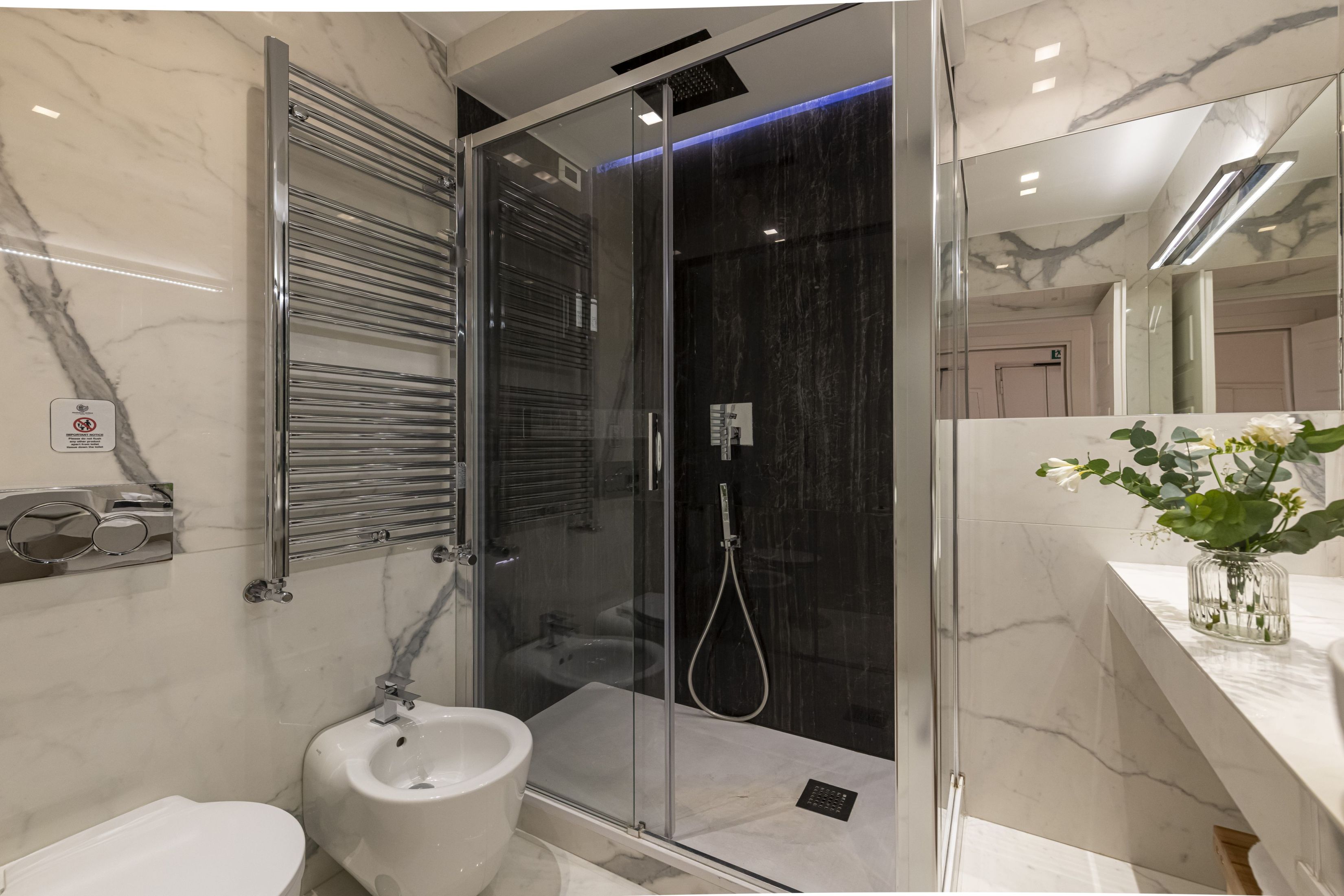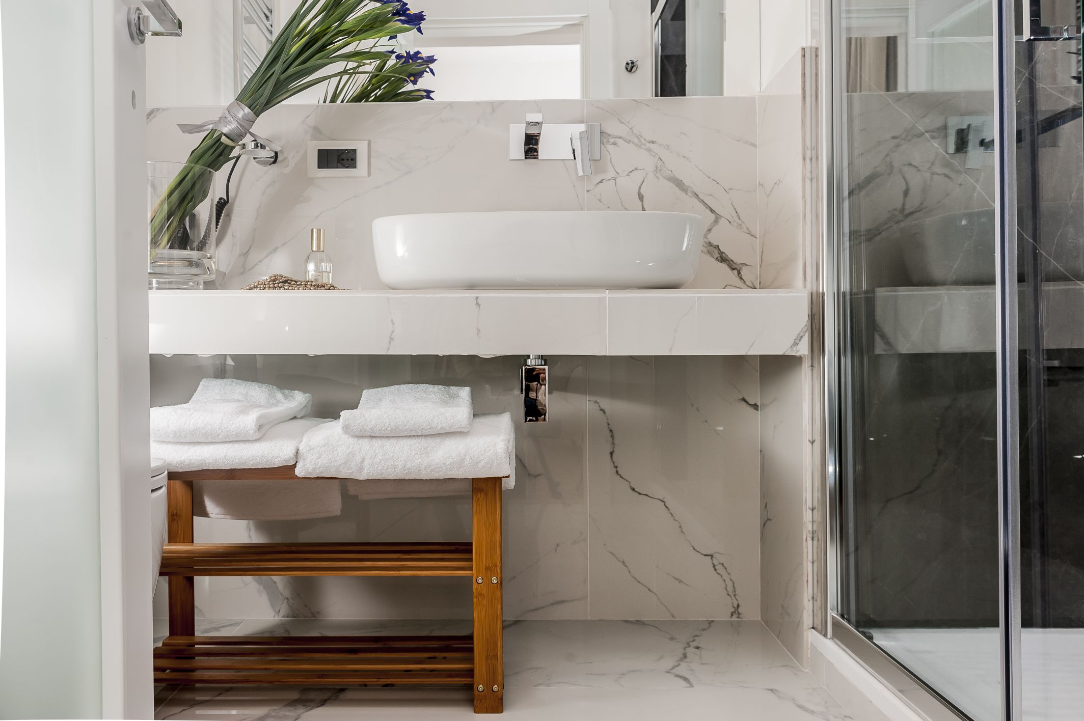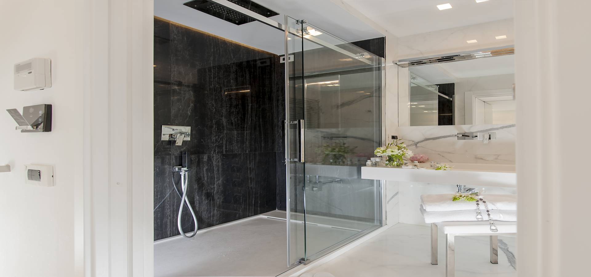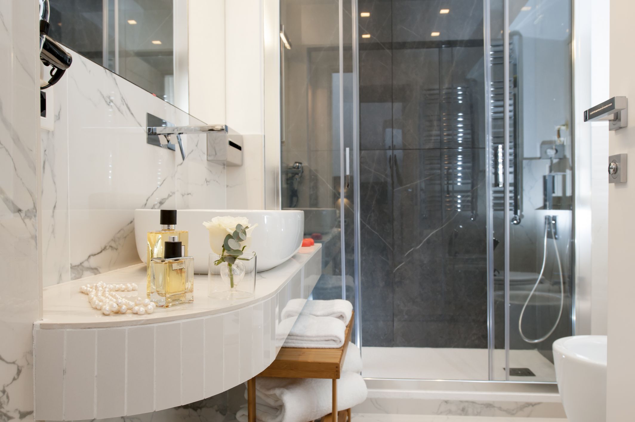Un bagno in marmo dotato di un'ampia doccia emozionale e un kit cortesia per gli ospiti.