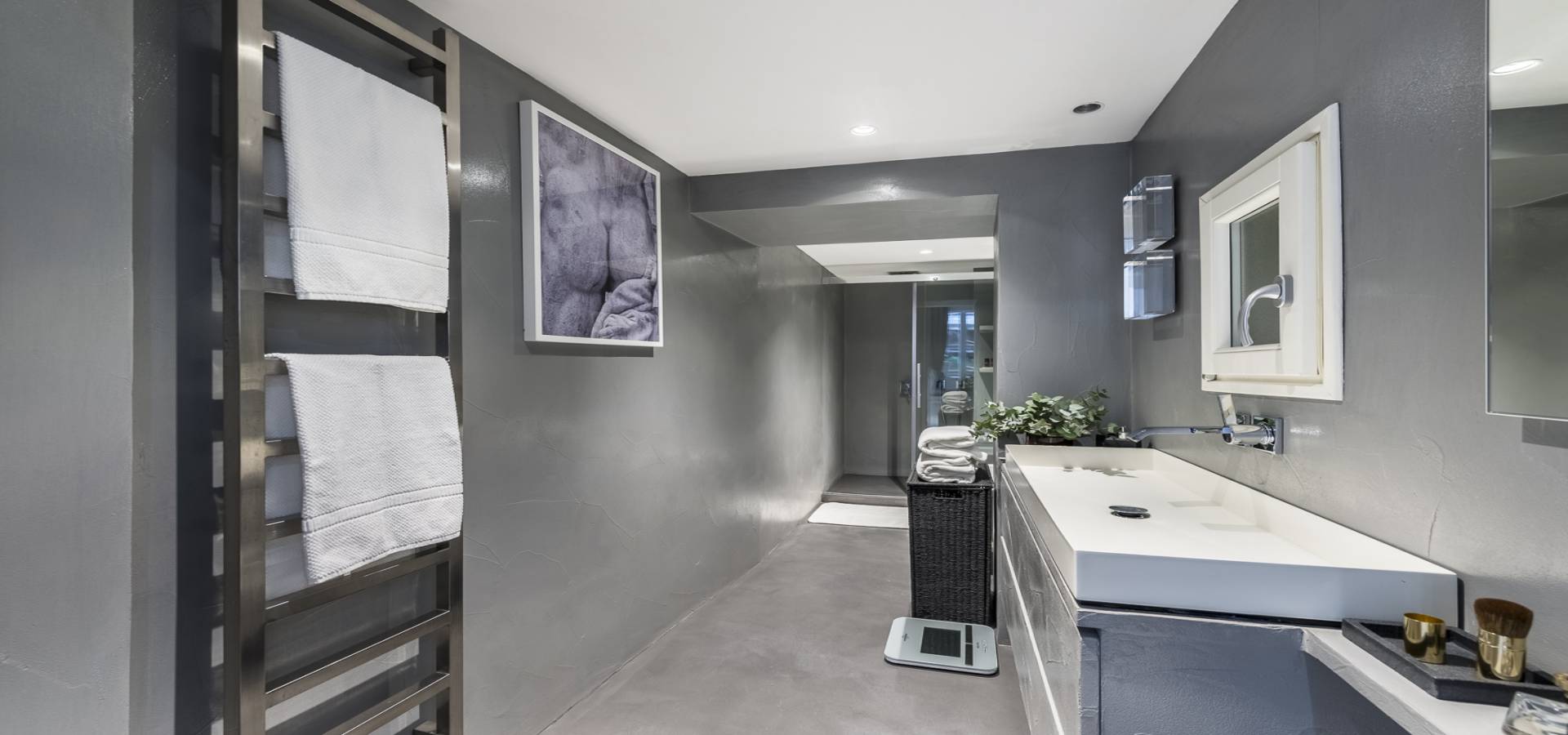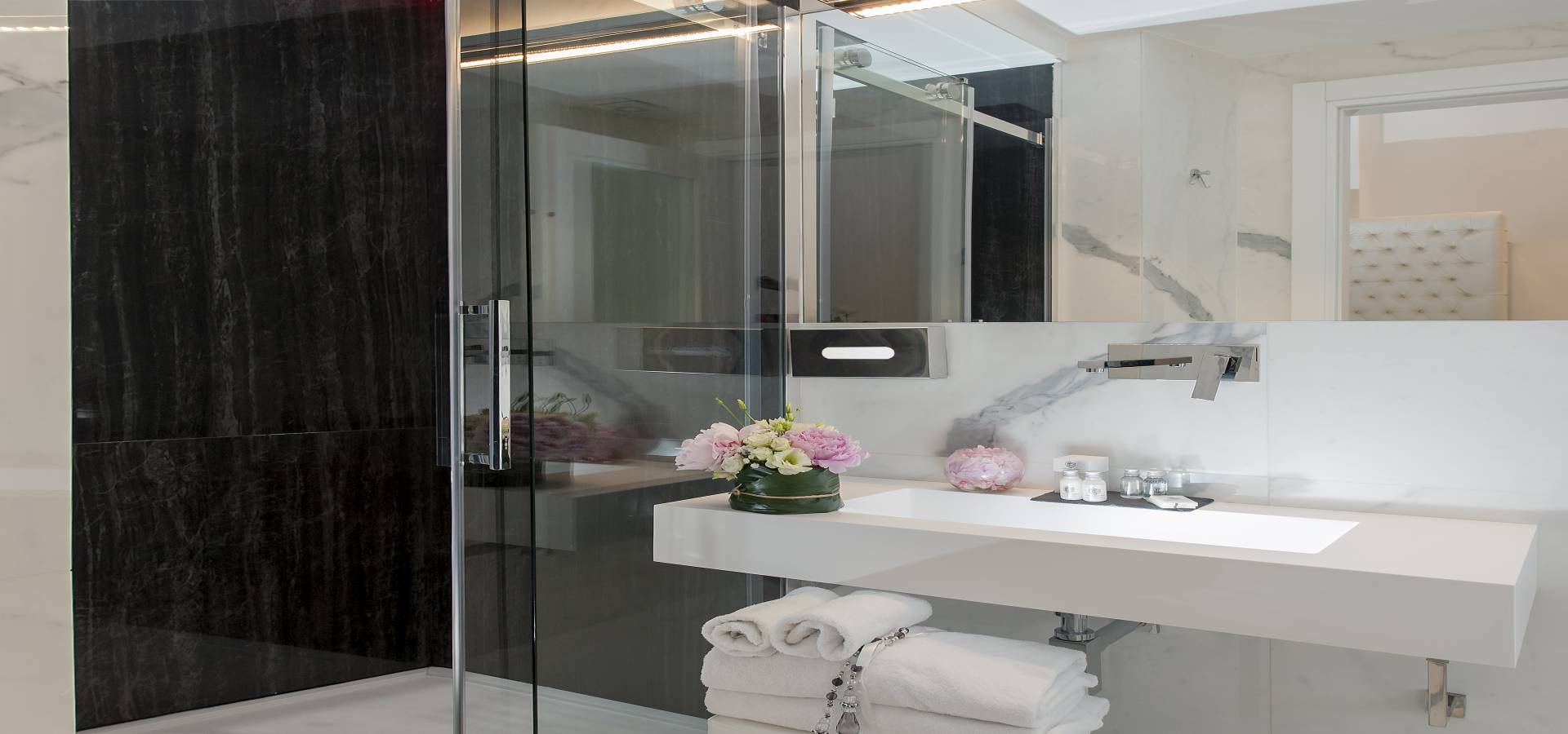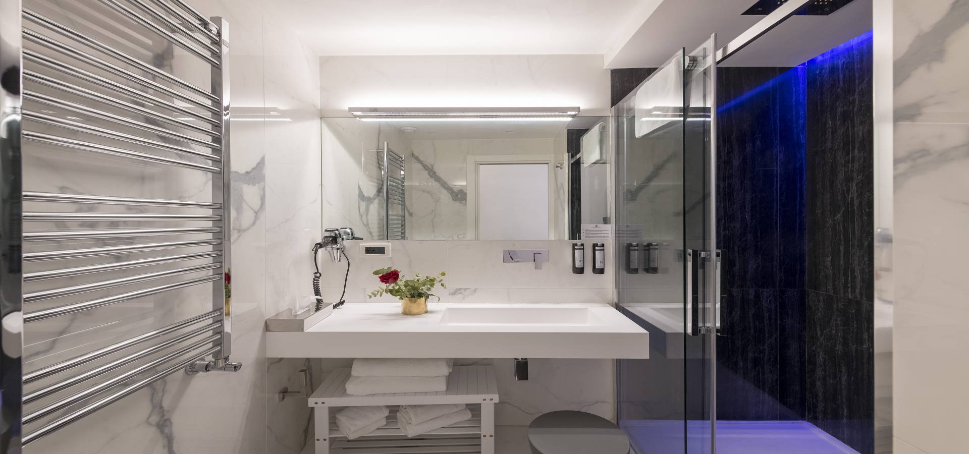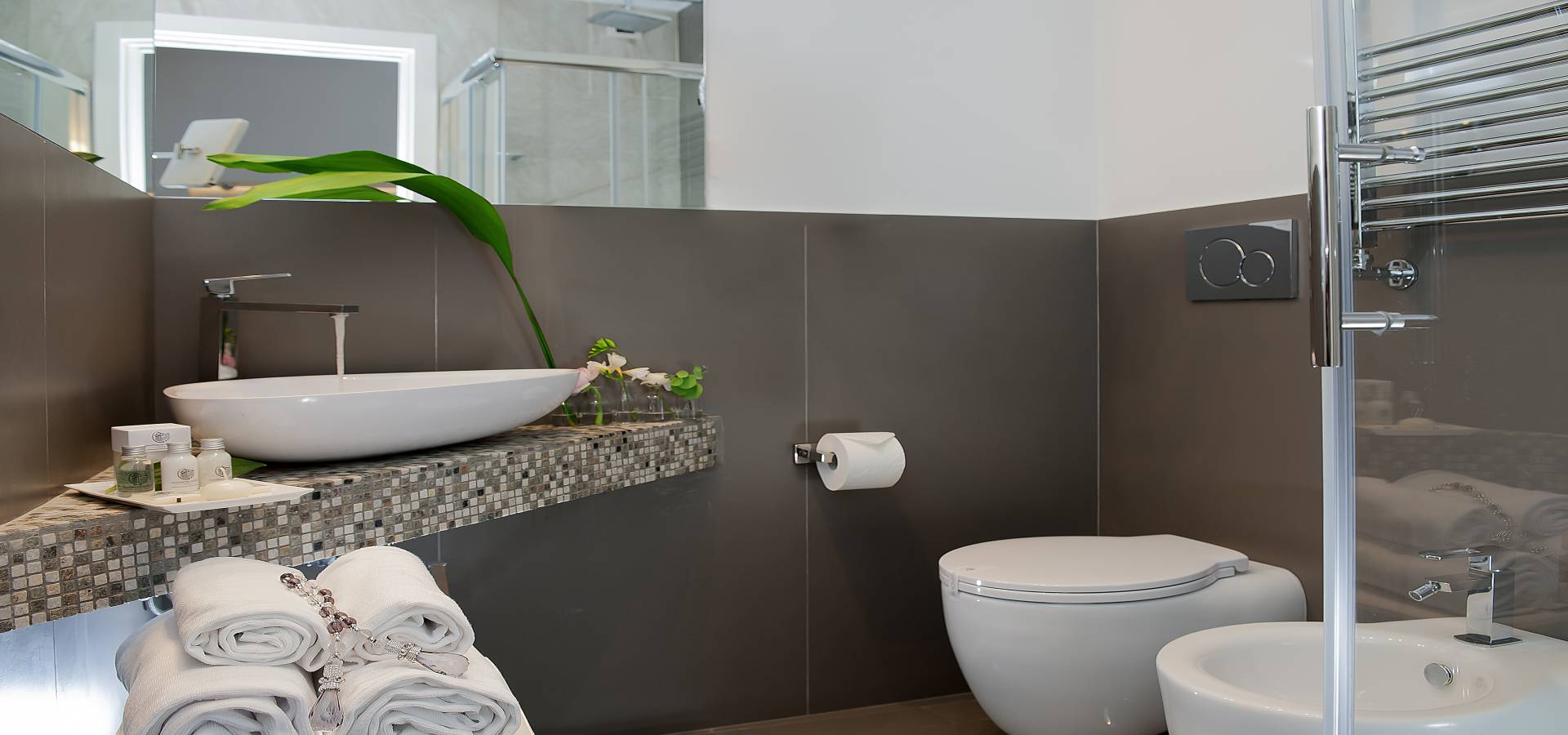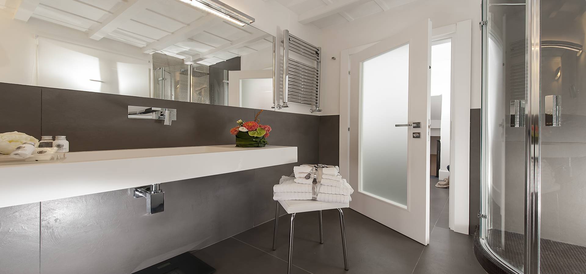 Un bagno in marmo dotato di un'ampia doccia emozionale e un kit cortesia per gli ospiti.