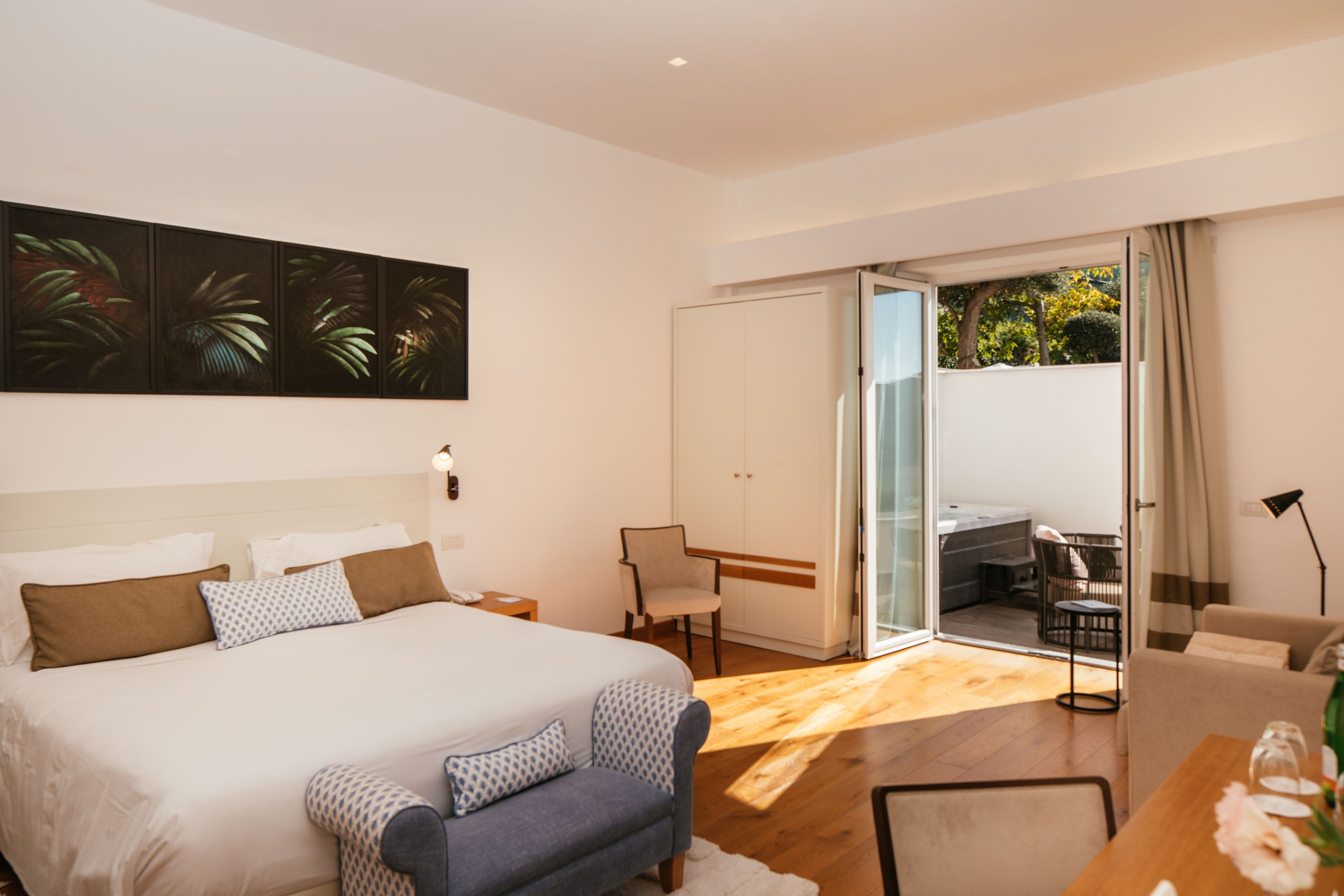 La Junior Suite Jacuzzi, caratterizzata dalla Vasca Idromassaggio esterna e terrazzo vista mare parziale, è ideale per una permanenza all’insegna del migliore relax.