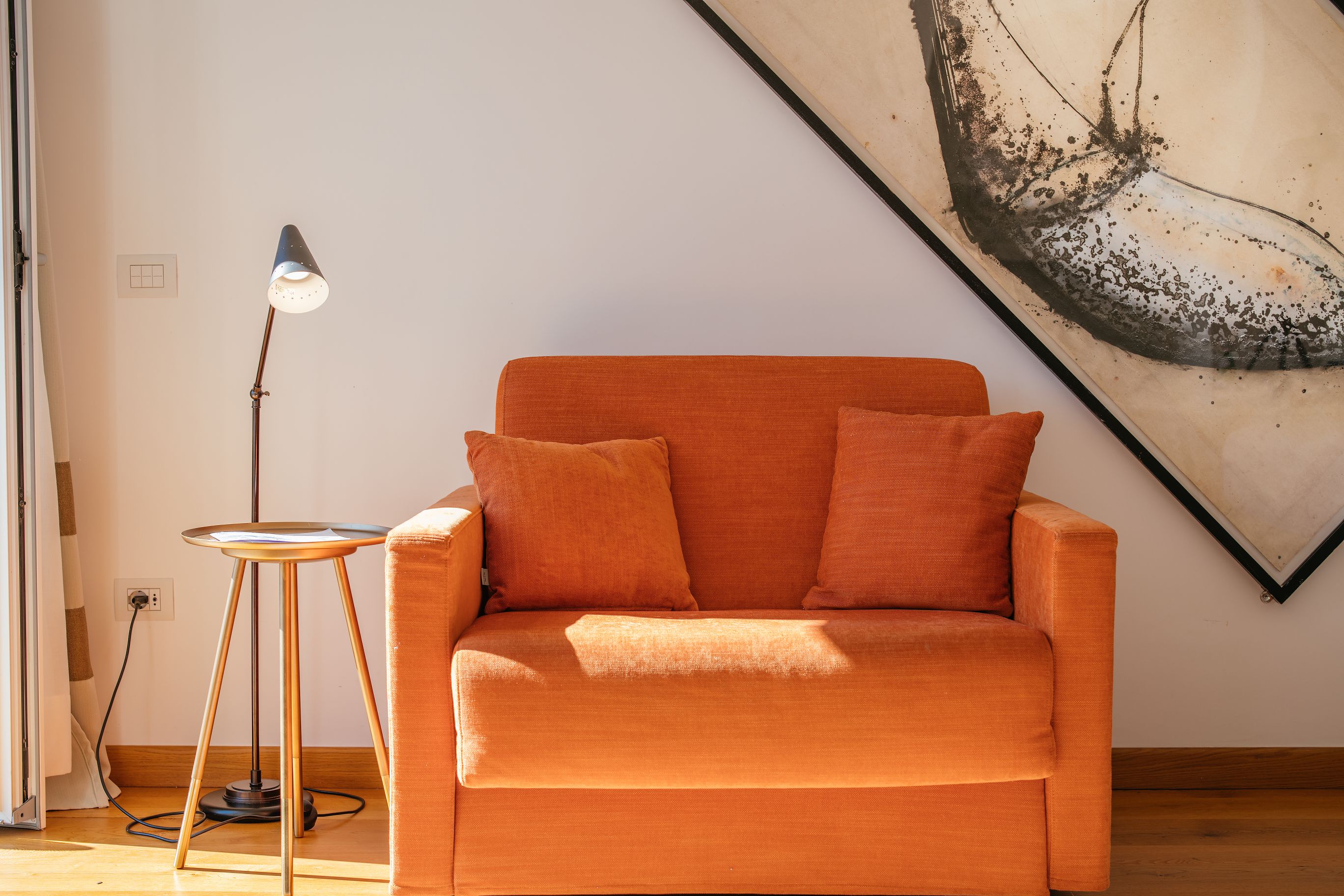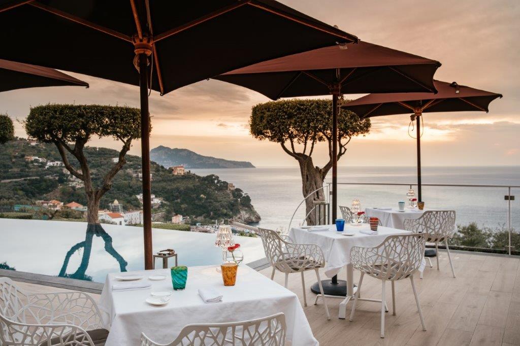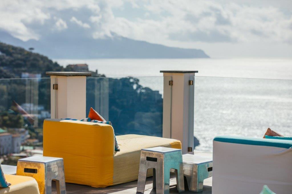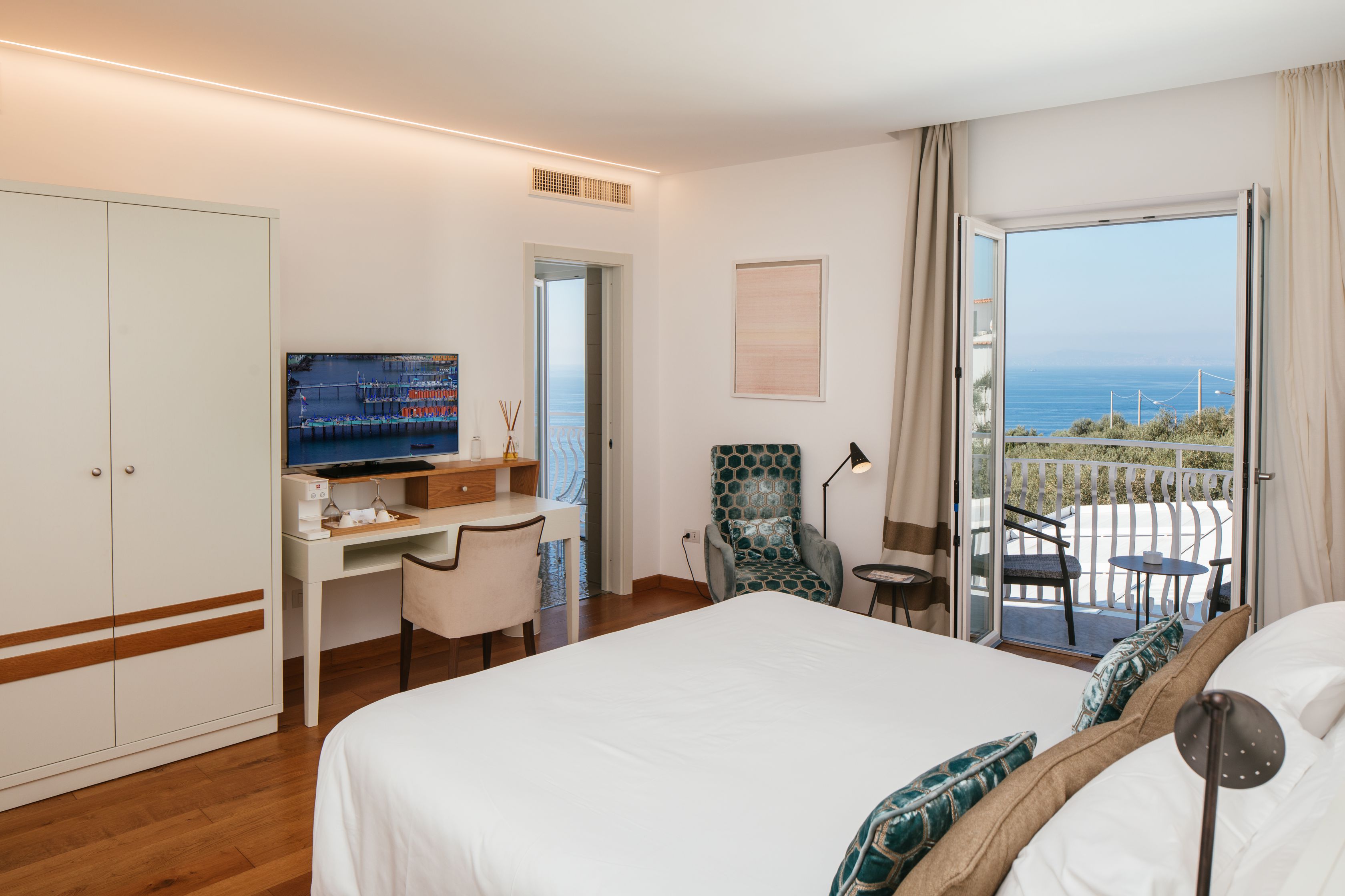 Per chi desidera più spazio e un ambiente speciale le Junior Suite sono l'ideale connubio fra design, funzionalità, eleganza e comfort. Un ampio e luminoso ambiente con divanetto/poltrona dove rilassarsi e che può essere convertito in un comodo letto.Balcone alla francese con vista mare laterale verso Capri. Dispongono di ampio bagno con cabina doccia o vasca, prodotti da bagno ETRO e biancheria FRETTE. Macchina espresso Illy