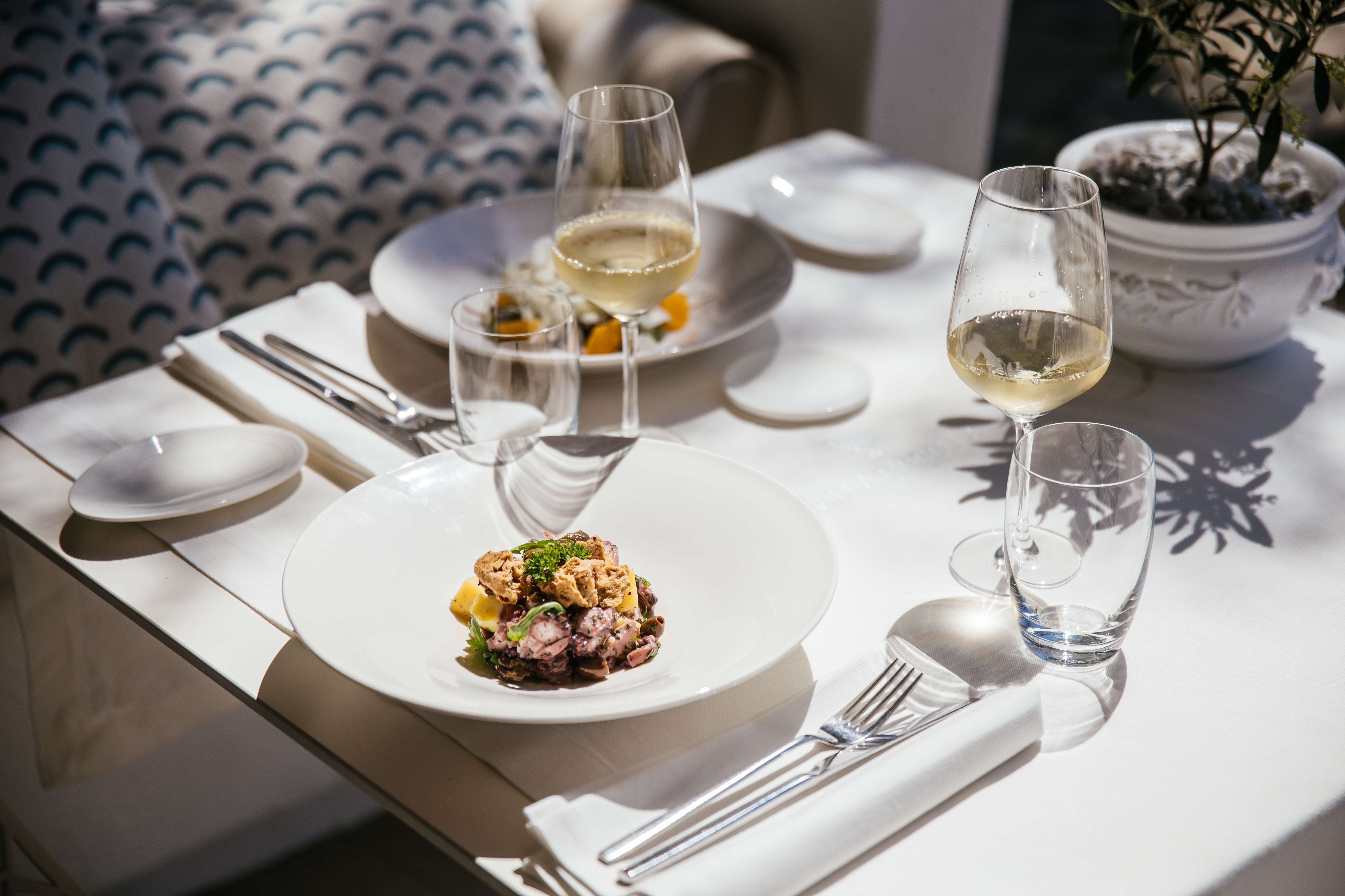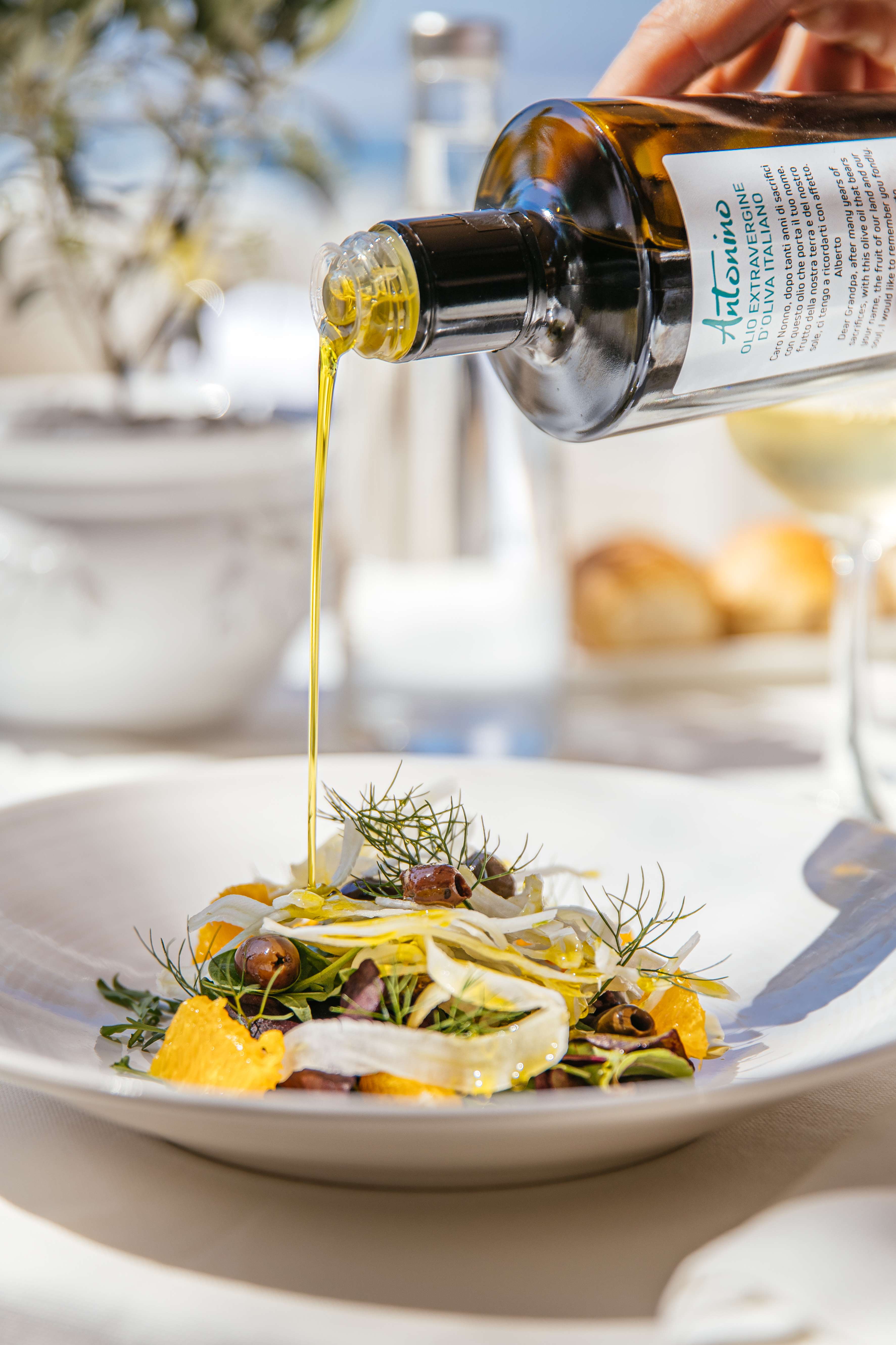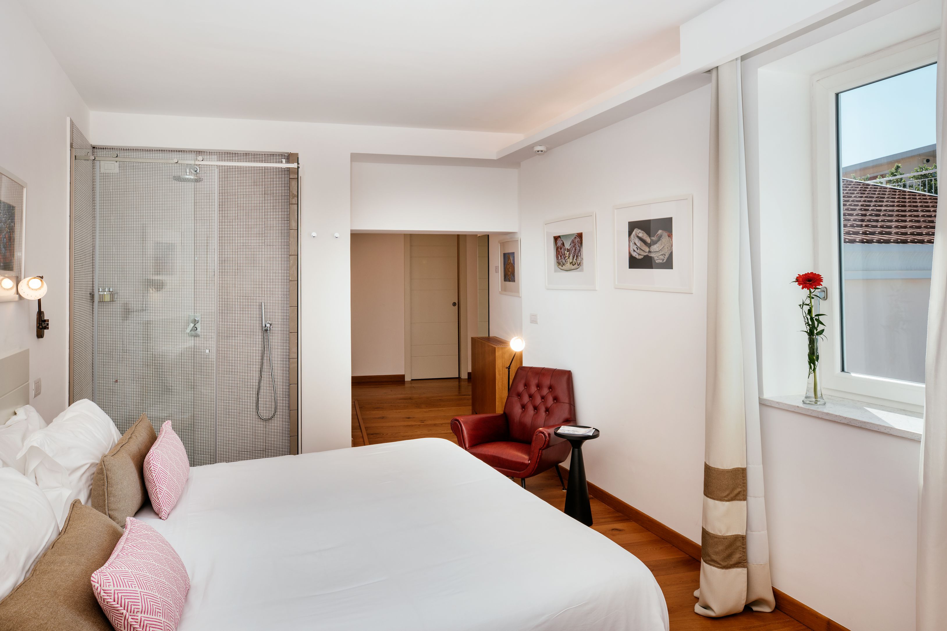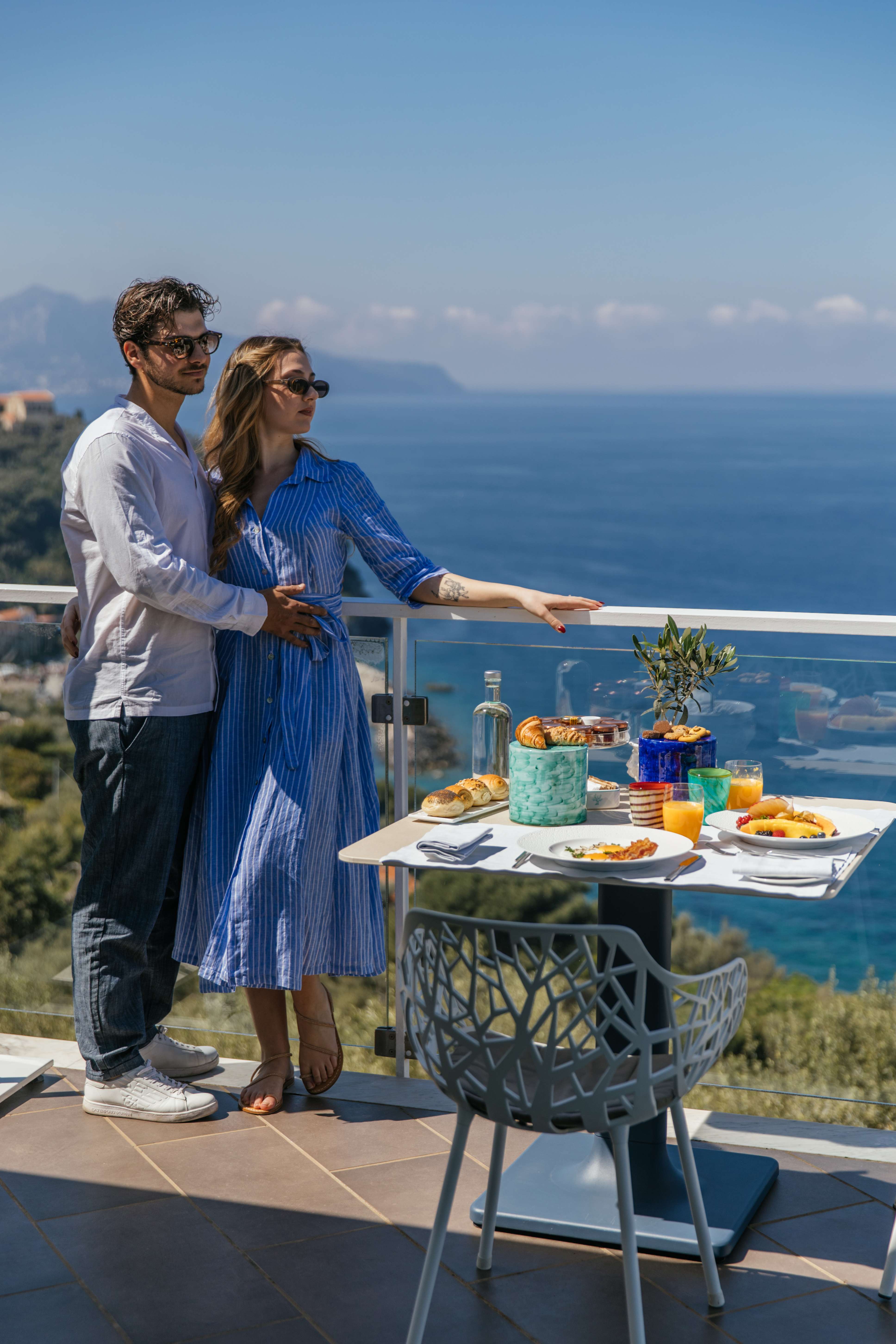 Il massimo del lusso, questa suite a due piani con vista mare e vista uliveti dispone al piano inferiore di soggiorno, bagno con cabina doccia e scala che conduce alla camera da letto con vetrata vista mare, cabina armadio e bagno di servizio. Il tutto contornato di opere d'arte e arredi di design in colori naturali.