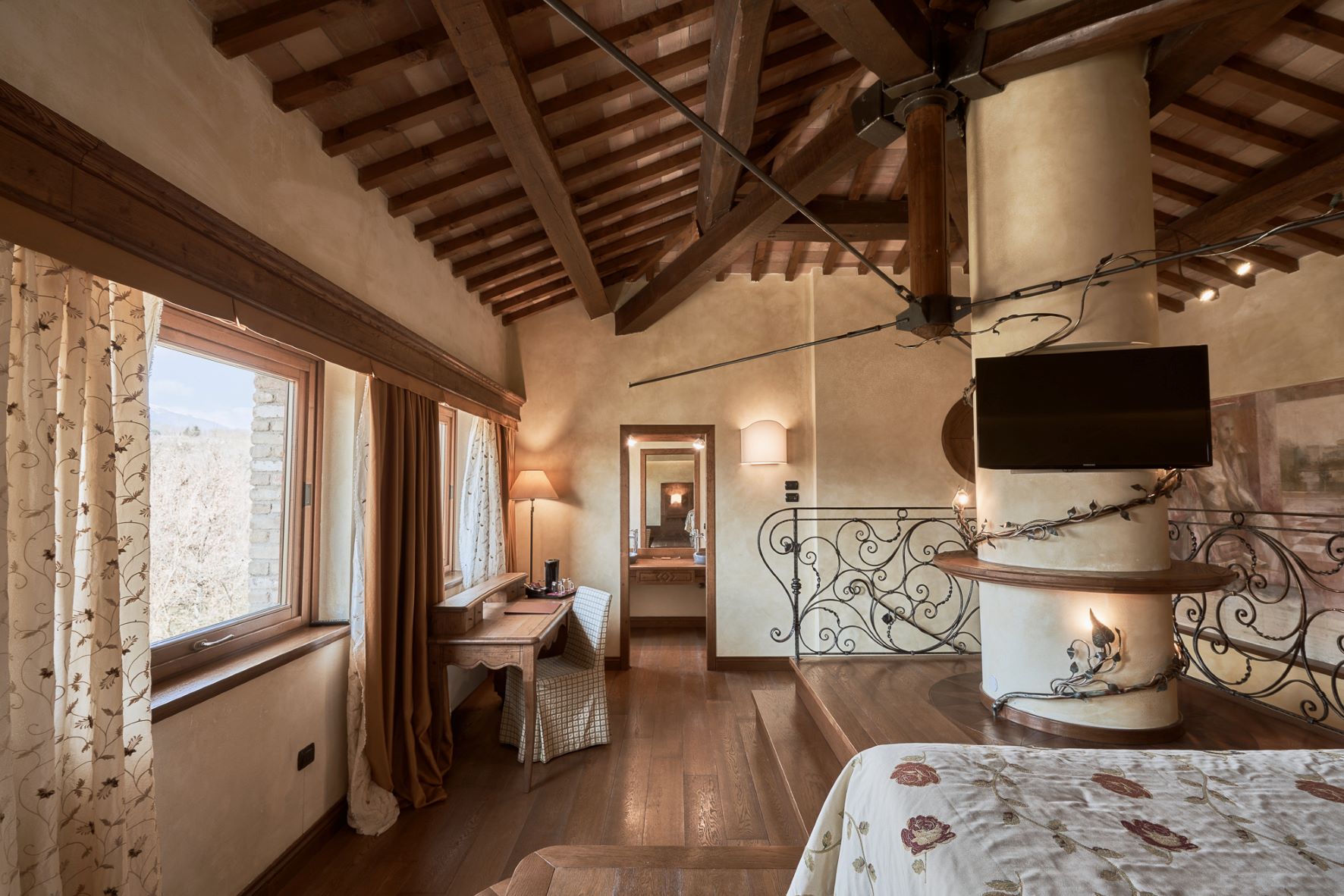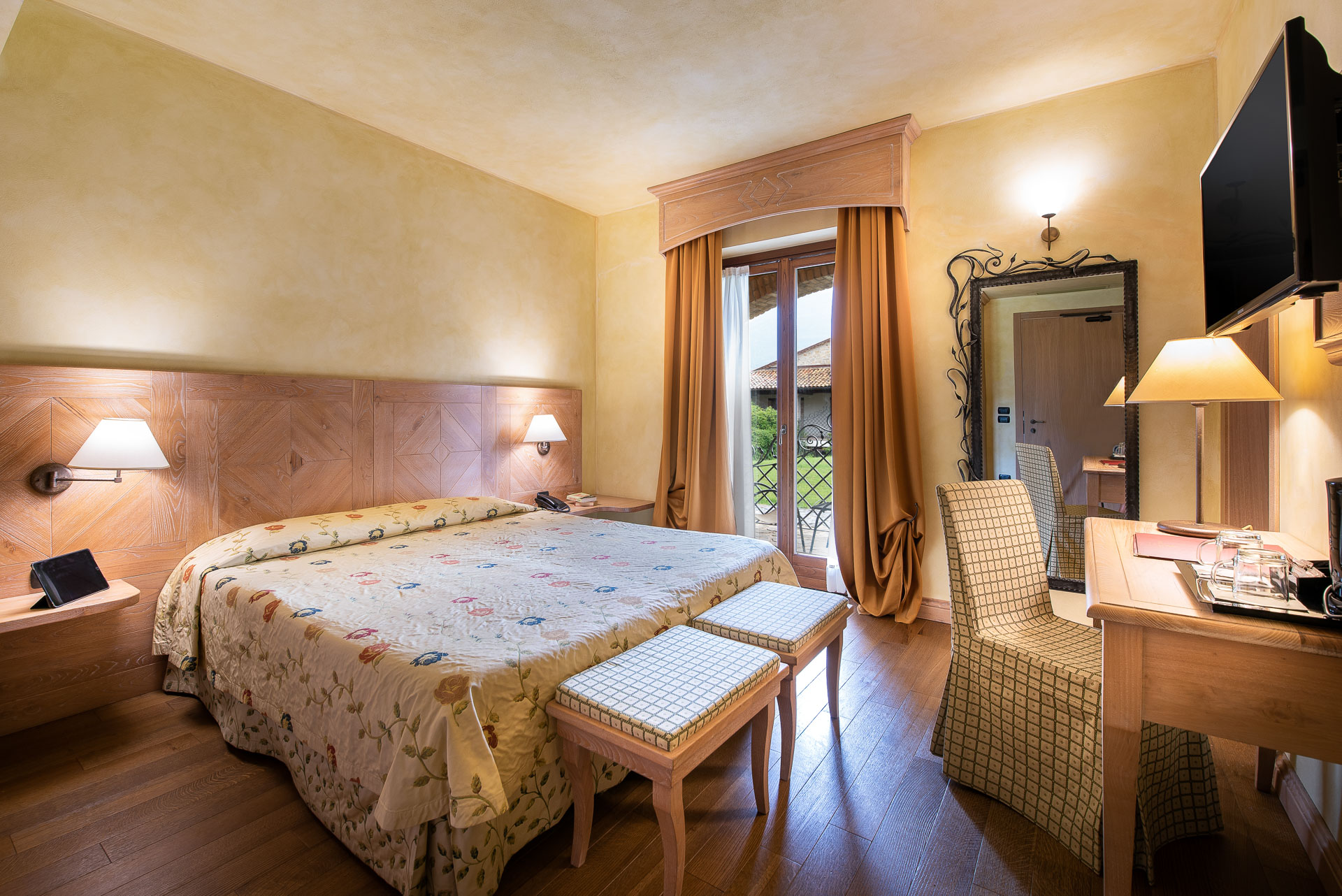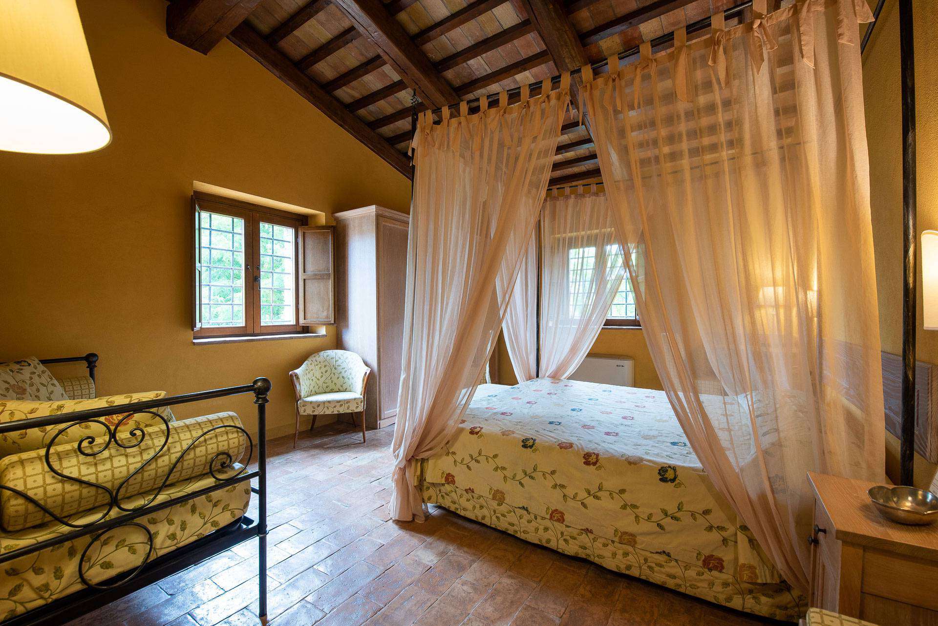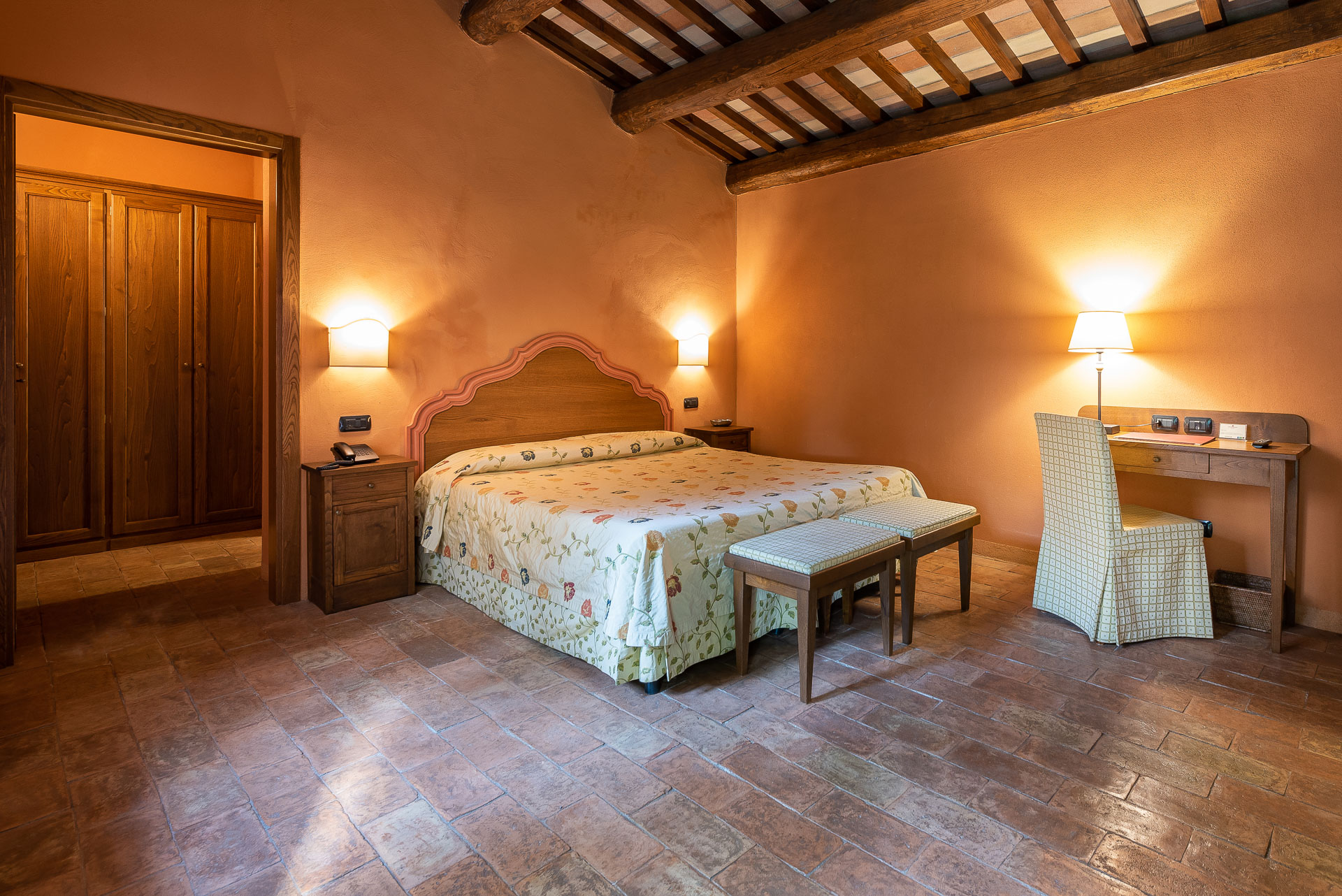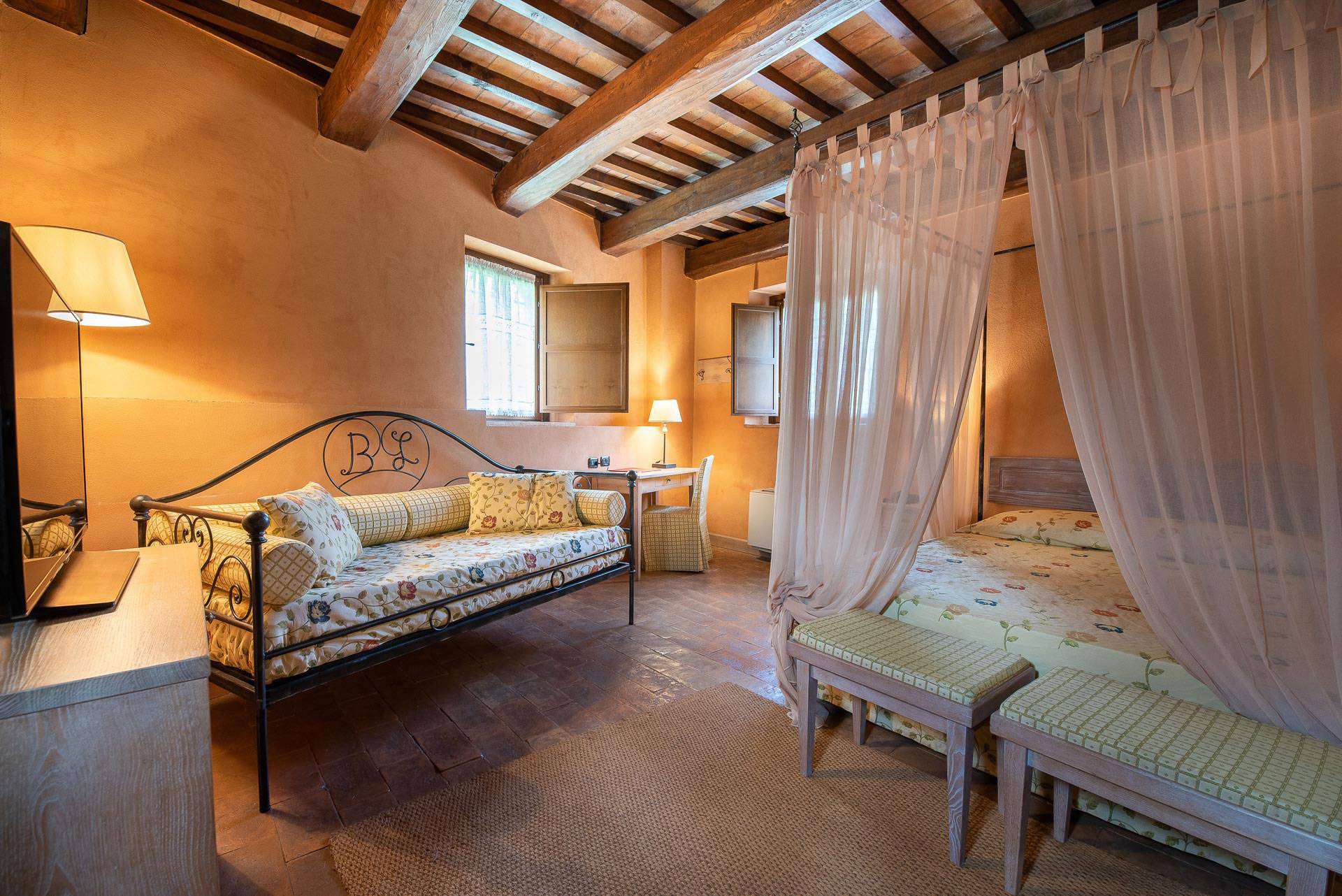 Double or twin bed, terracotta flooring and exposed wooden beams, private bathroom with bathtub or shower, independent heating/air conditioning, safe, Smart TV, and FREE Wi-Fi connection.