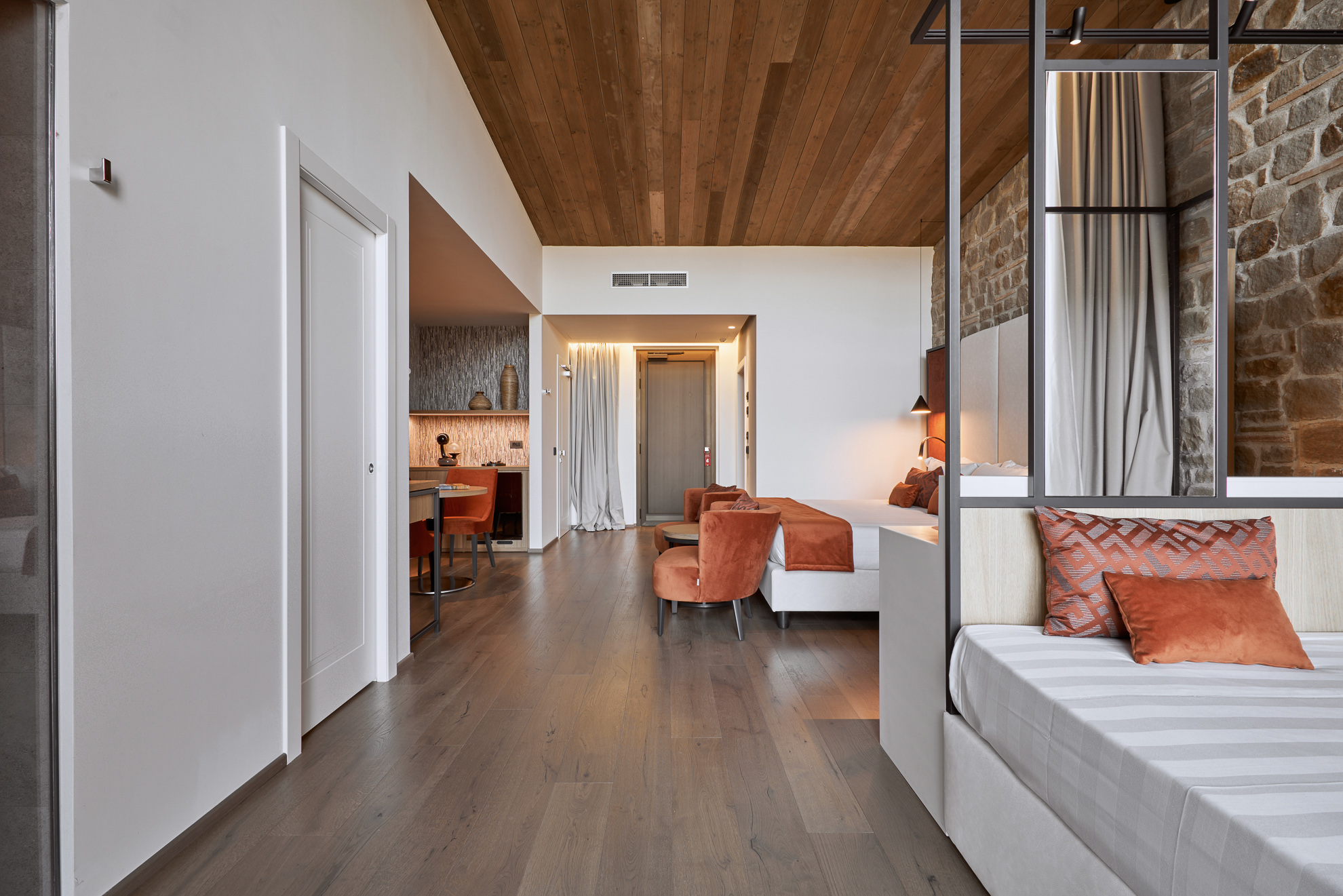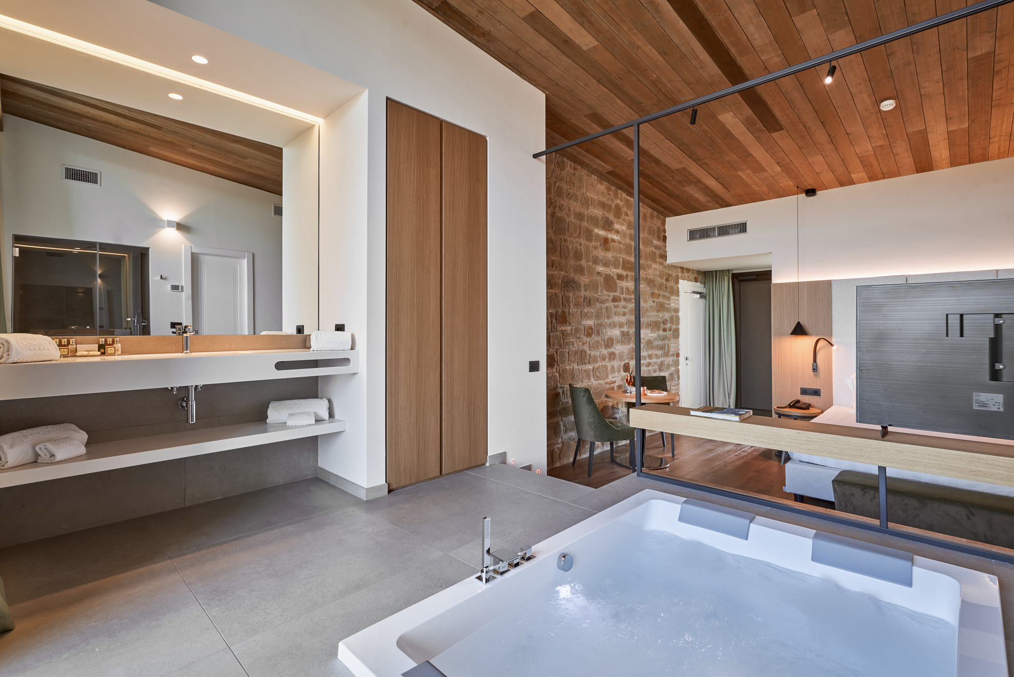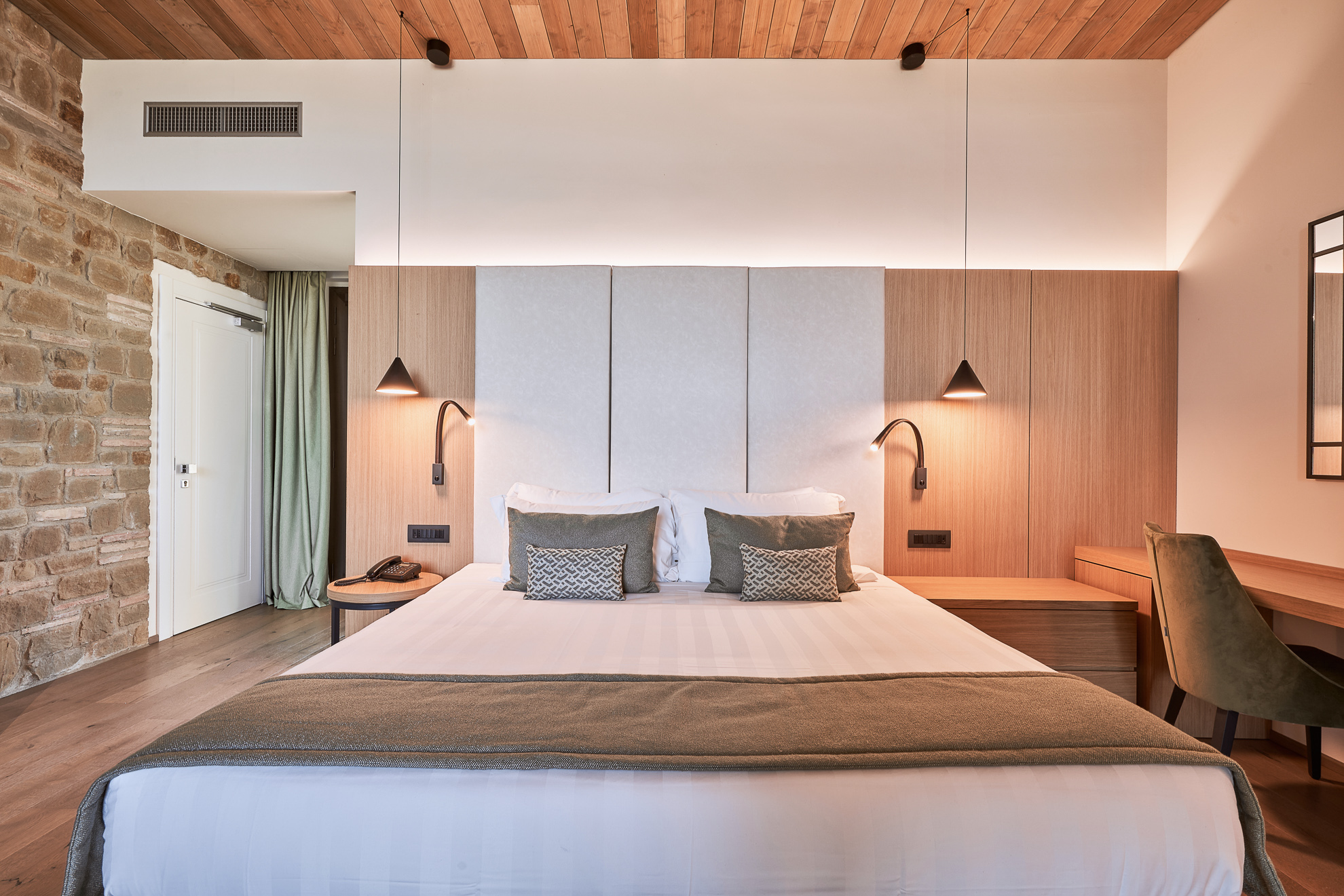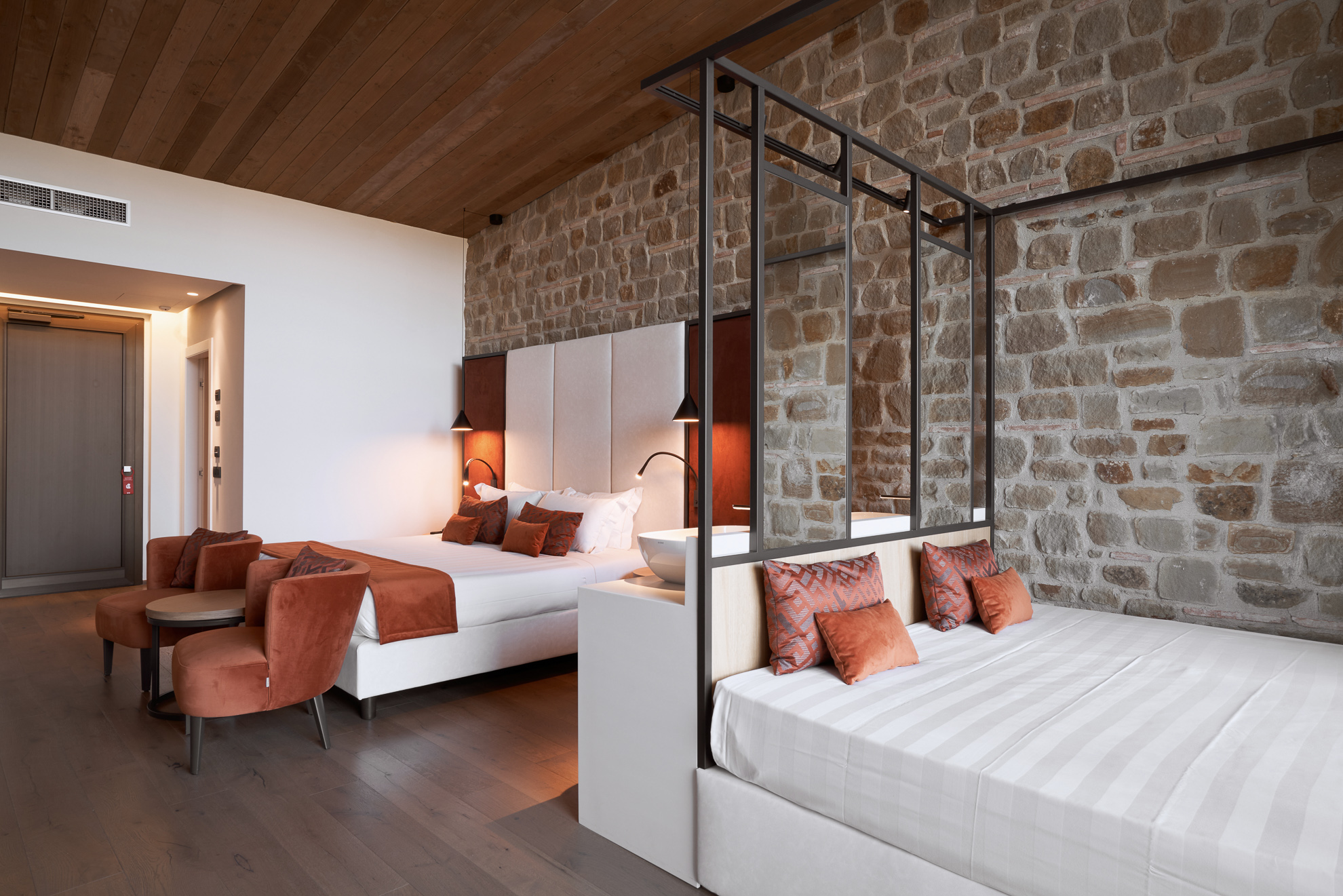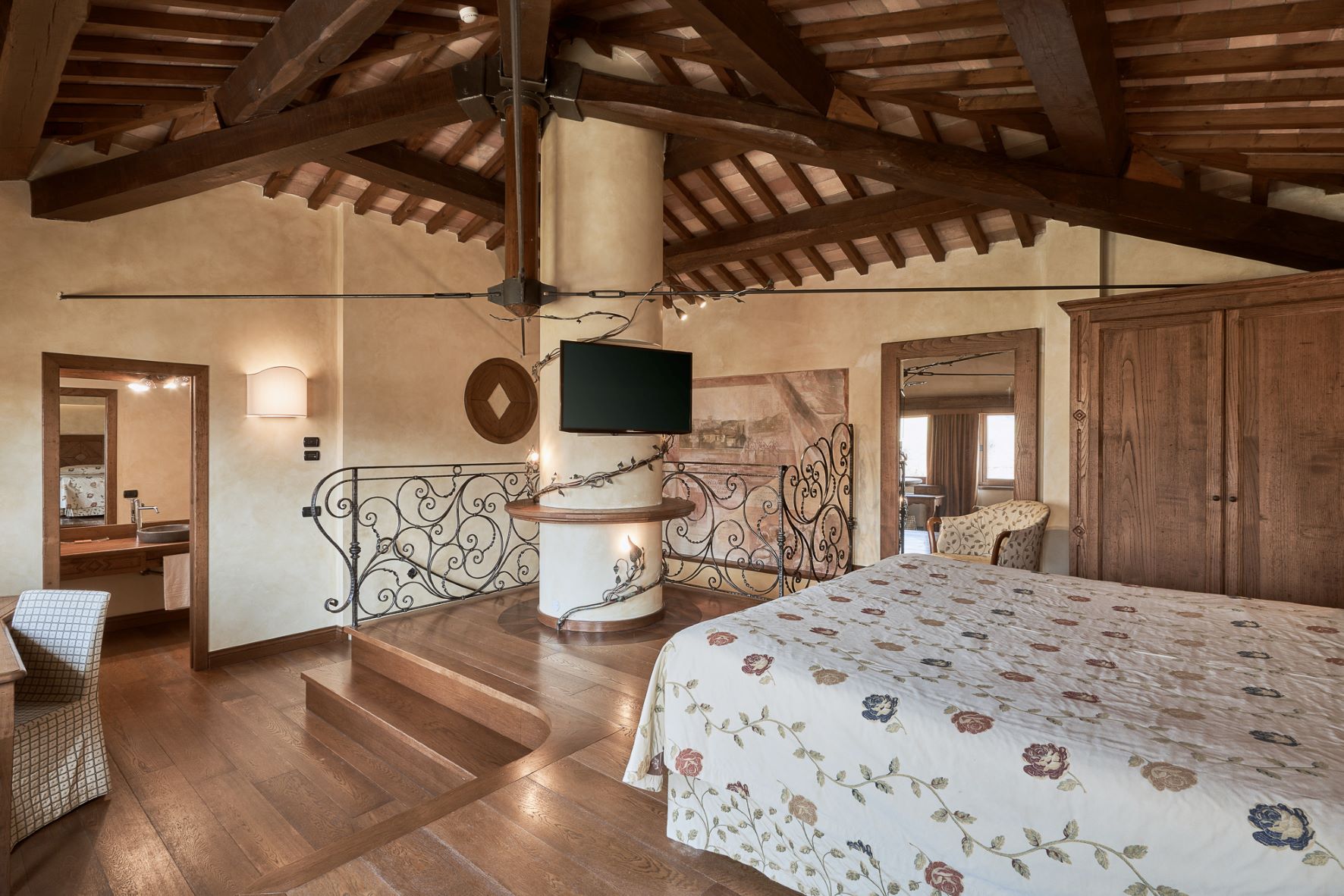 Double or twin bed, terracotta flooring and exposed wooden beams, private bathroom with bathtub or shower, independent heating/air conditioning, safe, Smart TV, and FREE Wi-Fi connection.