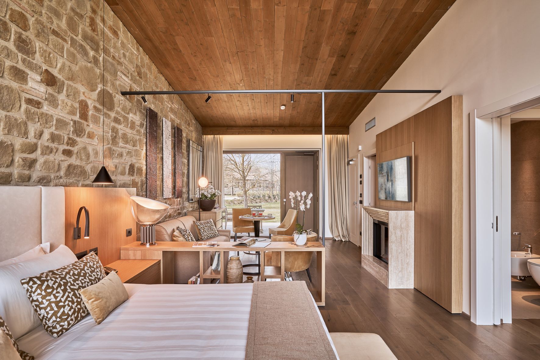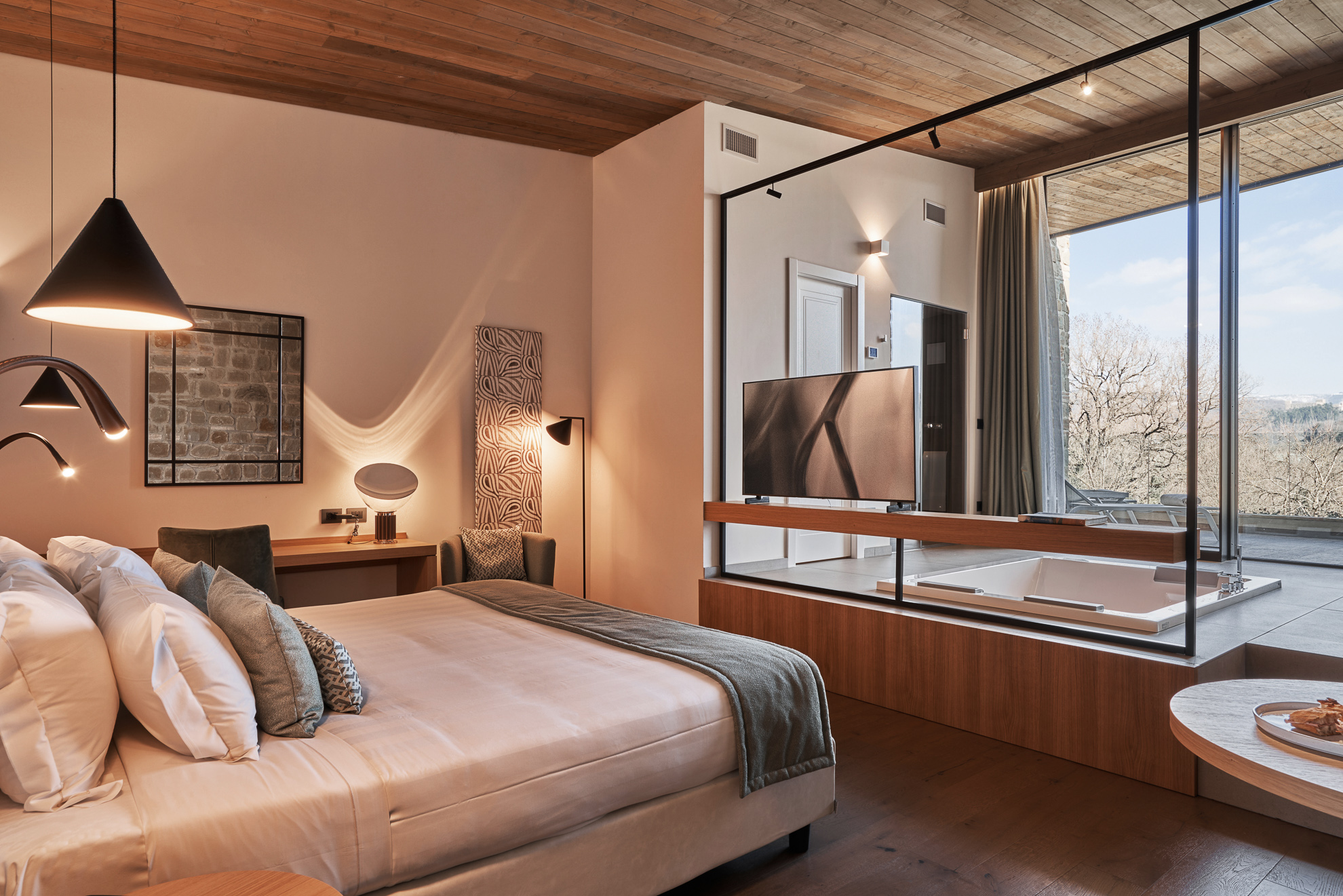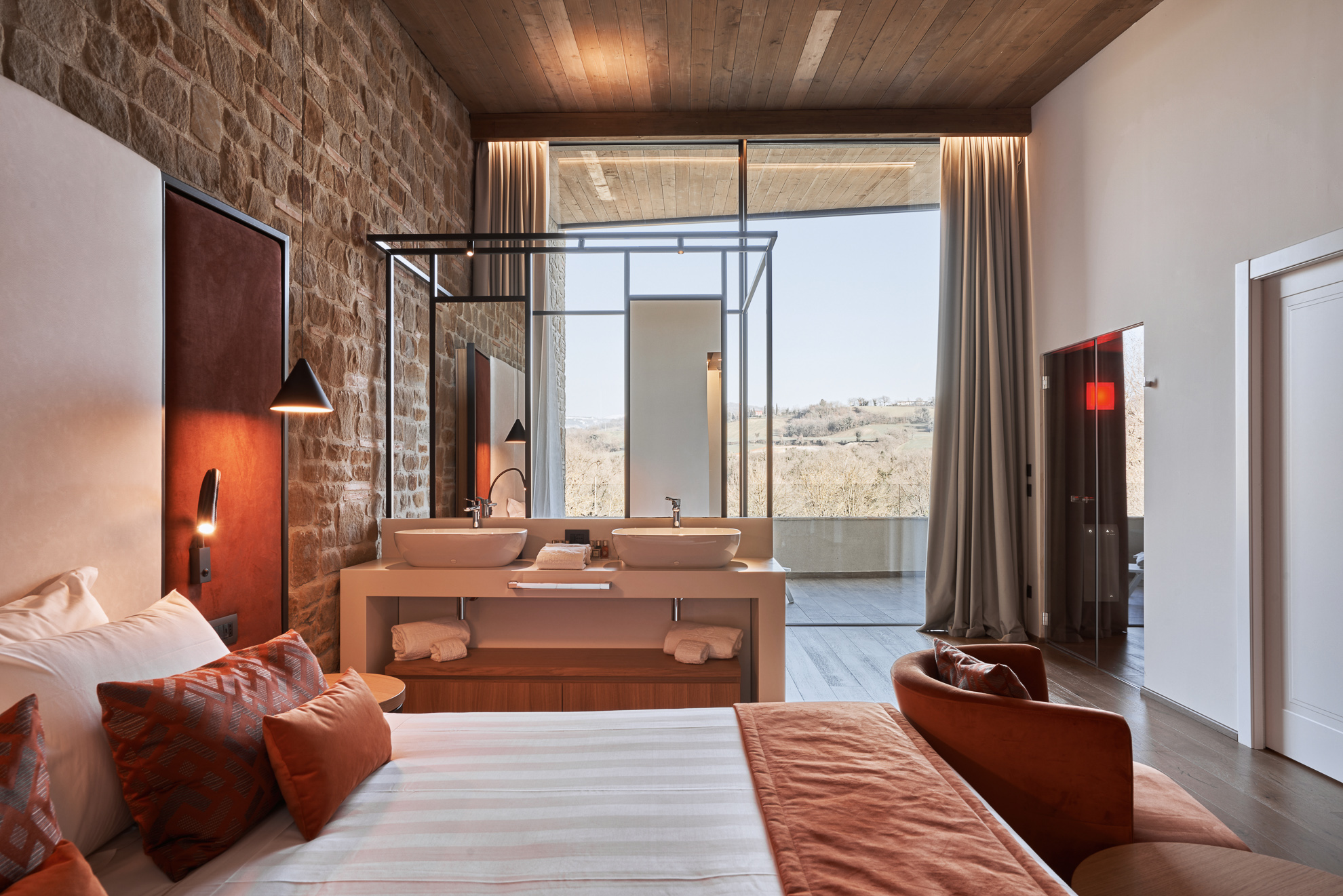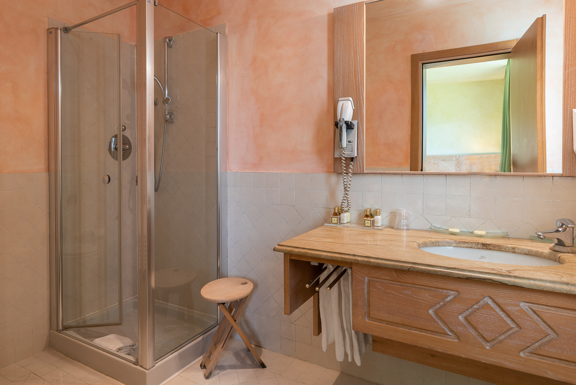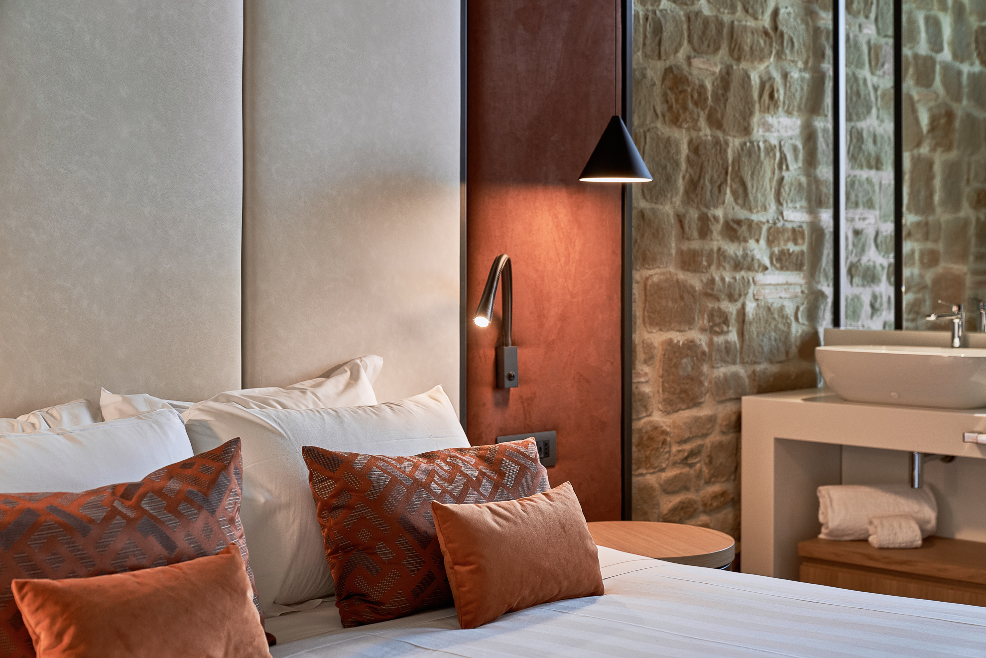 Double or twin bed, terracotta flooring and exposed wooden beams, private bathroom with bathtub or shower, independent heating/air conditioning, safe, Smart TV, and FREE Wi-Fi connection.