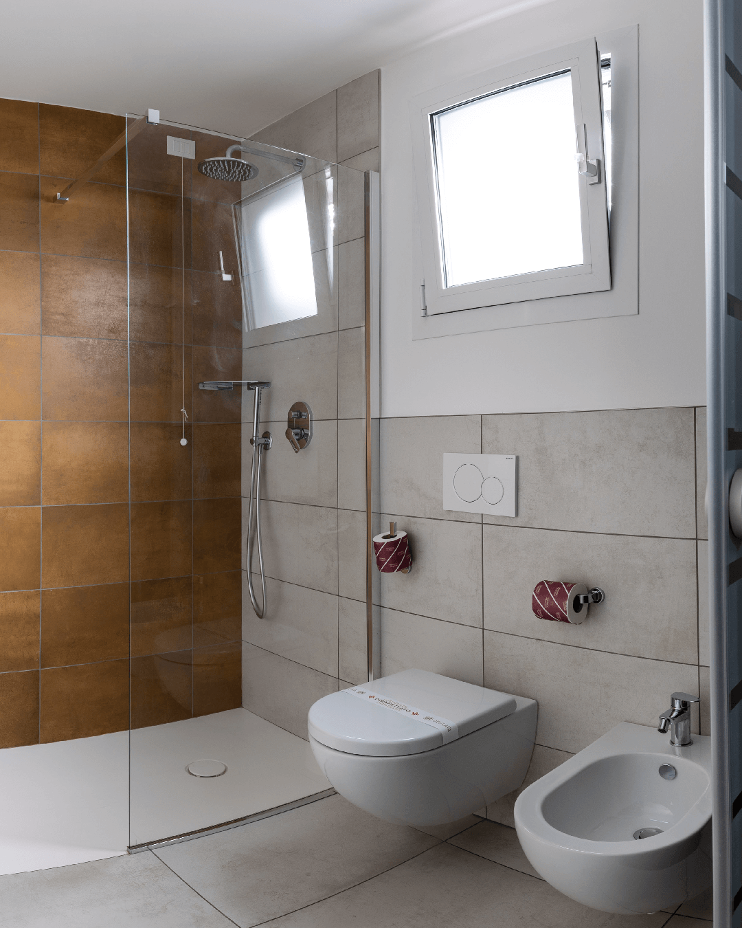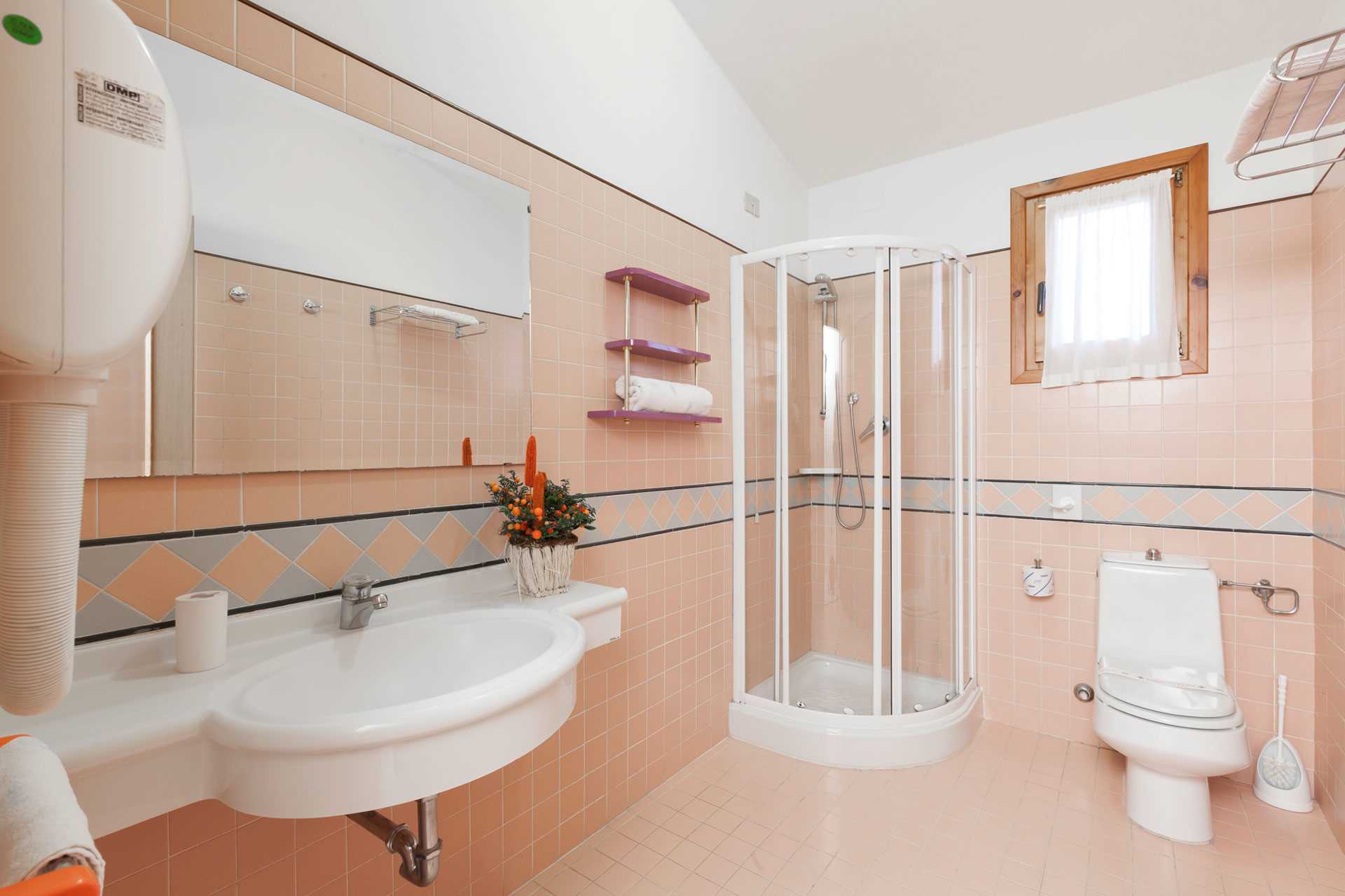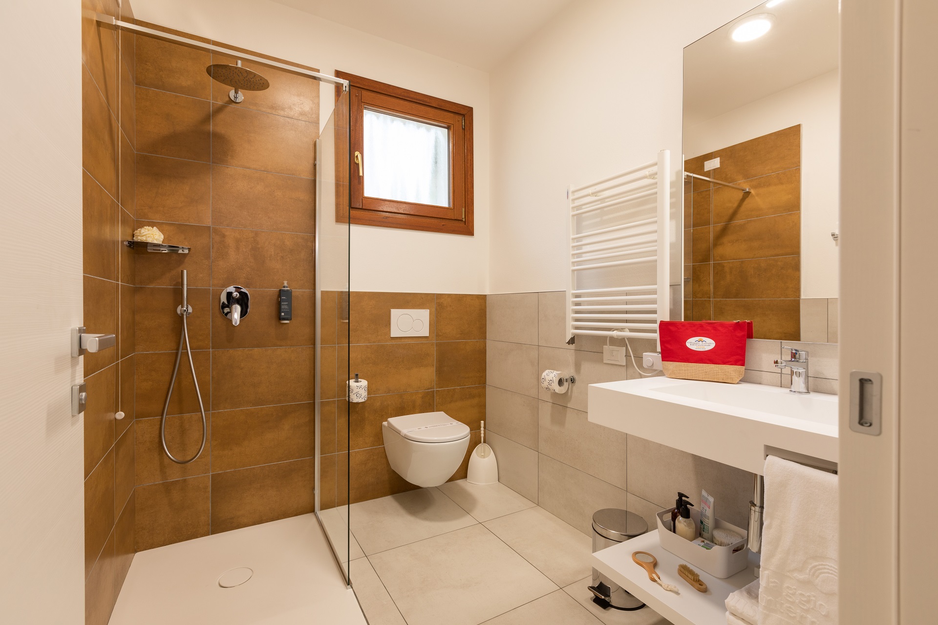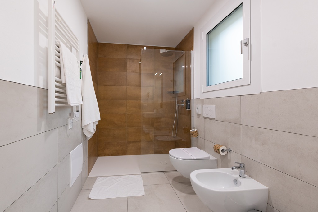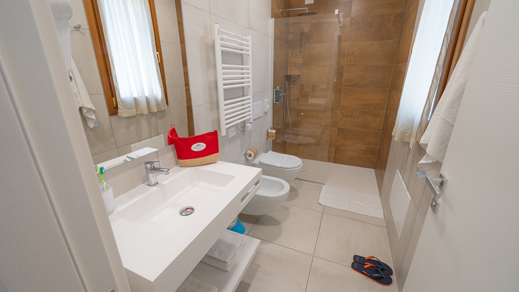 Die Villa Adria Plus ist eine großzügige, zweigeschossige Doppelhaushälfte und bietet Platz für bis zu 6 Personen. Die Räume sind so aufgeteilt, dass sie sowohl funktional als auch einladend wirken: Es gibt zwei Badezimmer mit Dusche – eines davon mit „privatem“ Zugang direkt von einem der Schlafzimmer – sowie ein großzügiges Wohnzimmer mit einem bequemen Schlafsofa.