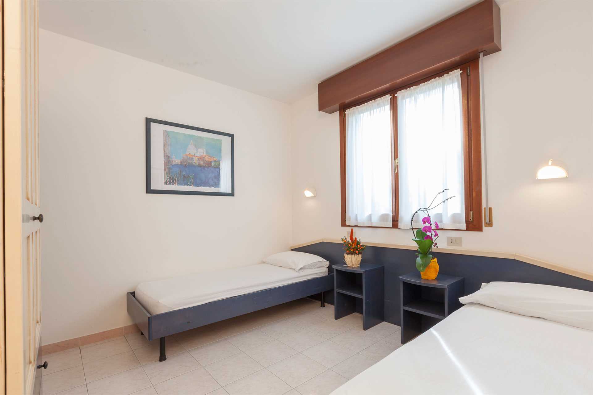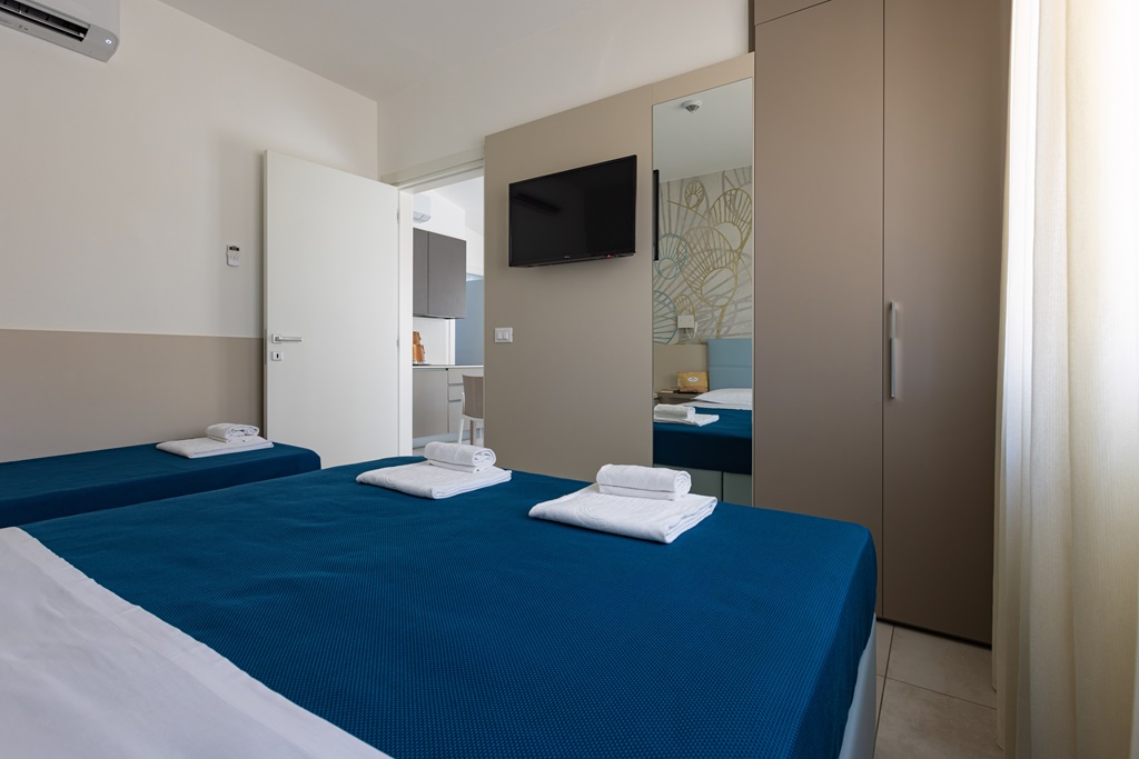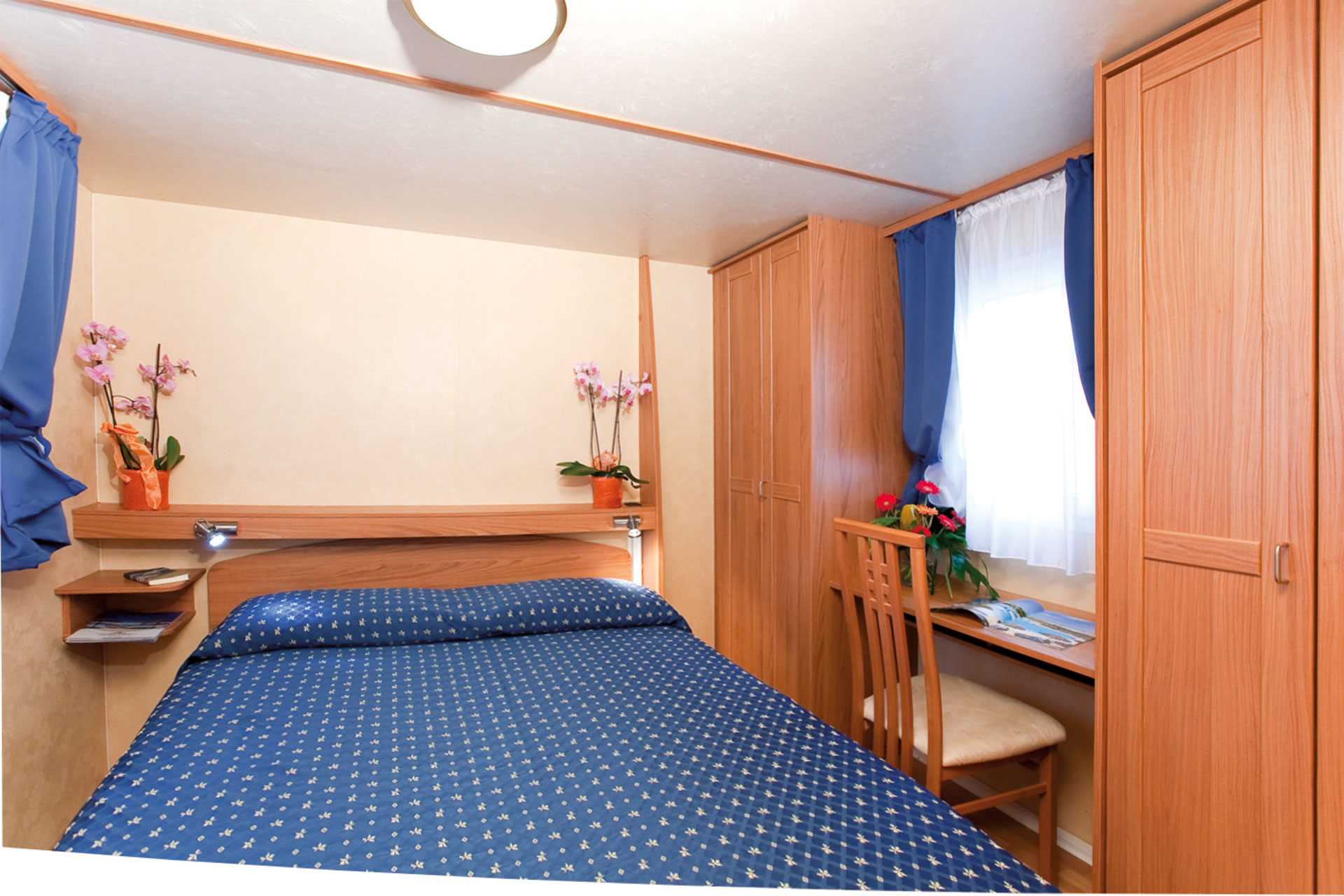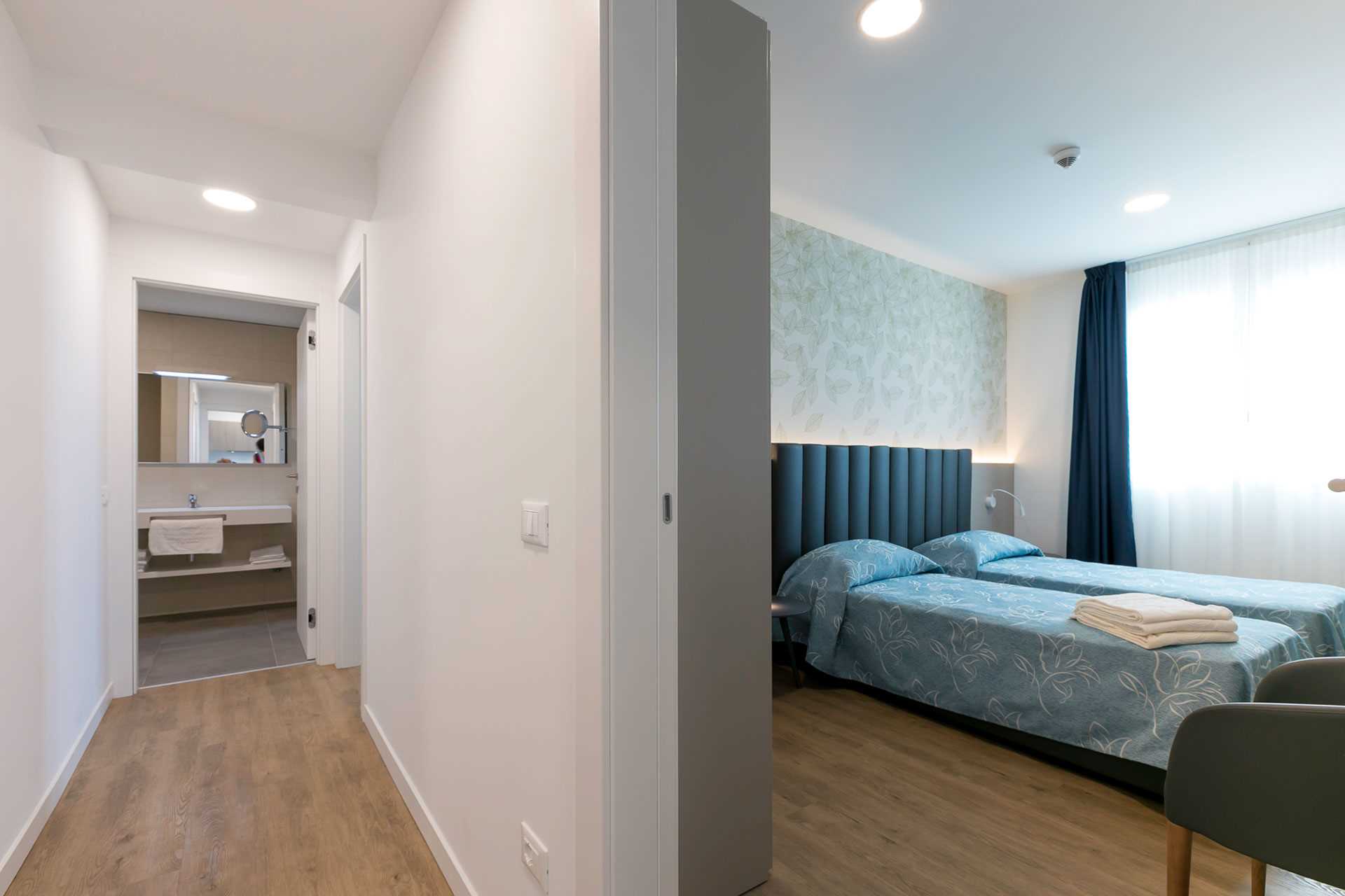 Ideal für 2-3 Personen. Zweibettzimmer mit getrennten Betten (und einem herausziehbaren 3. Bett). Kleine Kochnische mit Kühlschrank, 1 Badezimmer mit Dusche, Safe, Tv-Sat, Telefon. Die Mini-Suite ist dank des Fensters sehr hell, obwohl sie keinen Balkon hat.
