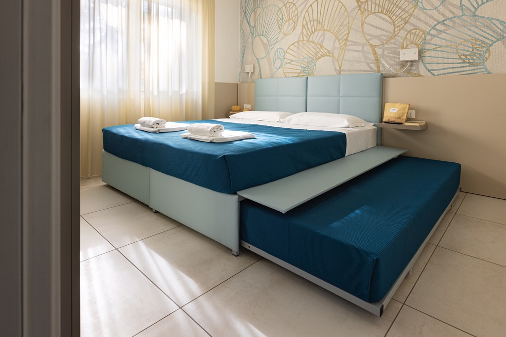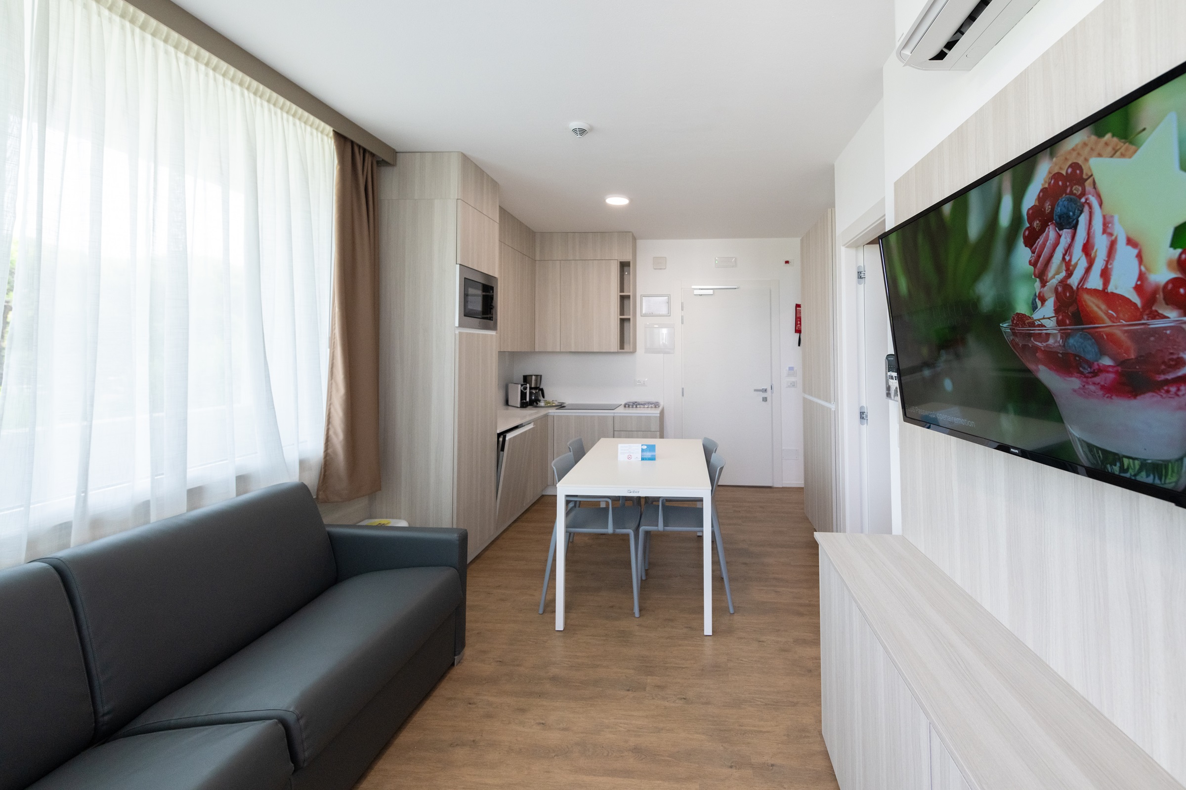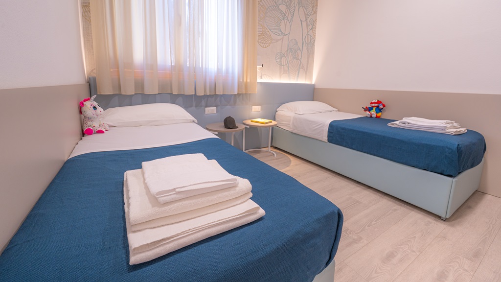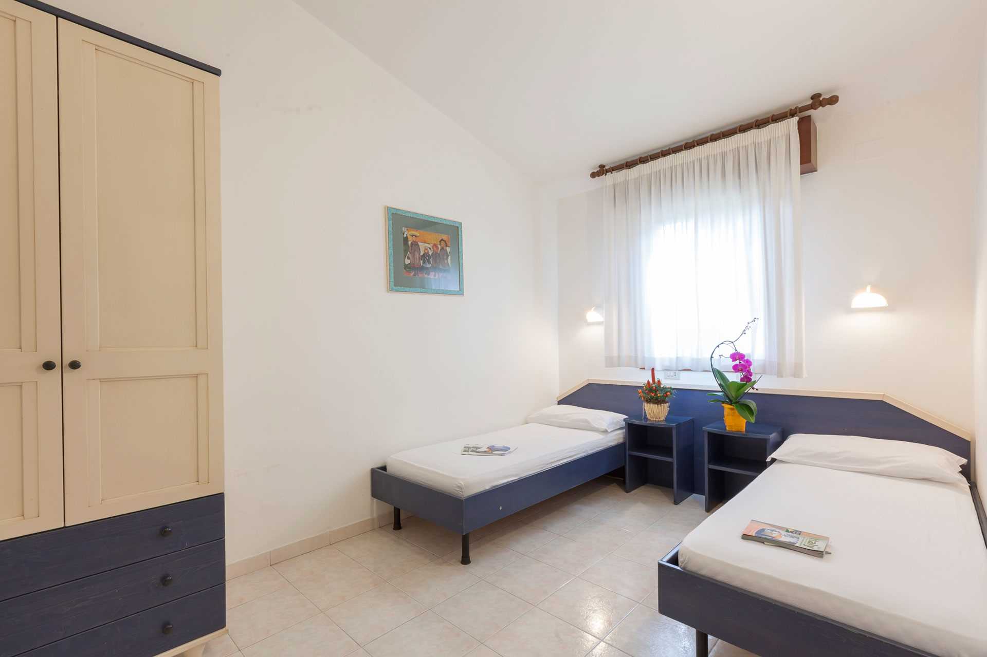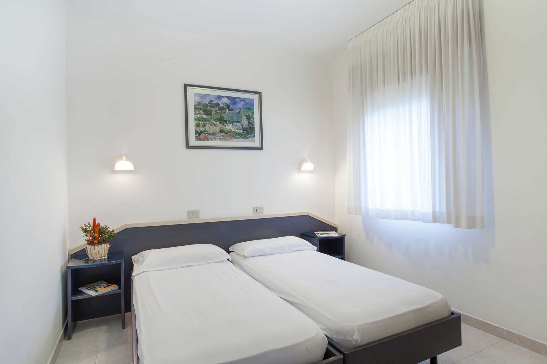 Ideal für 2-3 Personen. Zweibettzimmer mit getrennten Betten (und einem herausziehbaren 3. Bett). Kleine Kochnische mit Kühlschrank, 1 Badezimmer mit Dusche, Safe, Tv-Sat, Telefon. Die Mini-Suite ist dank des Fensters sehr hell, obwohl sie keinen Balkon hat.