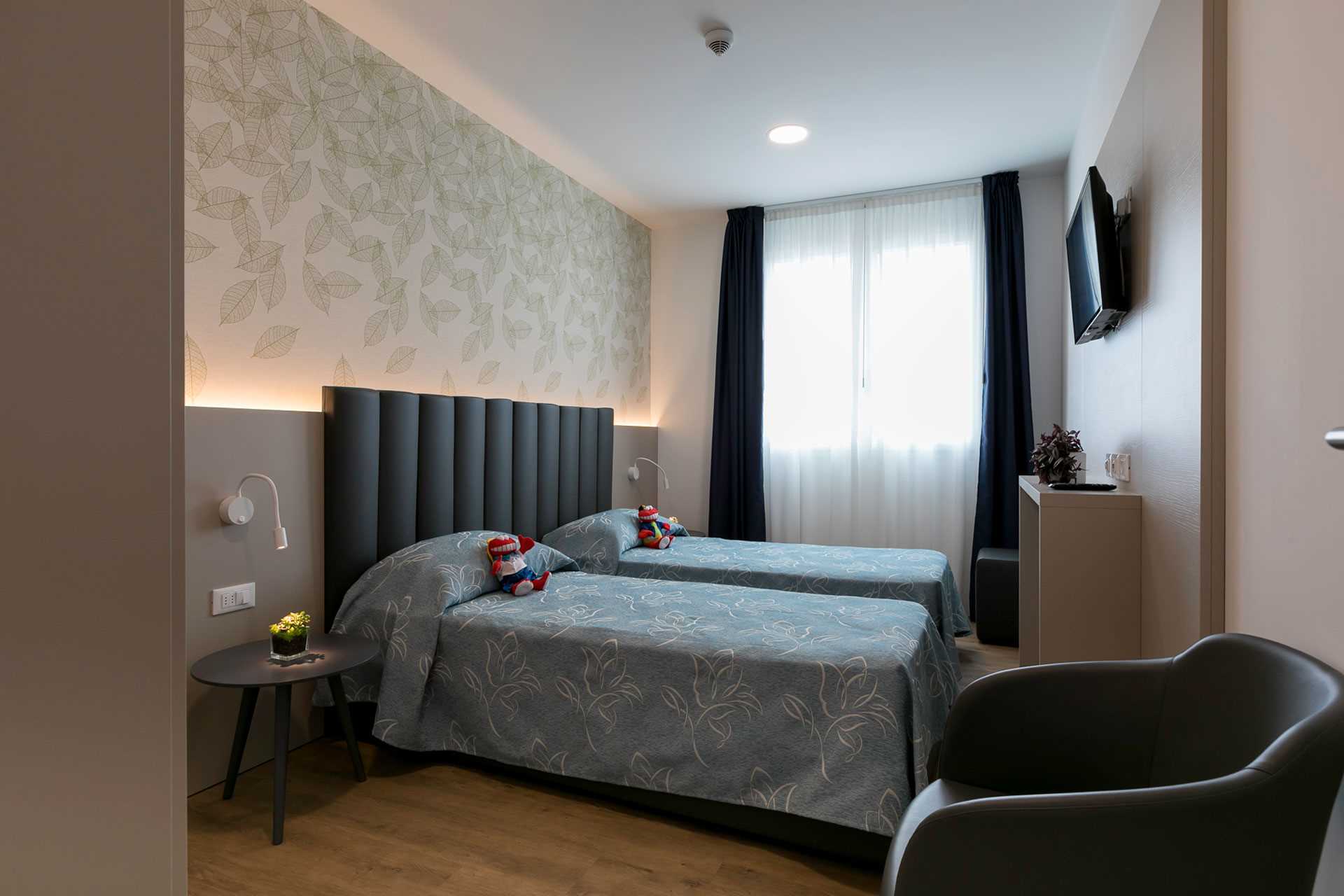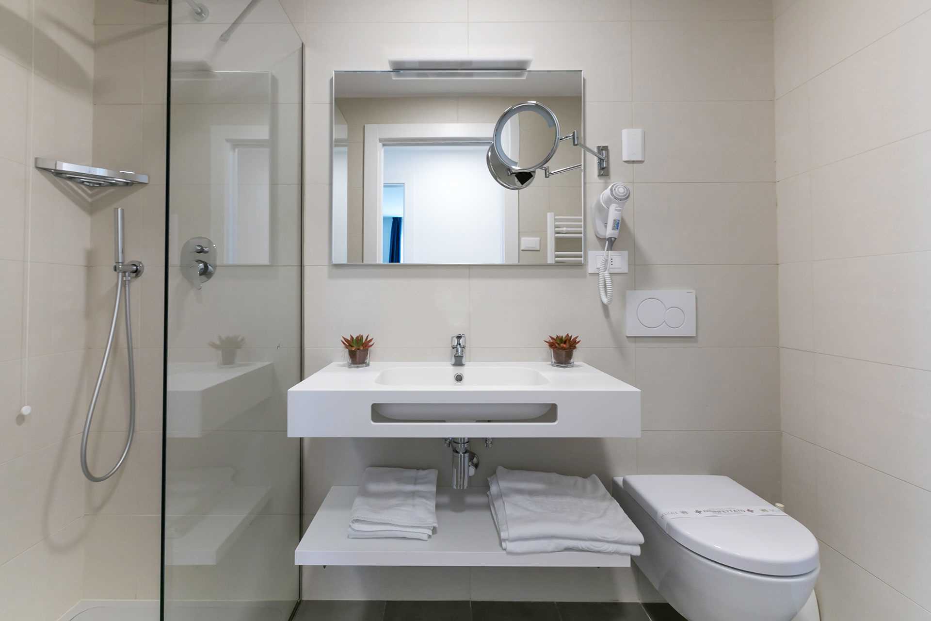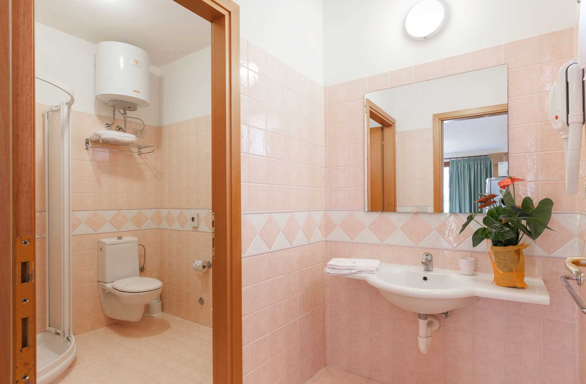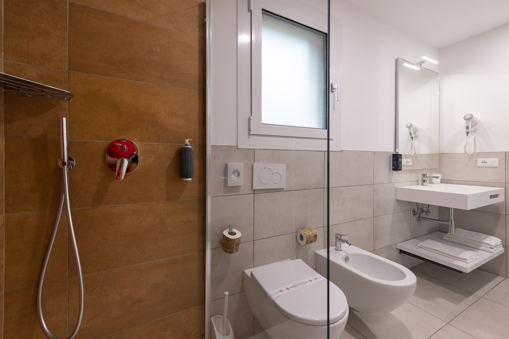Ideal für 2-3 Personen. Zweibettzimmer mit getrennten Betten (und einem herausziehbaren 3. Bett). Kleine Kochnische mit Kühlschrank, 1 Badezimmer mit Dusche, Safe, Tv-Sat, Telefon. Die Mini-Suite ist dank des Fensters sehr hell, obwohl sie keinen Balkon hat.