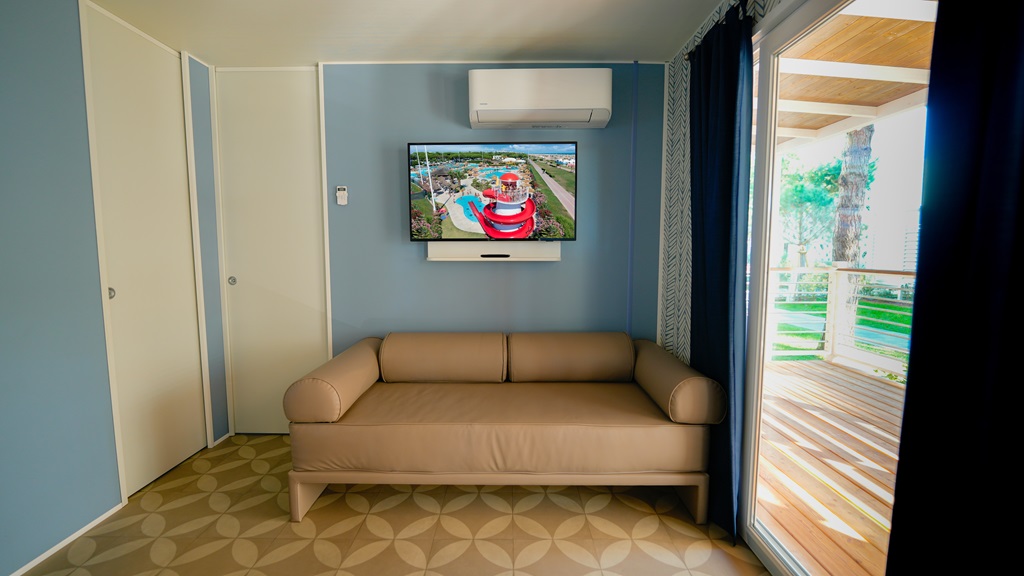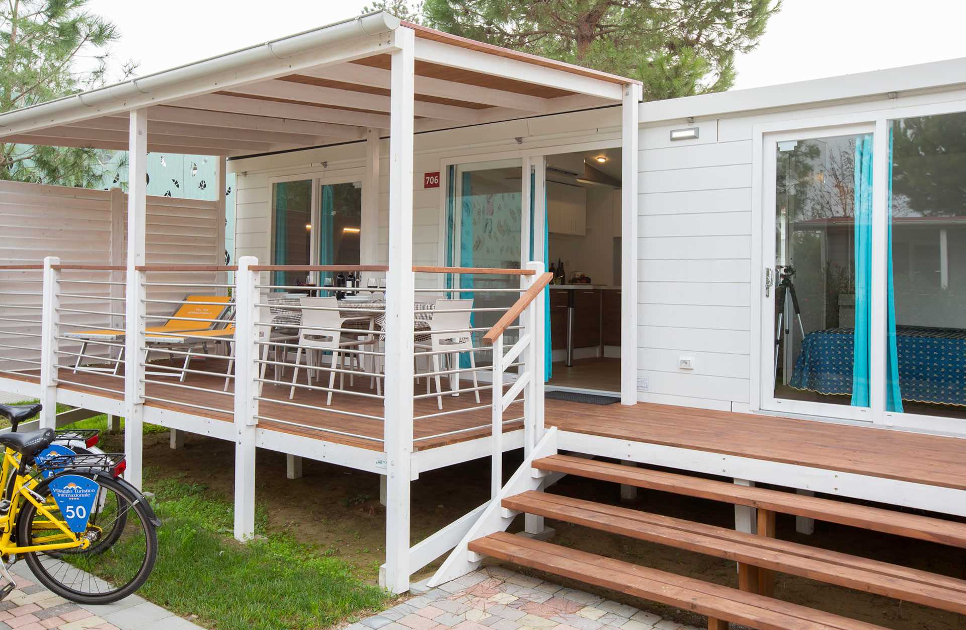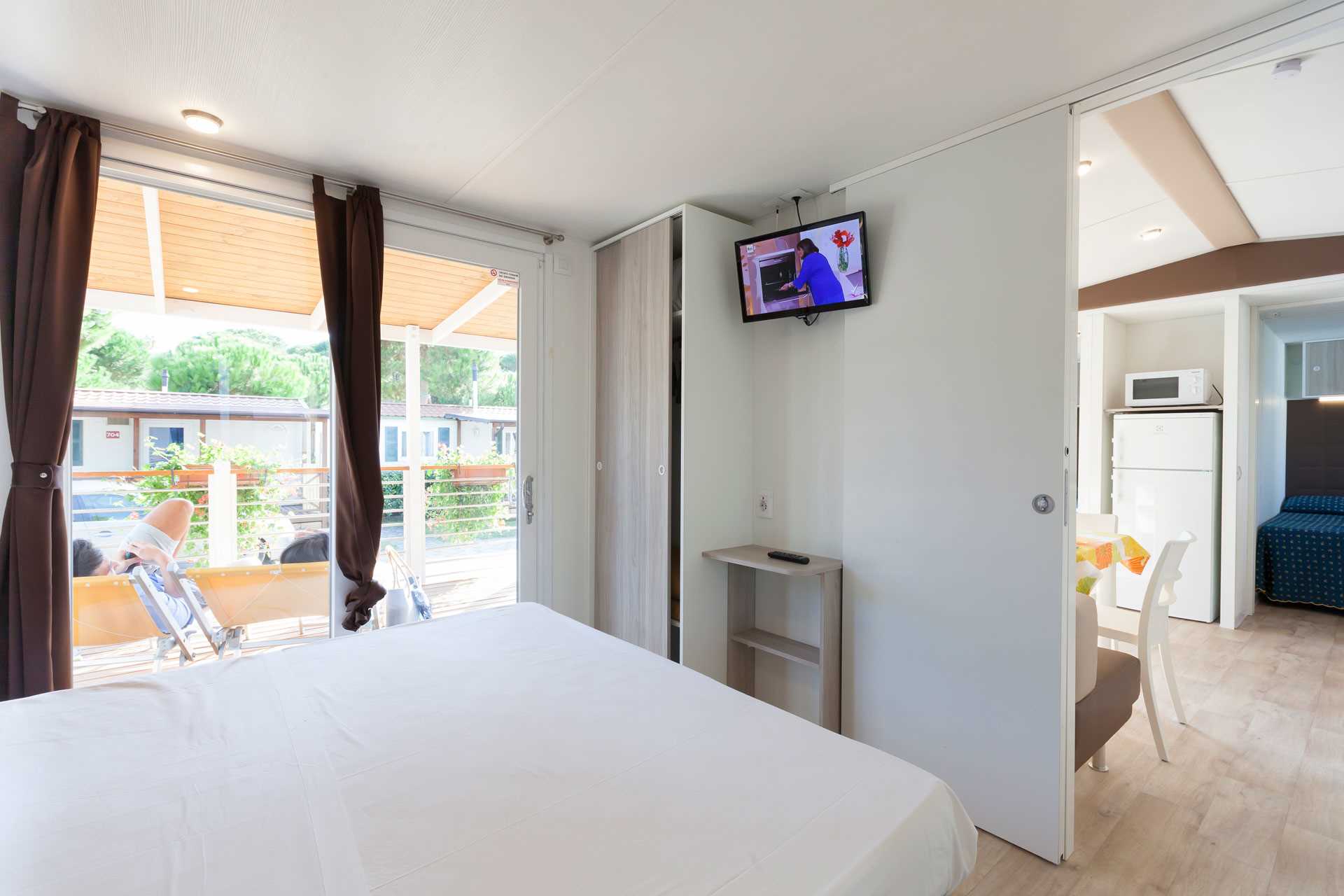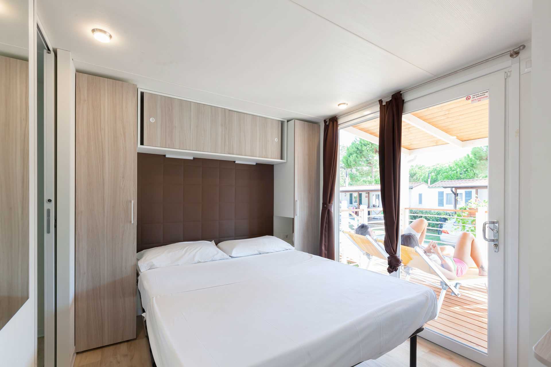 Das ist die Neuheit des Jahres 2024. Ein exklusiver Urlaub, nur wenige Einheiten verfügbar, in einer ruhigen Zone ohne häufige Passanten, wird ein unvergleichliches Erlebnis sein. Das Mobilhome Family wurde von Crippa Concept exklusiv für das Villaggio Turistico Internazionale entworfen und wird die Unterkünfte Nummer 801 bis 807 ersetzen. Das Hauptschlafzimmer verfügt über eine gemütliche Sitzecke und eine Schiebetür, durch die sich die Wohnung in einen großen Open Space verwandeln lässt. Die Veranda, die geräumiger ist als die anderen Mobilheime, bietet einen raffinierten und einzigartigen Platz im Freien.