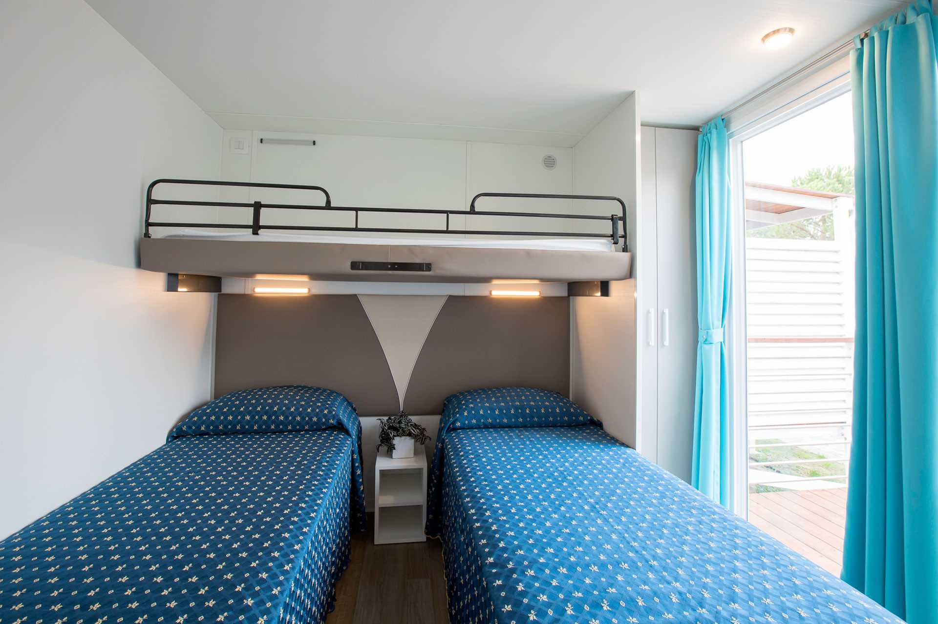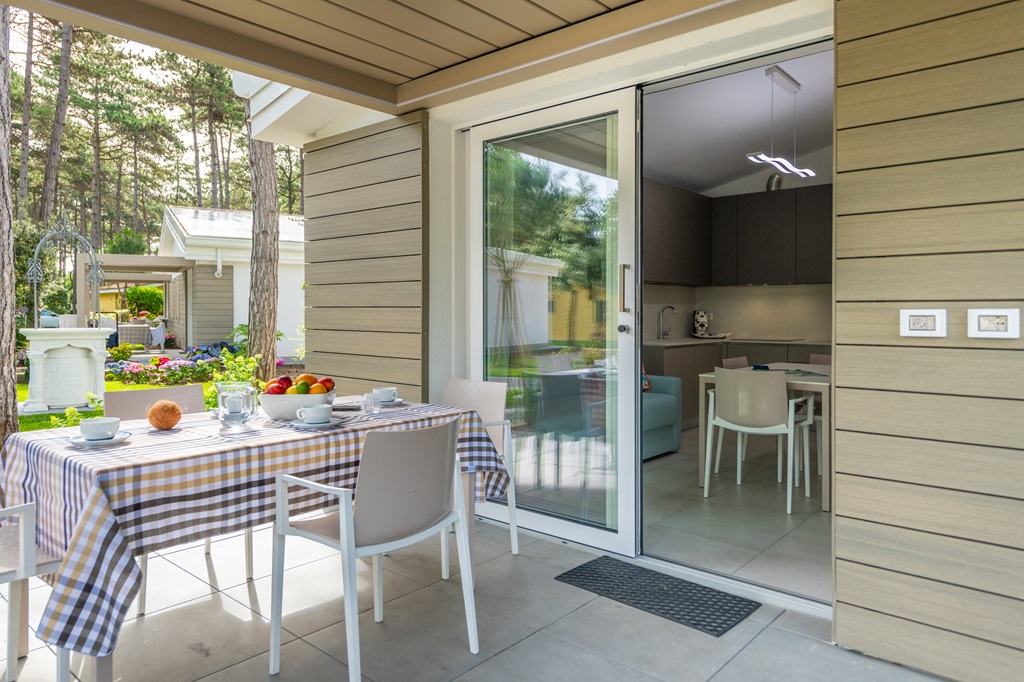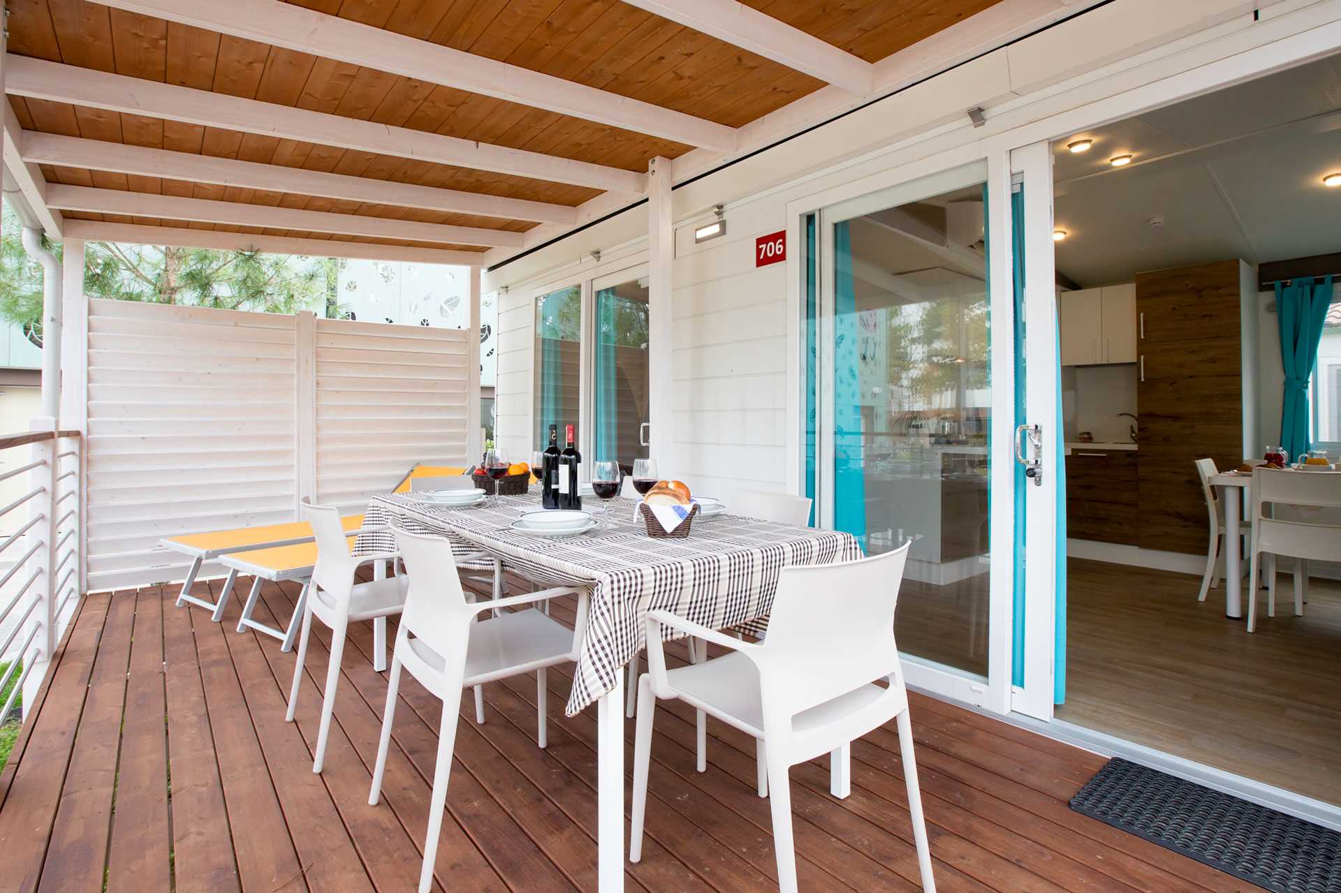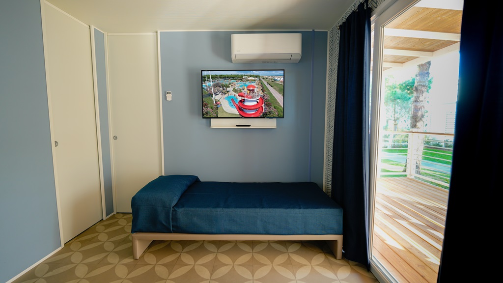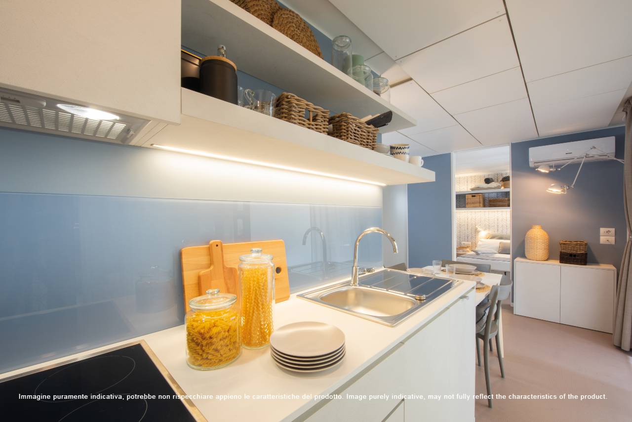 Das ist die Neuheit des Jahres 2024. Ein exklusiver Urlaub, nur wenige Einheiten verfügbar, in einer ruhigen Zone ohne häufige Passanten, wird ein unvergleichliches Erlebnis sein. Das Mobilhome Family wurde von Crippa Concept exklusiv für das Villaggio Turistico Internazionale entworfen und wird die Unterkünfte Nummer 801 bis 807 ersetzen. Das Hauptschlafzimmer verfügt über eine gemütliche Sitzecke und eine Schiebetür, durch die sich die Wohnung in einen großen Open Space verwandeln lässt. Die Veranda, die geräumiger ist als die anderen Mobilheime, bietet einen raffinierten und einzigartigen Platz im Freien.