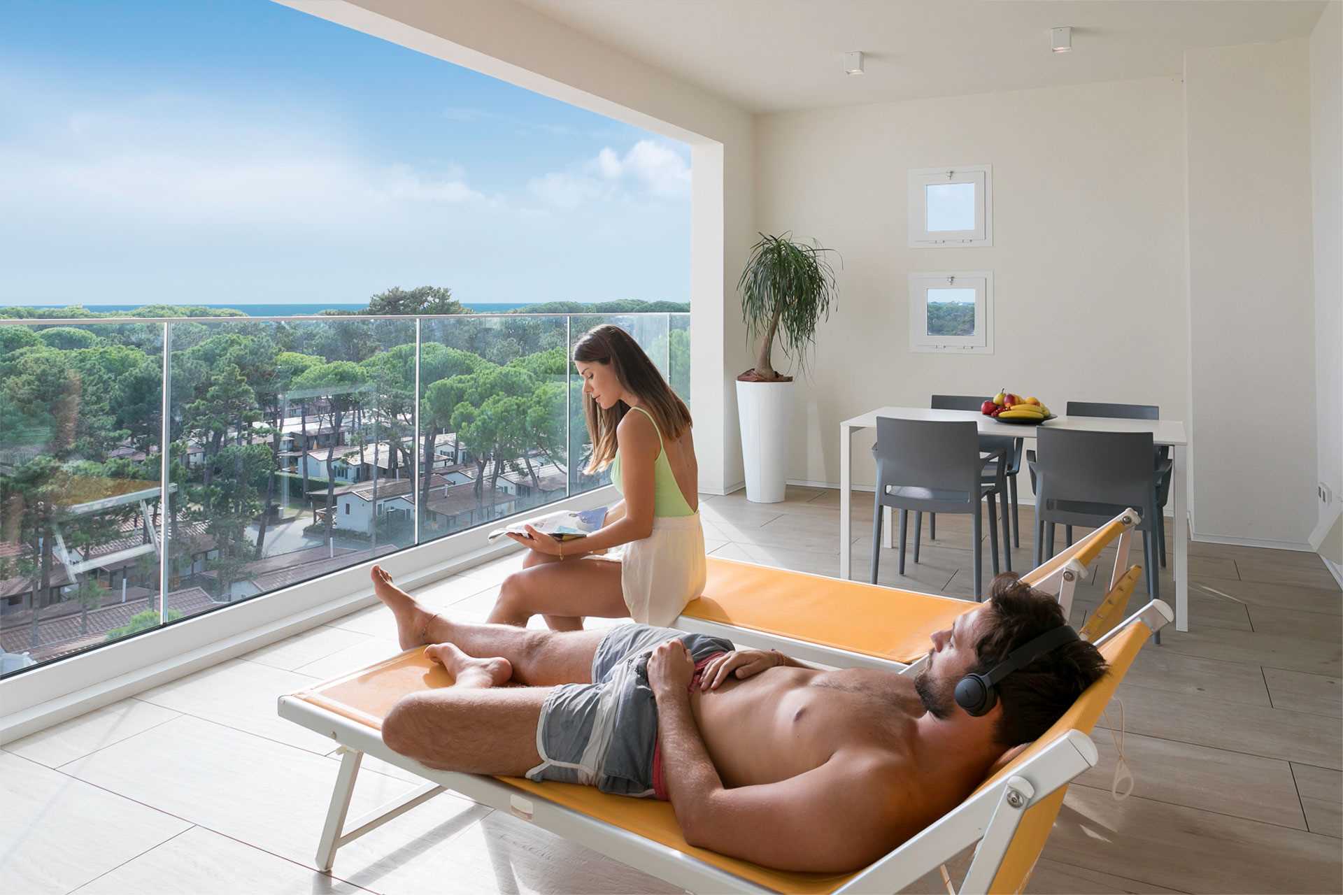 Die Maxi Suite Platinum befinden sich im 3. und 4. Stock eines Wohngebäudes innerhalb des Villaggio Turistico Internazionale, nur 300 Meter vom Strand entfernt. Zu Ihrer Verfügung finden Sie ein modernes Apartment mit zwei Schlafzimmern, zwei Bädern und eleganten Möbeln, in dem jedes Detail so gestaltet ist, dass Ihr Aufenthalt unvergesslich und komfortabel wird. Bewundern Sie die Aussicht von der Maxi-Terrasse, von der Sie das Panorama sehen und Sie Ihre wohlverdiente Entspannung genießen können! Ideal auch für größere Familien.
