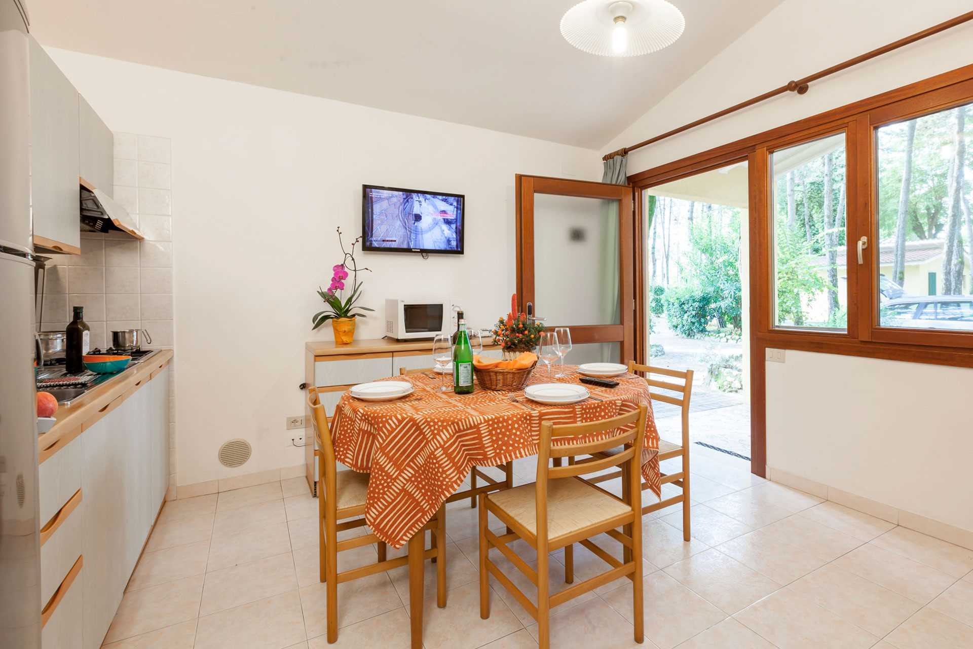 1/6 Schlafgelegenheiten, 1 Schlafzimmer mit einem Doppelbett (200cmx 160cm), 1 Dreibettzimmer mit zwei getrennten Betten (200cm x 80cm per Bett) und ein Stockbett (190cm x 70cm), 1 Wohnzimmer/Kochnische mit 1 Einzelschlafcouch, Kochnische mit 4 Feuerstellen, Geschirr und Kücheneinrichtung, Mikrowellenofen, Wasserkocher, Kühlschrank mit separatem Gefrierfach, Spülmaschine, 1 Badezimmer mit Dusche, Safe, LCD Tv-Sat, Telefon. Holzveranda, Kunststofftisch mit 6 Stühlen