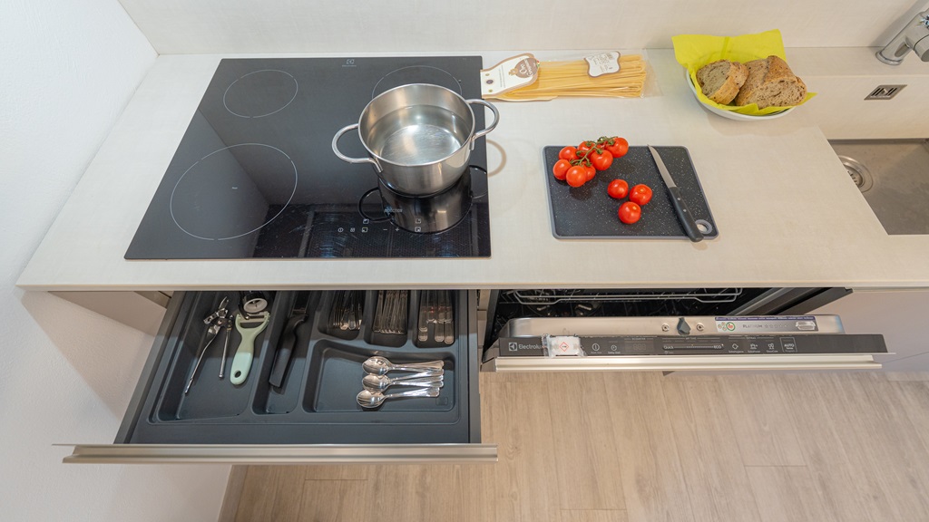 1 Zweibettzimmer (Betten können zu einem Doppelbett zusammenschieben werden), 1 Badezimmer mit Whirlpool-Dusche, Wohnzimmer mit Doppelschlafsofa und voll ausgestatteter Kochnische mit Induktionsherd, Pfannen und Küchenutensilien, Mikrowelle, Wasserkocher, Kühlschrank mit separatem Gefrierfach , Spülmaschine, Safe, TV-Sat LCD, Telefon, MaxiTerrasse.