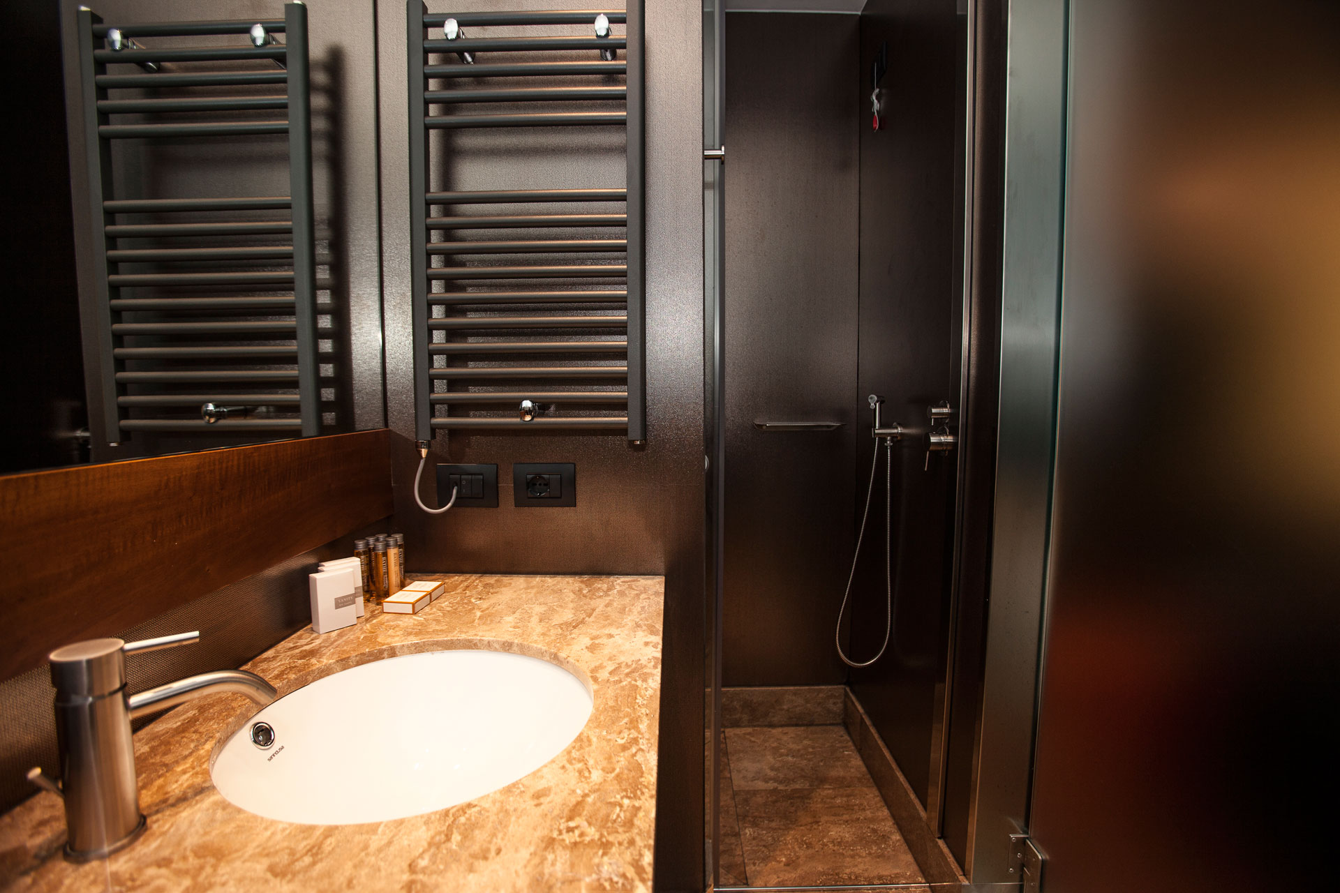 The exclusive touch is represented by the white freestanding ceramic bathtub, which stands out thanks to its refined contrast with the dark marble finishes, offering guests a pure relaxation experience.