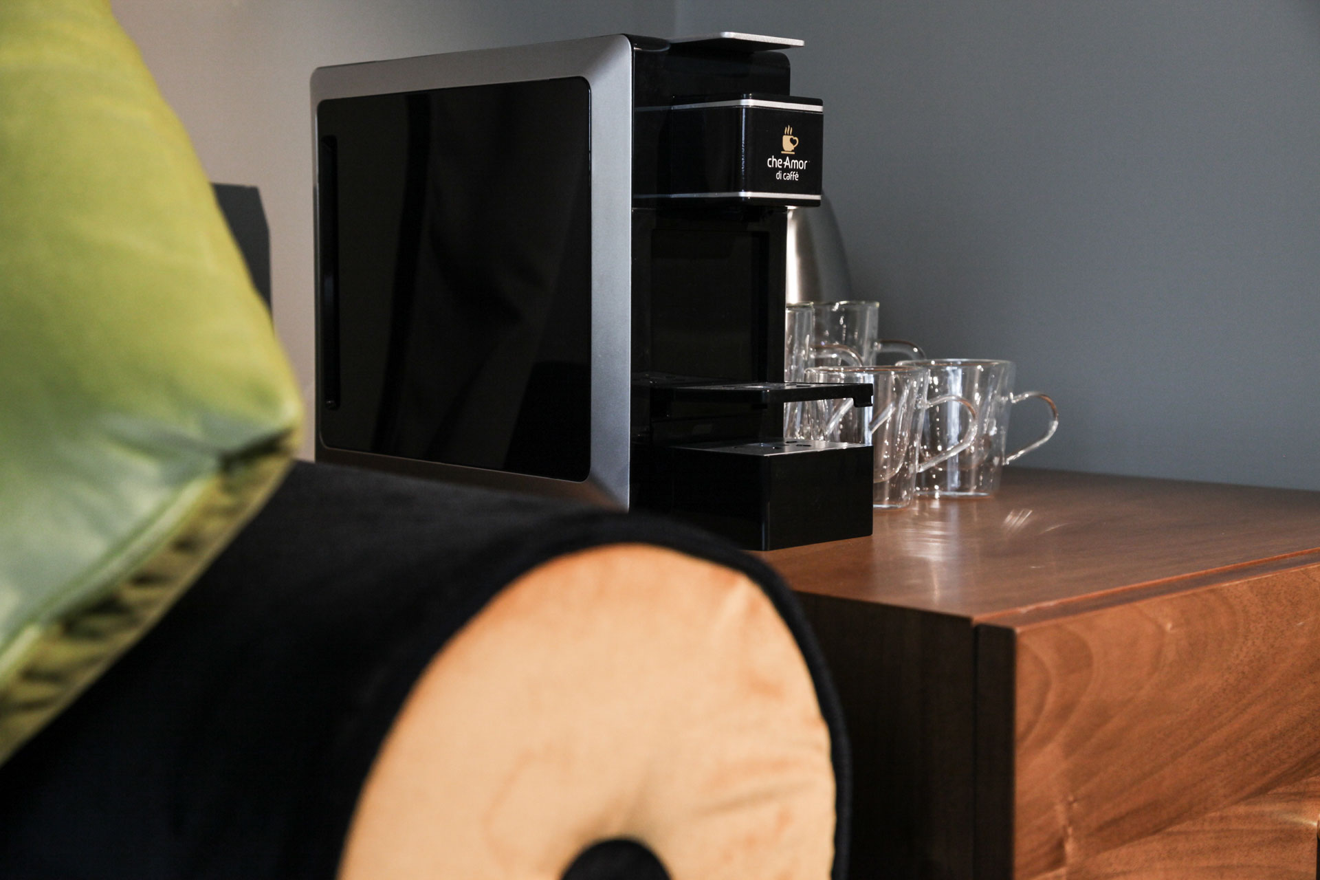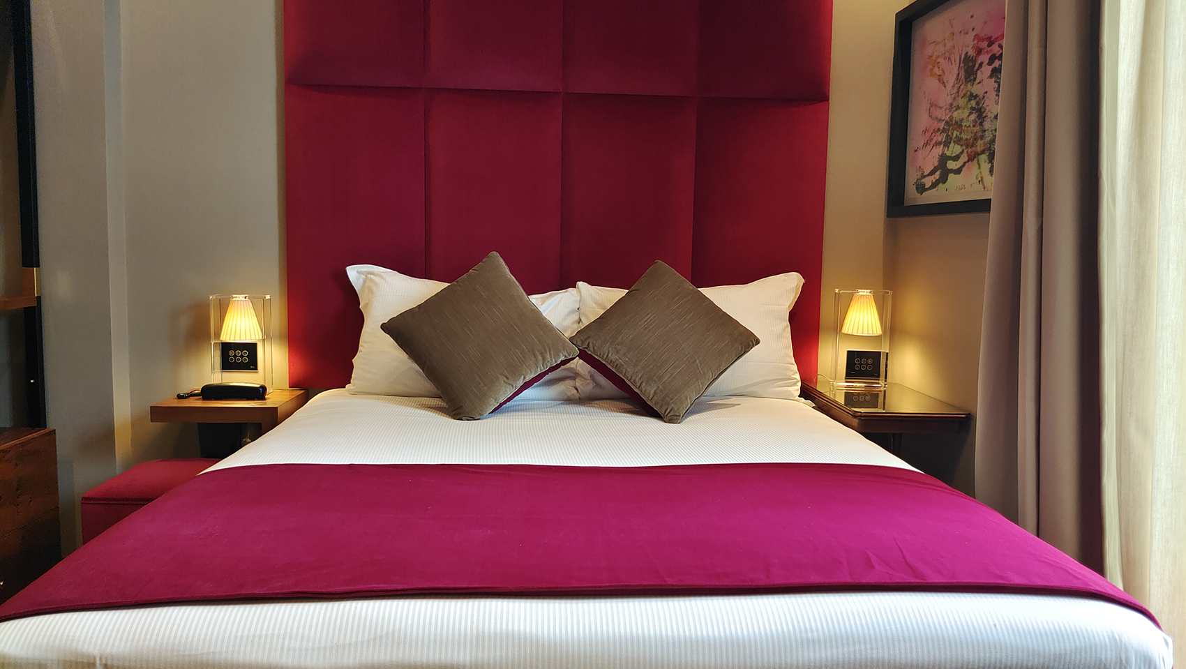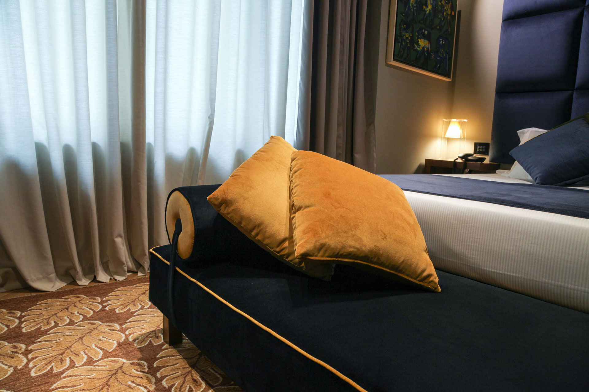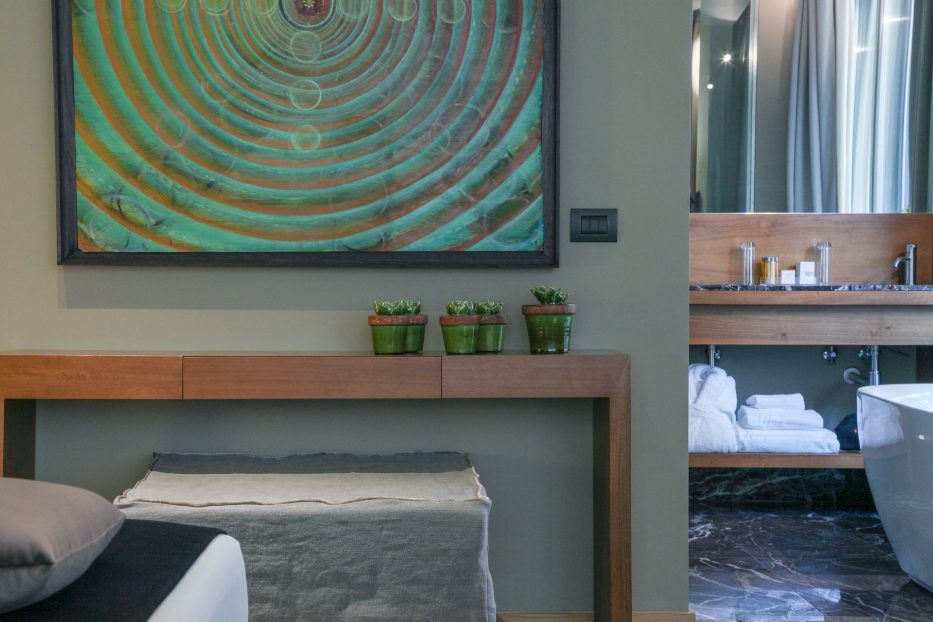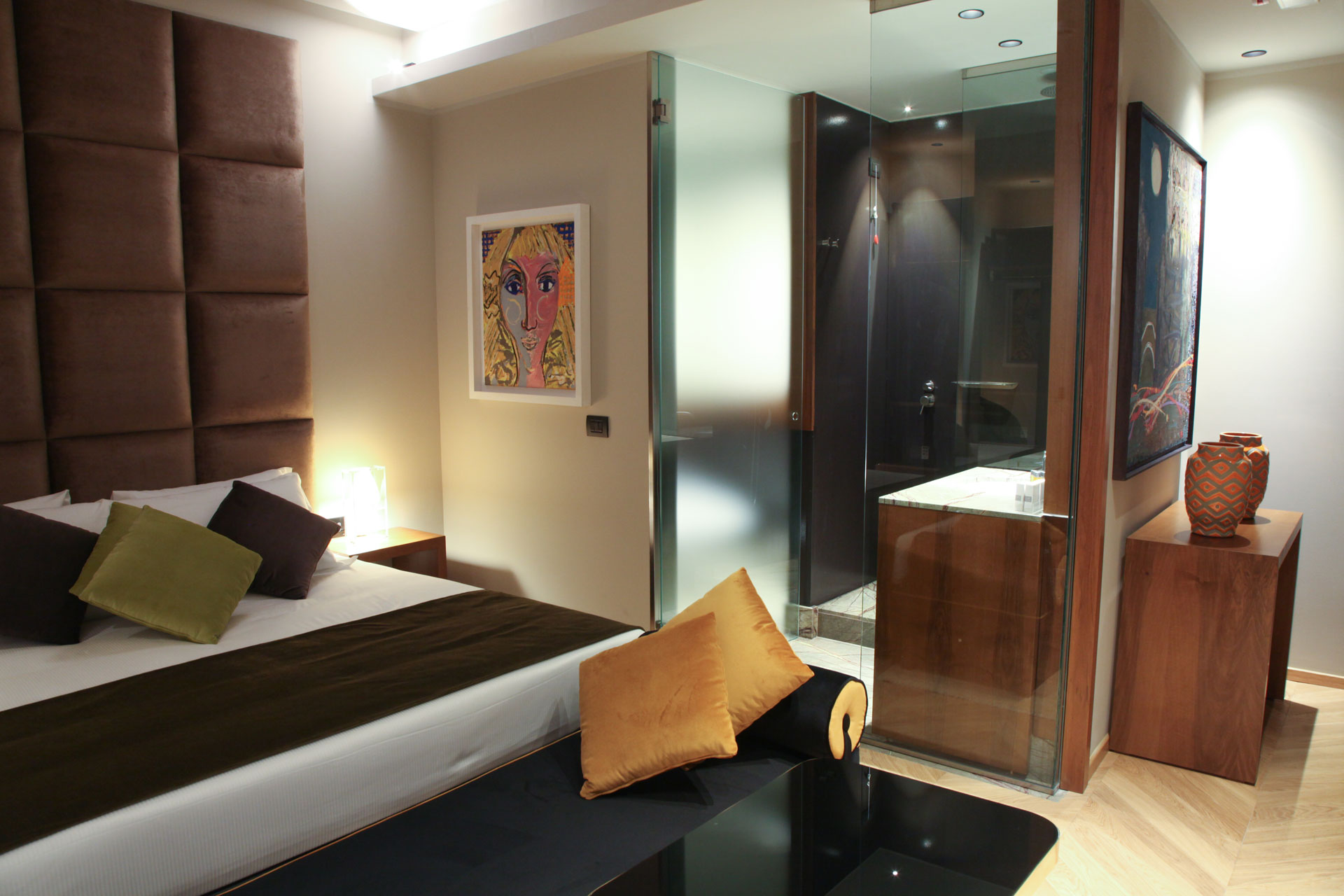 The oversized headboard of the king-size bed and the polychrome marble in the bathroom area enhance the elegance of the Panoramic Glass Suite, reflecting the unique style that characterizes the other accommodations.