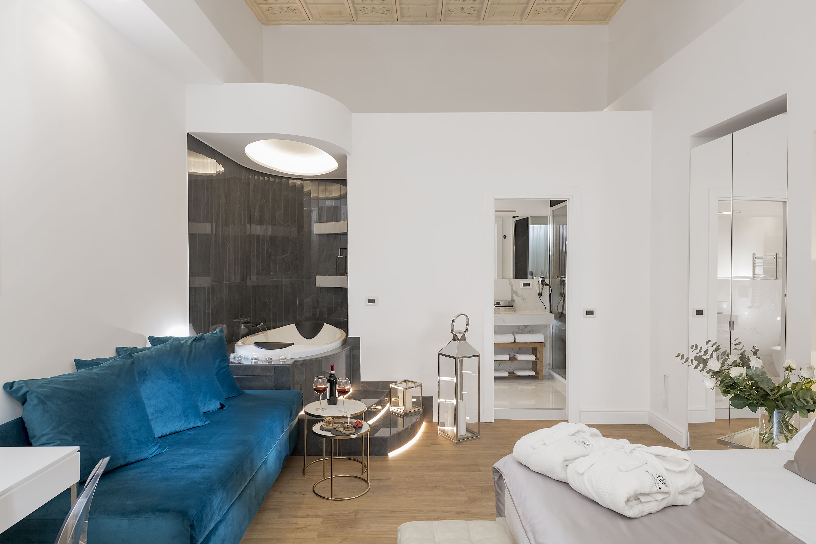 La Suite è la scelta ideale per un soggiorno di lusso a Roma. Dotata di un comodo letto matrimoniale, su richiesta divisibile in 2 letti singoli, vasca idromassaggio e un bagno in marmo con un'ampia doccia, prodotti da toilette biologici e un kit cortesia per gli ospiti. Da qui godrai di una vista sul cortile interno.