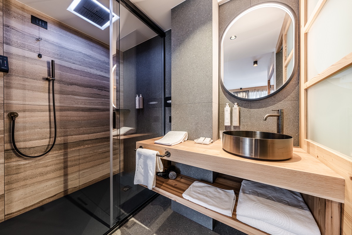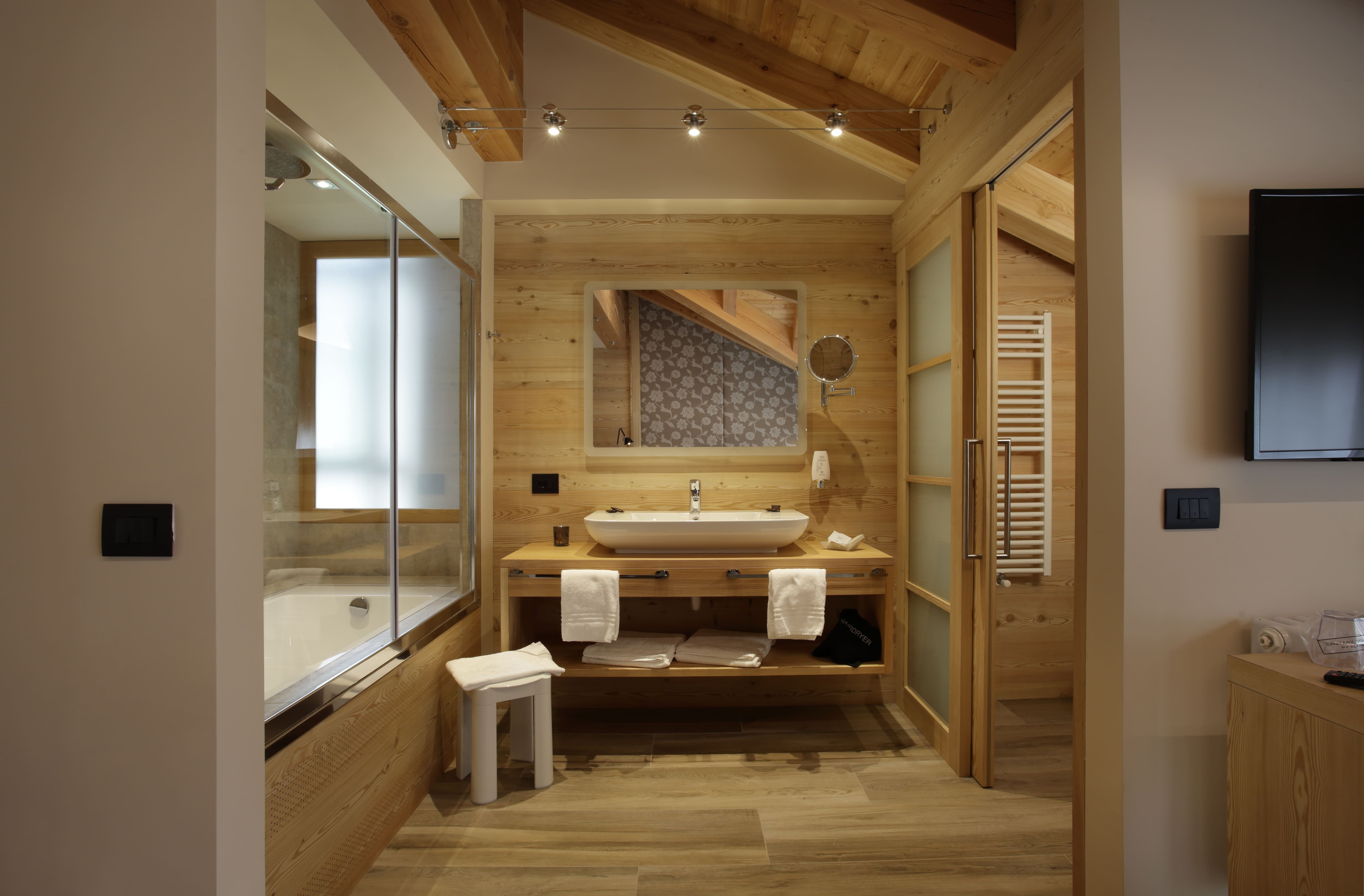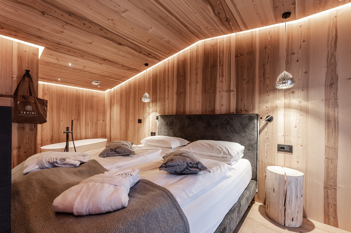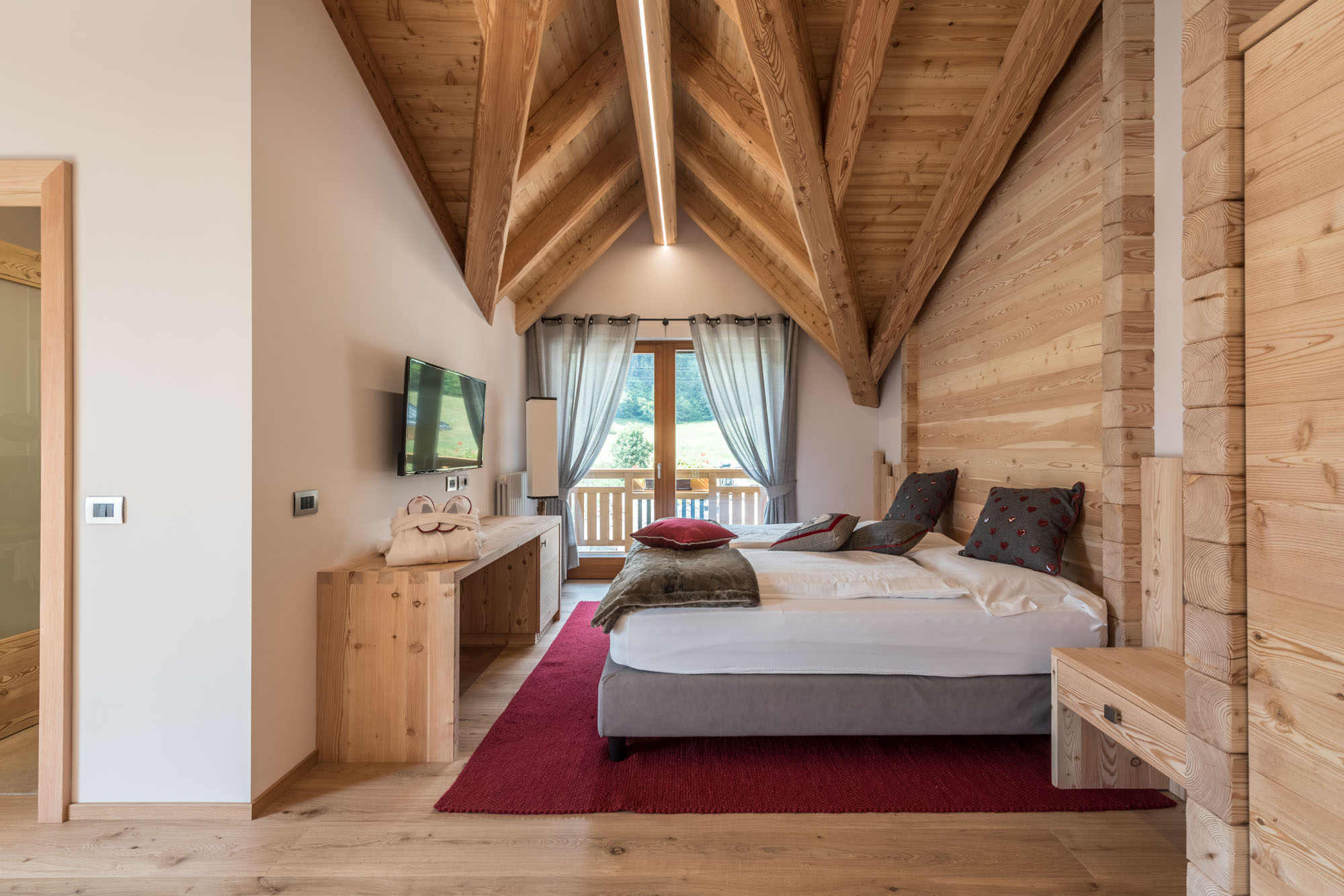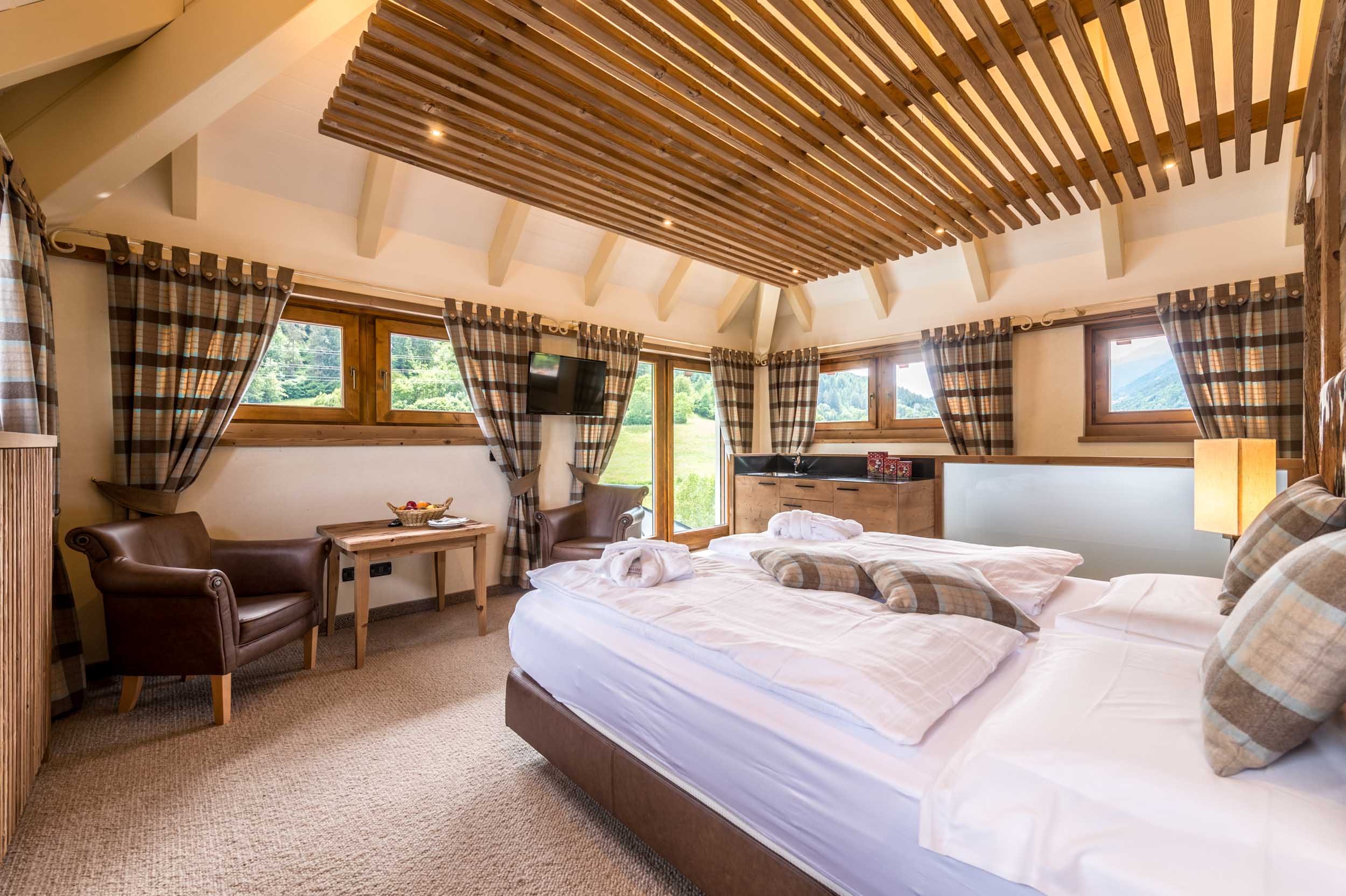 Bergchalet mit Eichenholzboden, größtenteils Dachgeschoss und im dritten Stock gelegen. Sie verfügen über ein bequemes Doppelbett, Sitzecke mit Sofa, TV mit Sky-Kanälen, WLAN, Klimaanlage und kontrollierte Lüftung, Minibar und Balkon mit Liegestühlen und Bergblick. Großes Badezimmer mit Dusche, Haartrockner und Pflegeprodukten. Wellnesstasche mit Bademantel, Badetuch und Slipper.