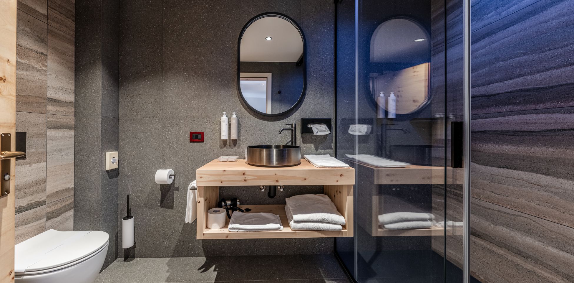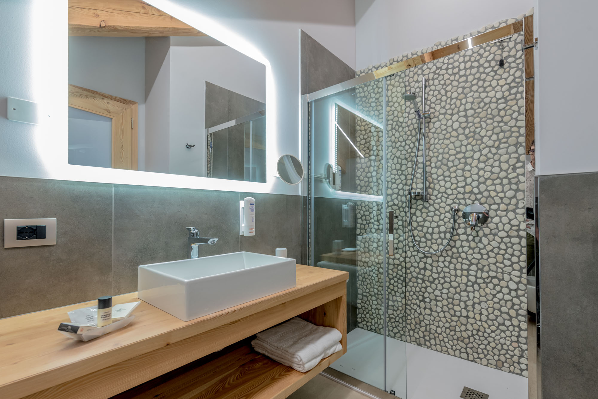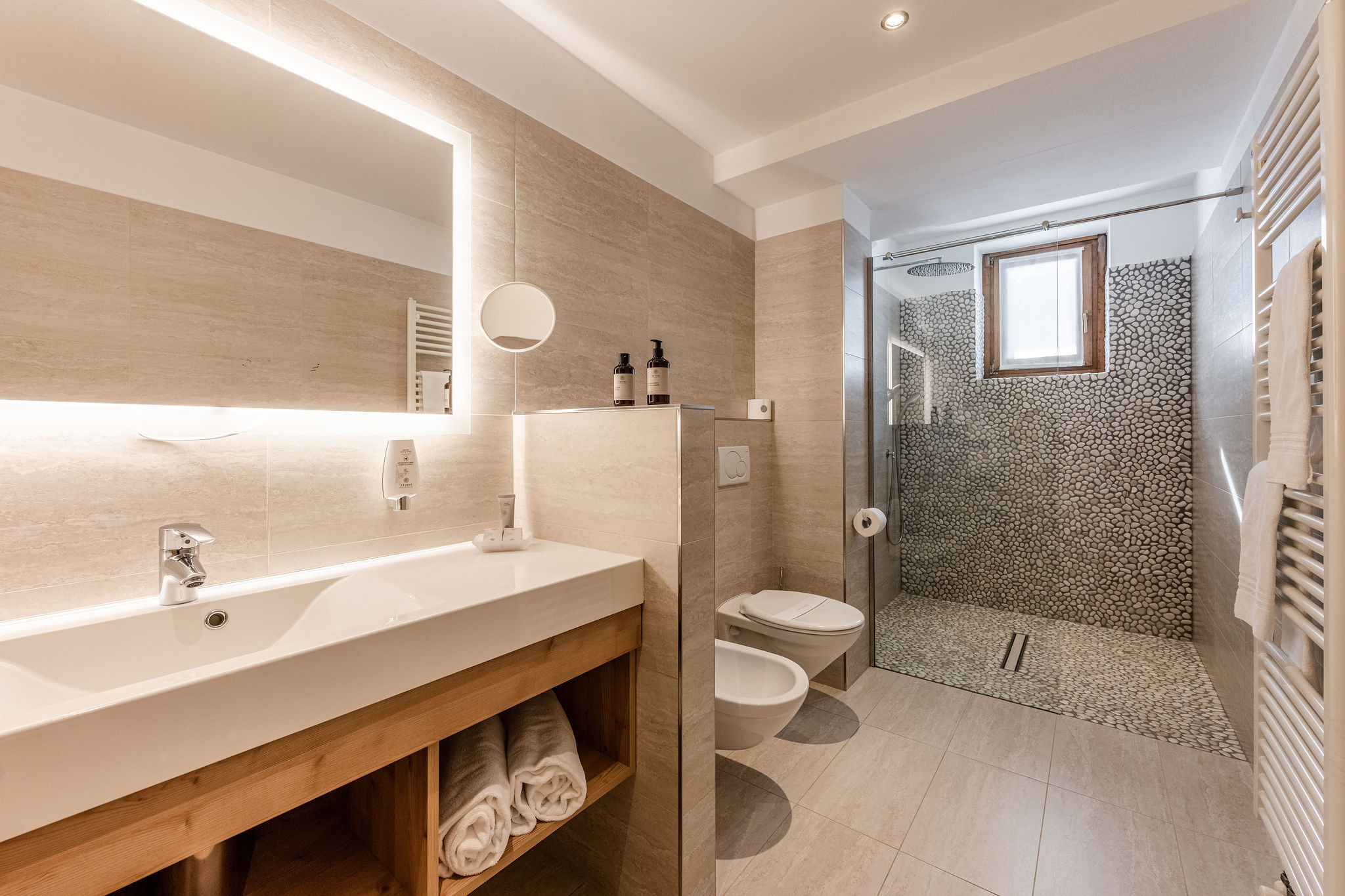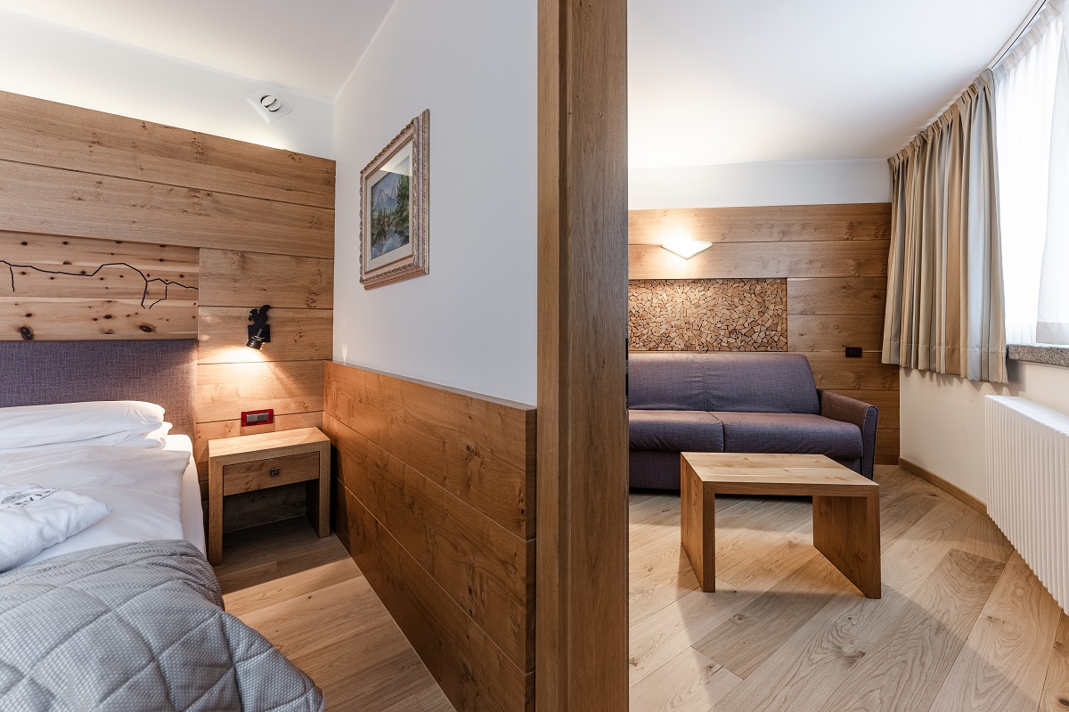 Bergchalet mit Eichenholzboden, größtenteils Dachgeschoss und im dritten Stock gelegen. Sie verfügen über ein bequemes Doppelbett, Sitzecke mit Sofa, TV mit Sky-Kanälen, WLAN, Klimaanlage und kontrollierte Lüftung, Minibar und Balkon mit Liegestühlen und Bergblick. Großes Badezimmer mit Dusche, Haartrockner und Pflegeprodukten. Wellnesstasche mit Bademantel, Badetuch und Slipper.