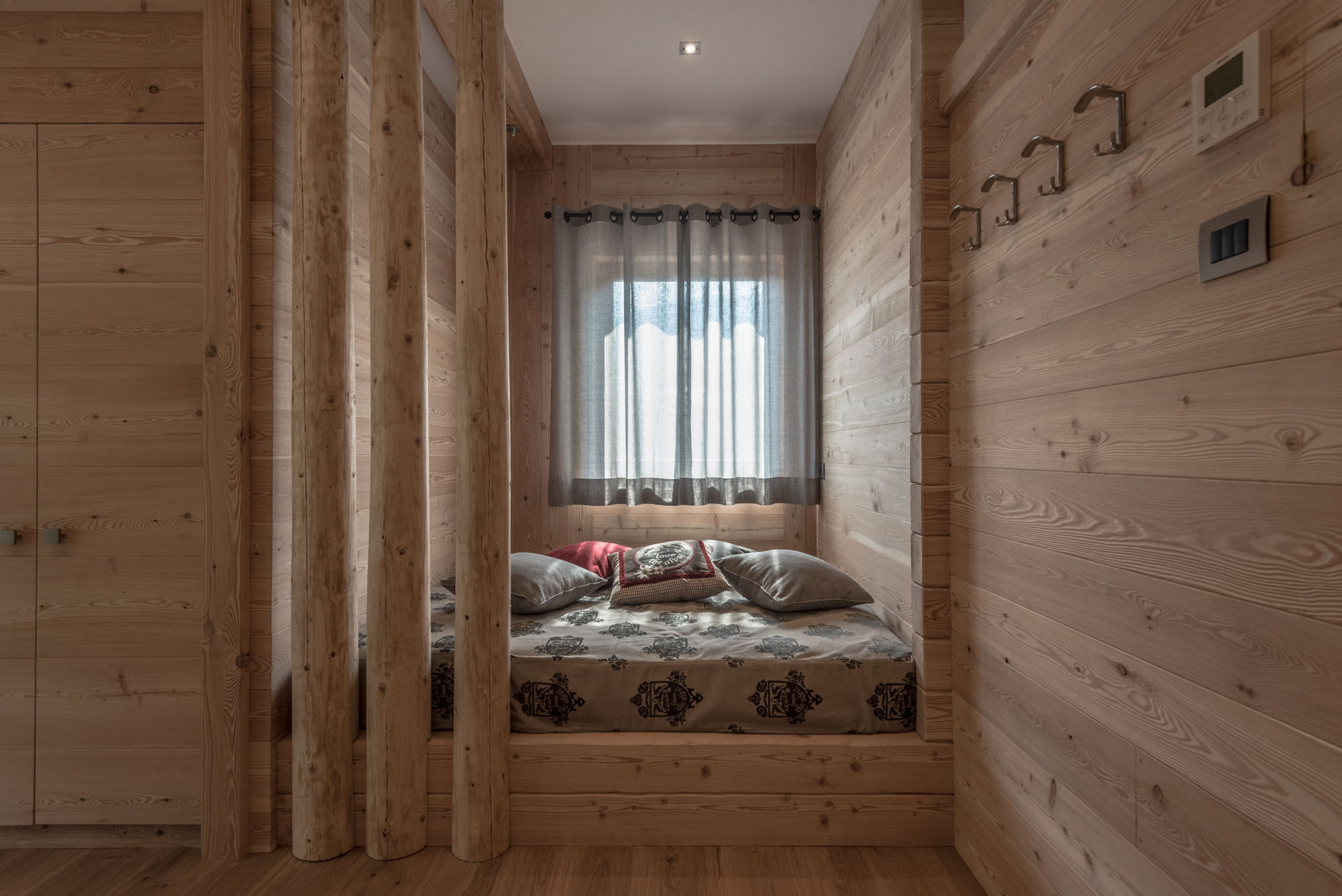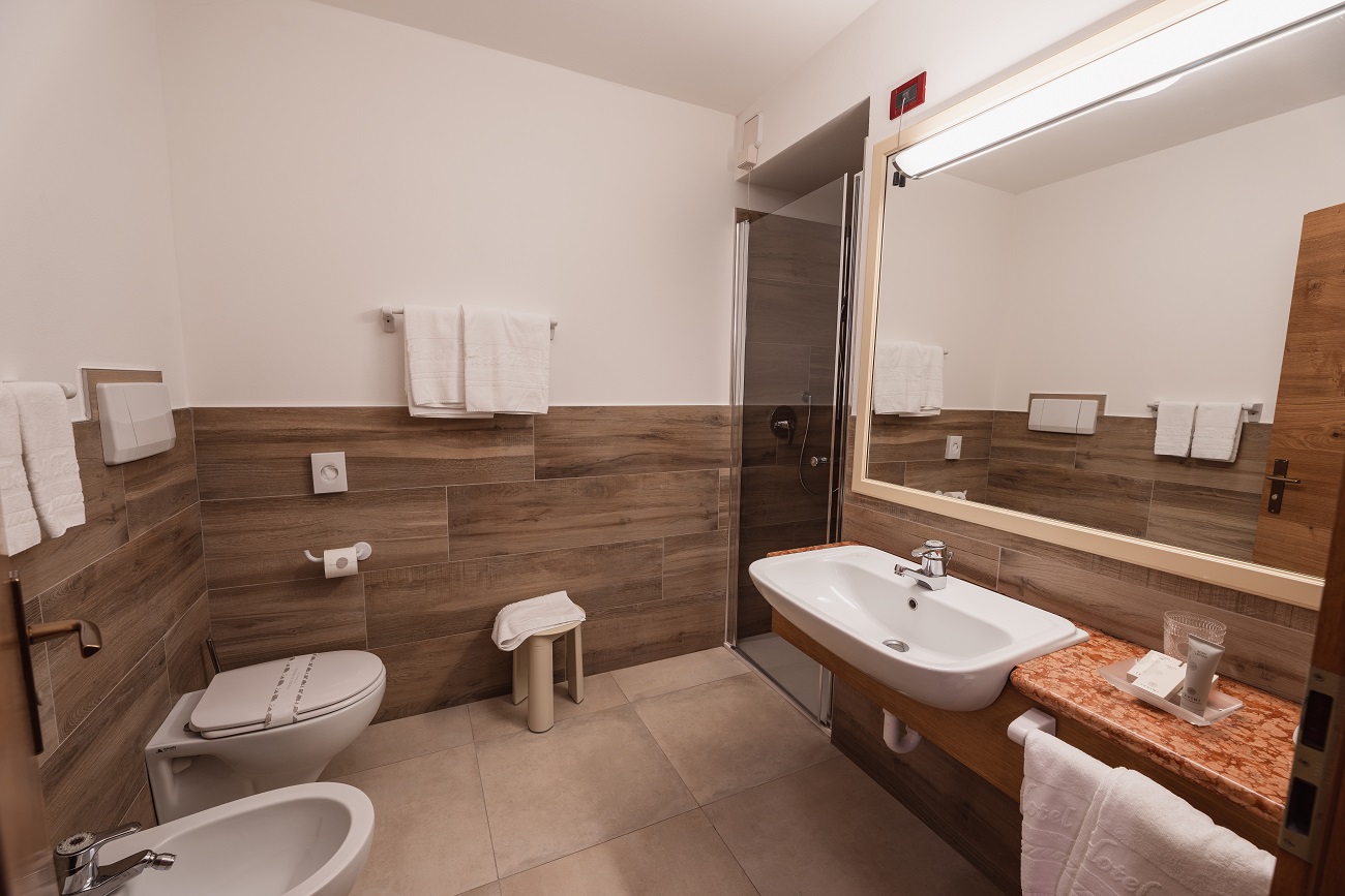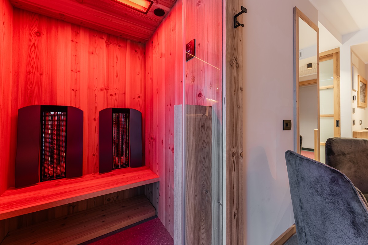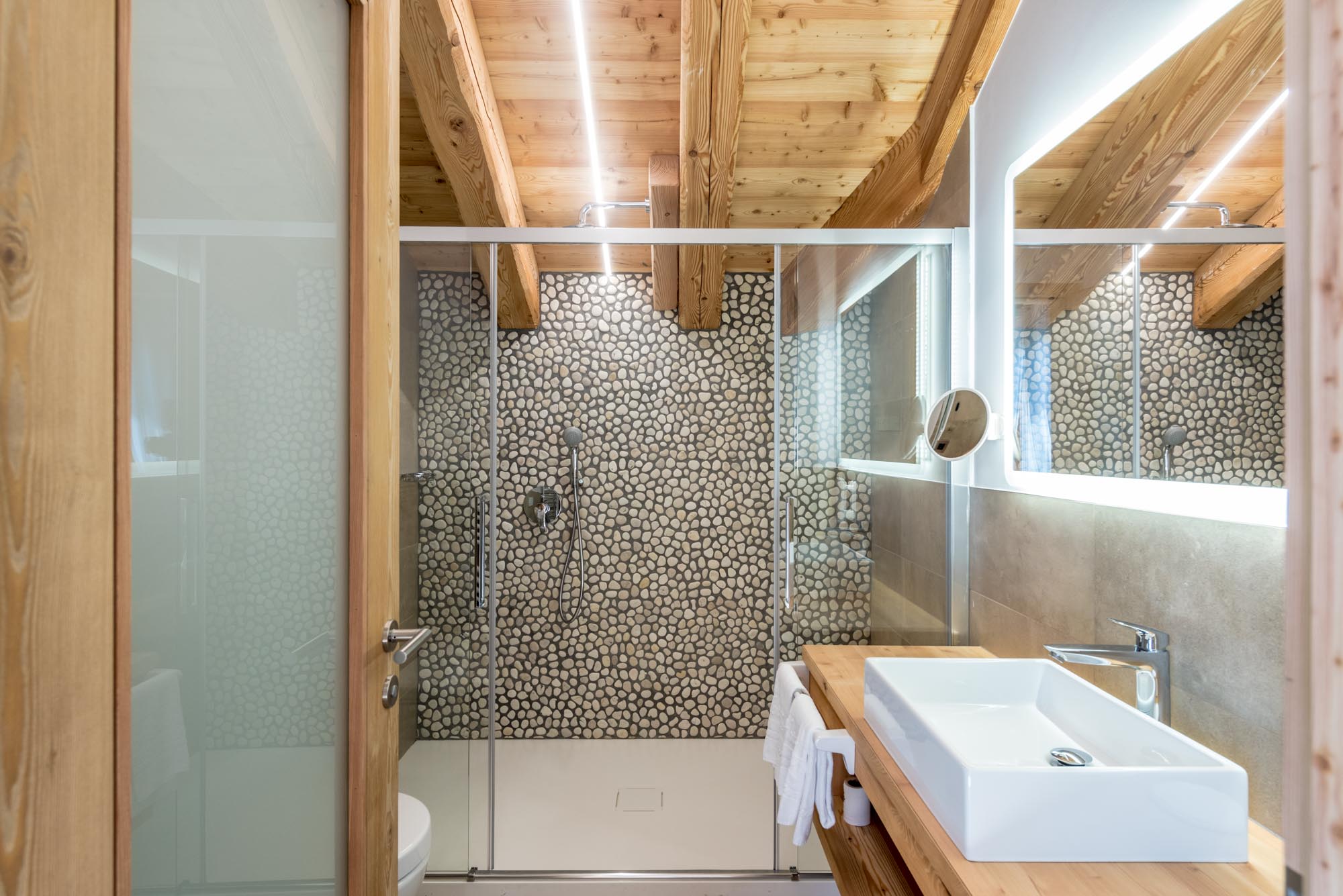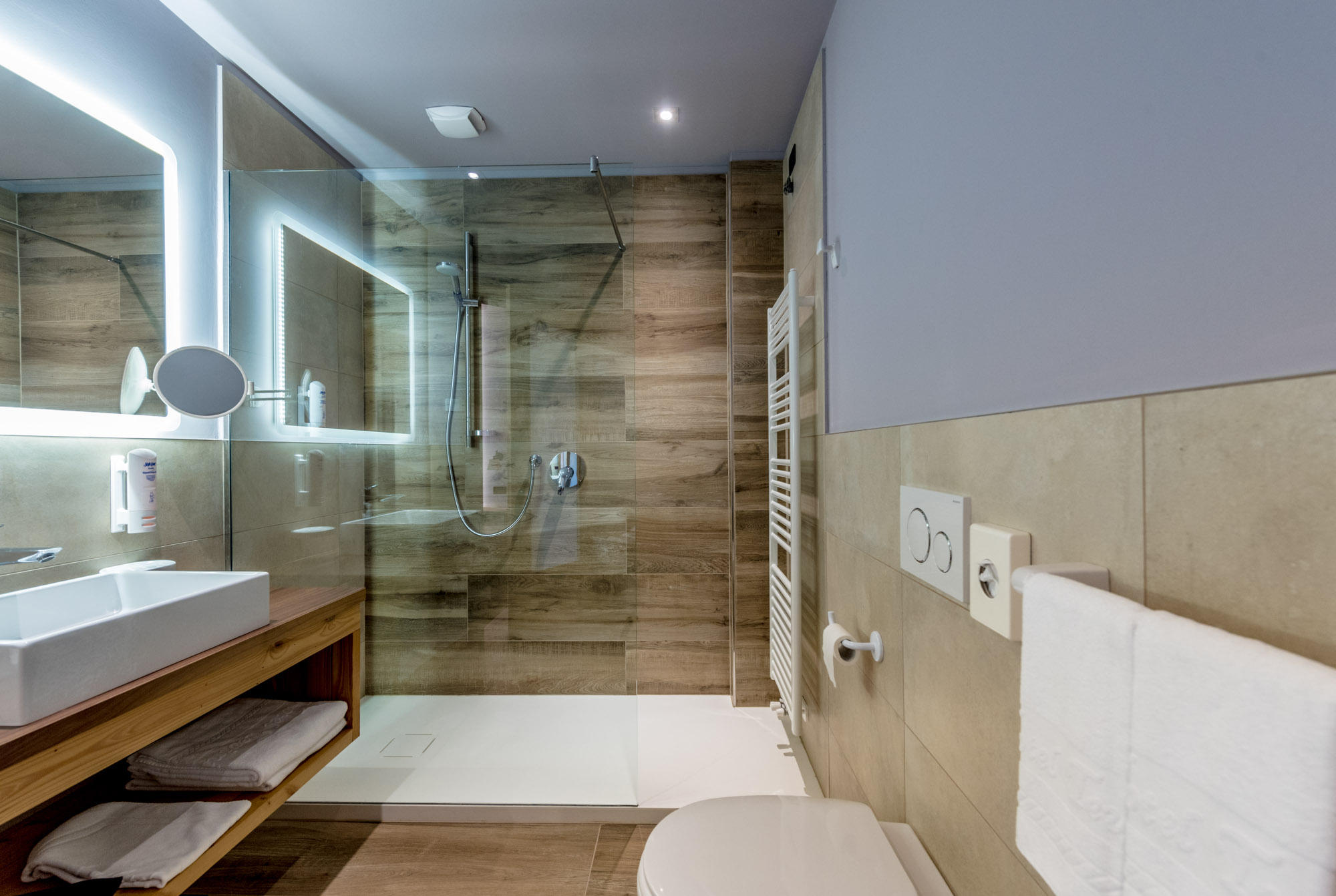 Bergchalet mit Eichenholzboden, größtenteils Dachgeschoss und im dritten Stock gelegen. Sie verfügen über ein bequemes Doppelbett, Sitzecke mit Sofa, TV mit Sky-Kanälen, WLAN, Klimaanlage und kontrollierte Lüftung, Minibar und Balkon mit Liegestühlen und Bergblick. Großes Badezimmer mit Dusche, Haartrockner und Pflegeprodukten. Wellnesstasche mit Bademantel, Badetuch und Slipper.