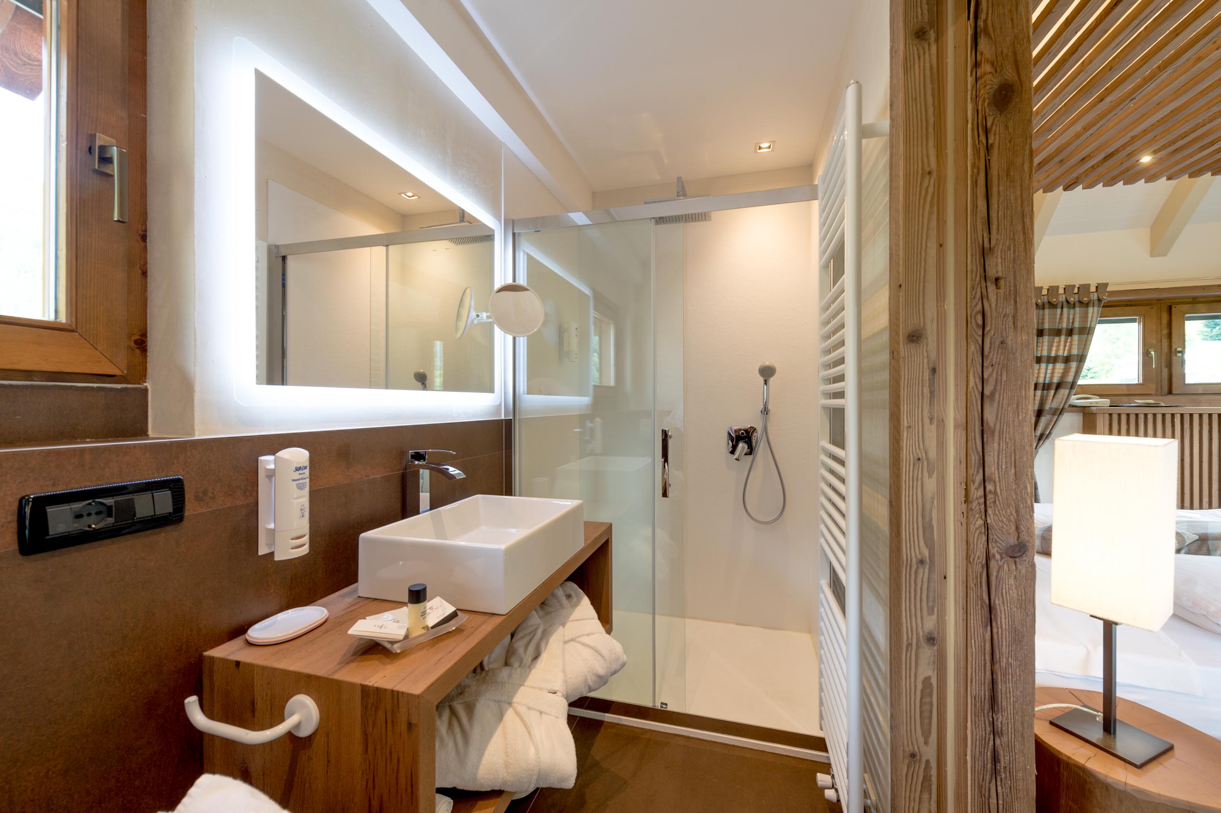Helle kürzlich renovierte Suite mit typischen Tiroler Erker, Holzmöbeln und zwei Terrassen mit Panoramablick. Safe, Telefon mit Wecker, Minibar, Klimaanlage, WLAN und LCD-TV mit Sky im Schlafzimmer und im Wohnzimmer. Großes Badezimmer mit Dusche, Haartrockner und Pflegeprodukten. Wellnesstasche und frisches Obst auf dem Zimmer.