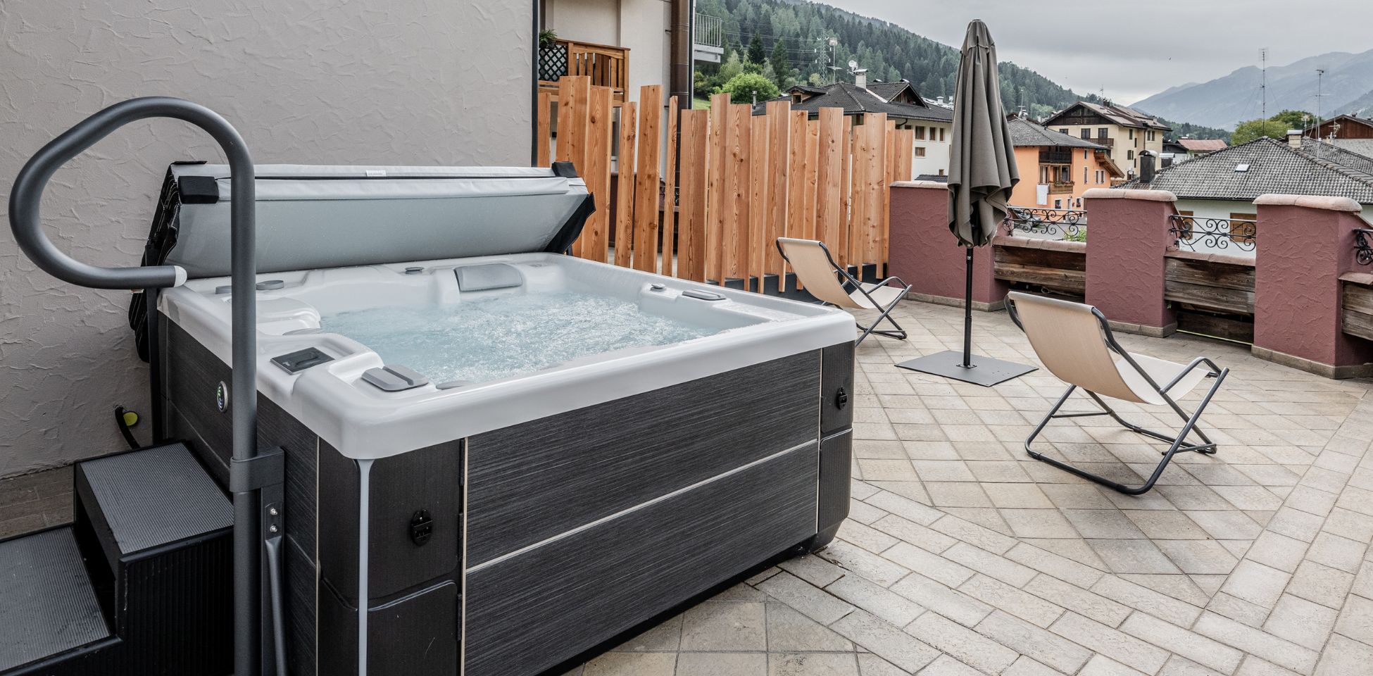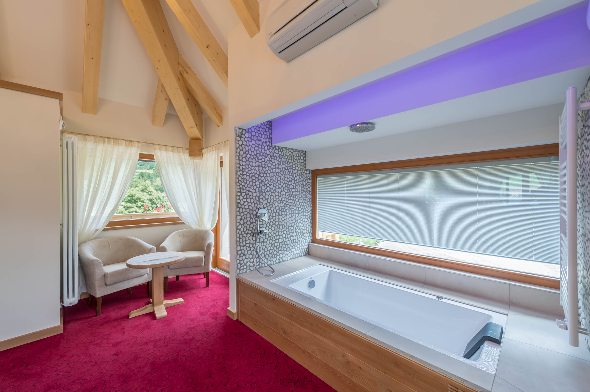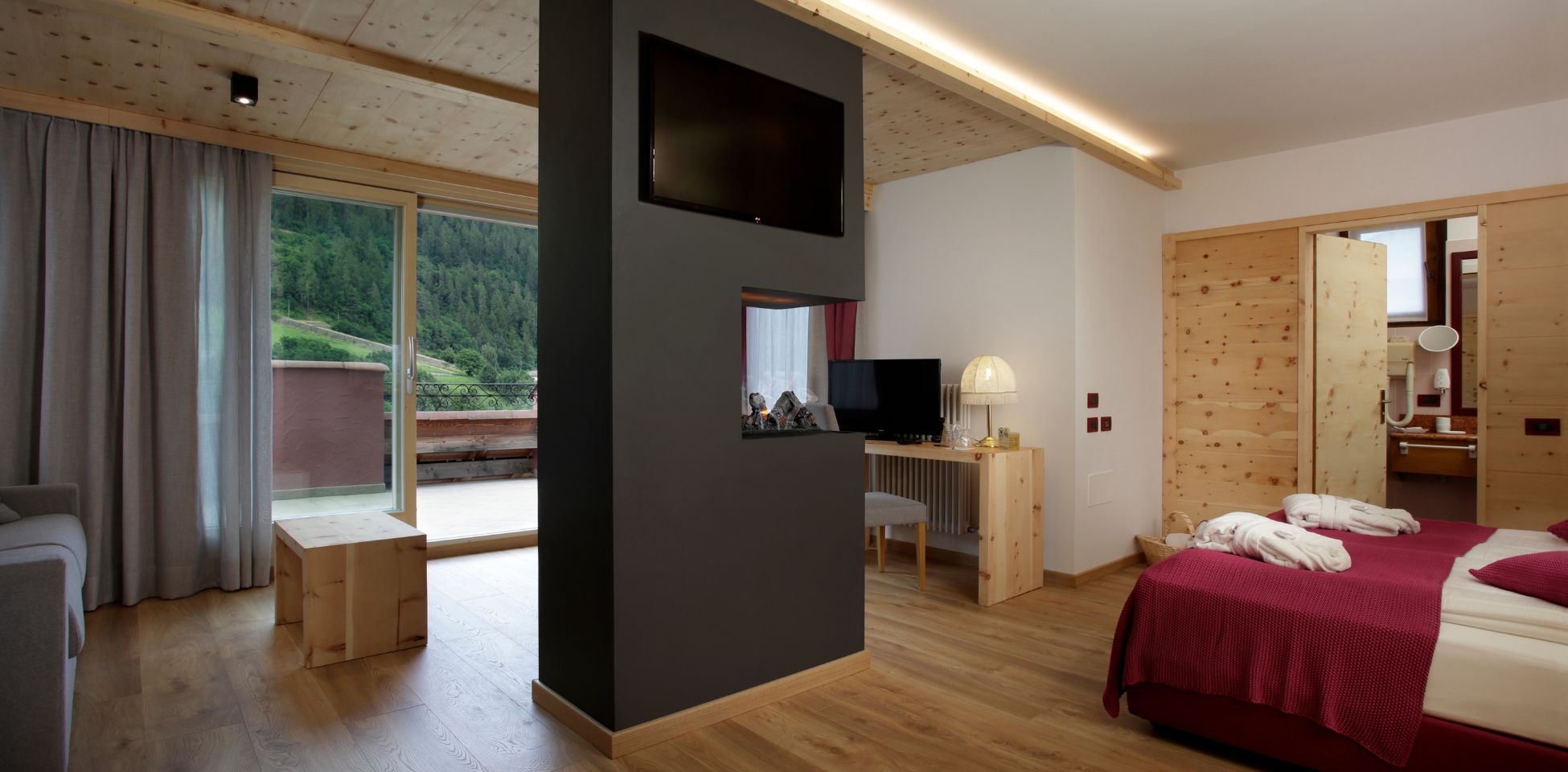 Ein exklusives romantisches Ambiente, erreichbar über eine Innentreppe und mit 360 ° Blick über das Val di Sole.Es verfügt über einen Balkon, einen kostbaren rubinroten englischen Wollboden, ein Doppelbett, ein Badezimmer und eine Open-Air-Massagewanne. Ausgestattet mit allem Komfort: WLAN, Safe, Telefon, LCD-TV mit Sky, WLAN, Minibar, kontrollierte mechanische Lüftung. Wellnesstasche und frisches Obst auf dem Zimmer.
