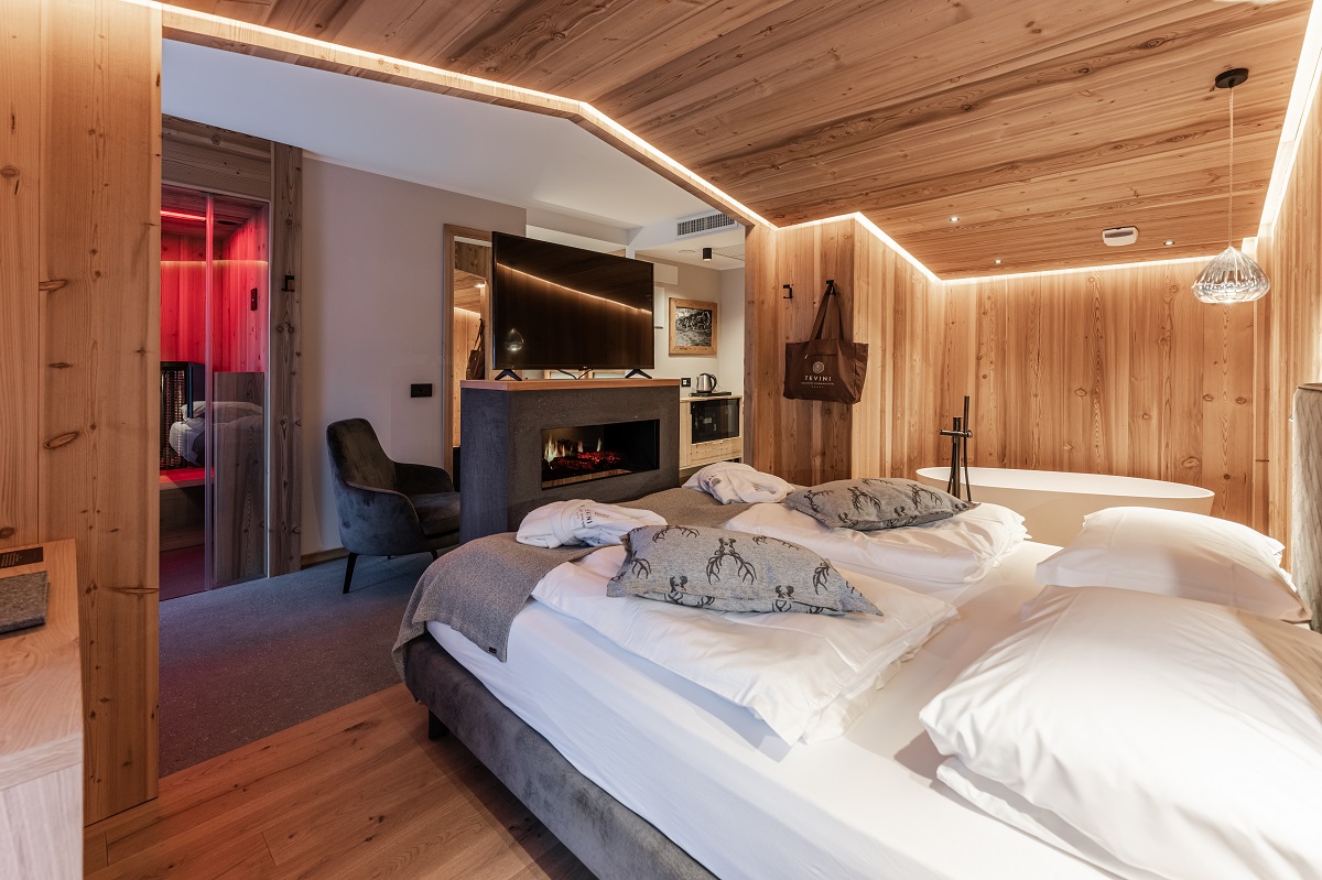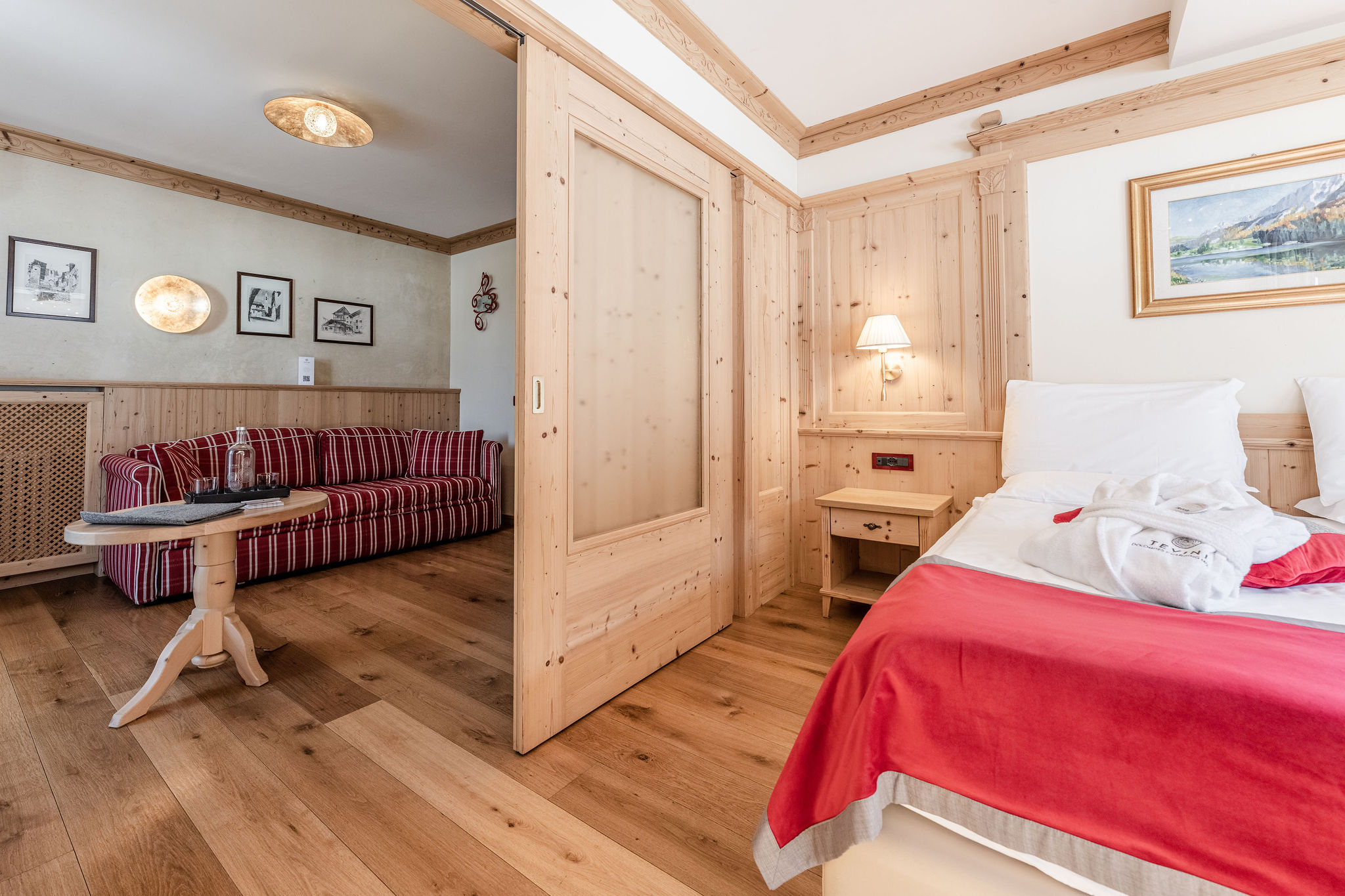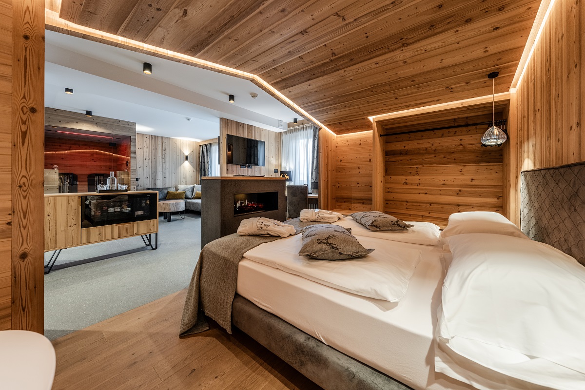 Im charakteristischen Bergstil eingerichtetes Zimmer mit natürlichen Farbtönen und dem Duft von Lärchenholz, das ein angenehmes Gefühl von Frische und Ruhe vermittelt. Ausgestattet mit zwei Balkonen, Panoramafenster, Holzboden, LCD-TV mit Sky-Kanälen, Telefon mit Wecker, Safe, WLAN, Minibar und kontrollierter mechanischer Lüftung. Sie finden eine kleine Küchenzeile mit Tee und Kaffee und eine Sitzecke mit Sofa und Kamin. Zwei Badezimmer mit Dusche, eigenem Bad und Badewanne. Wellnesstasche und frisches Obst auf dem Zimmer.