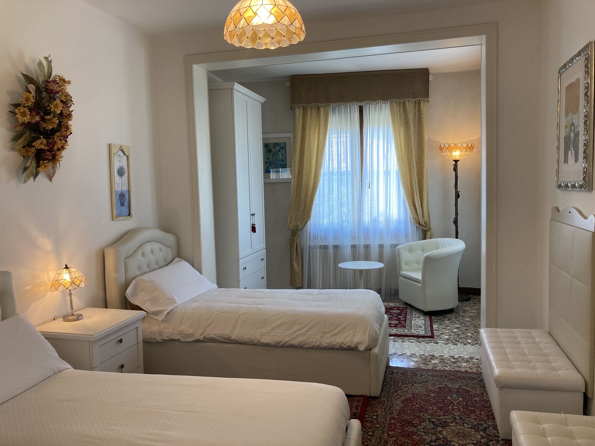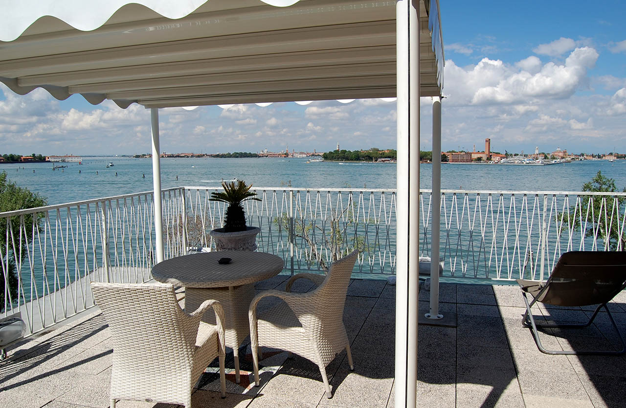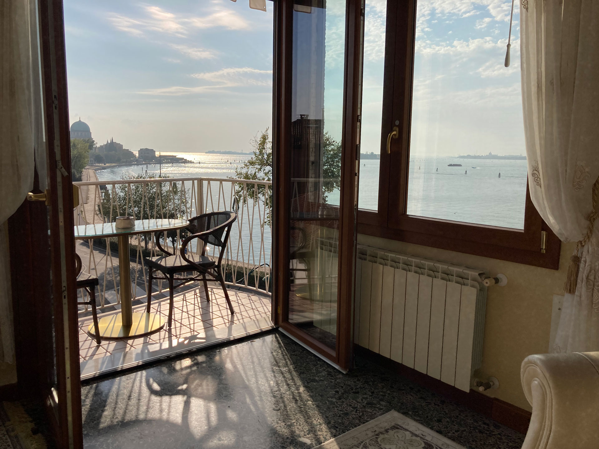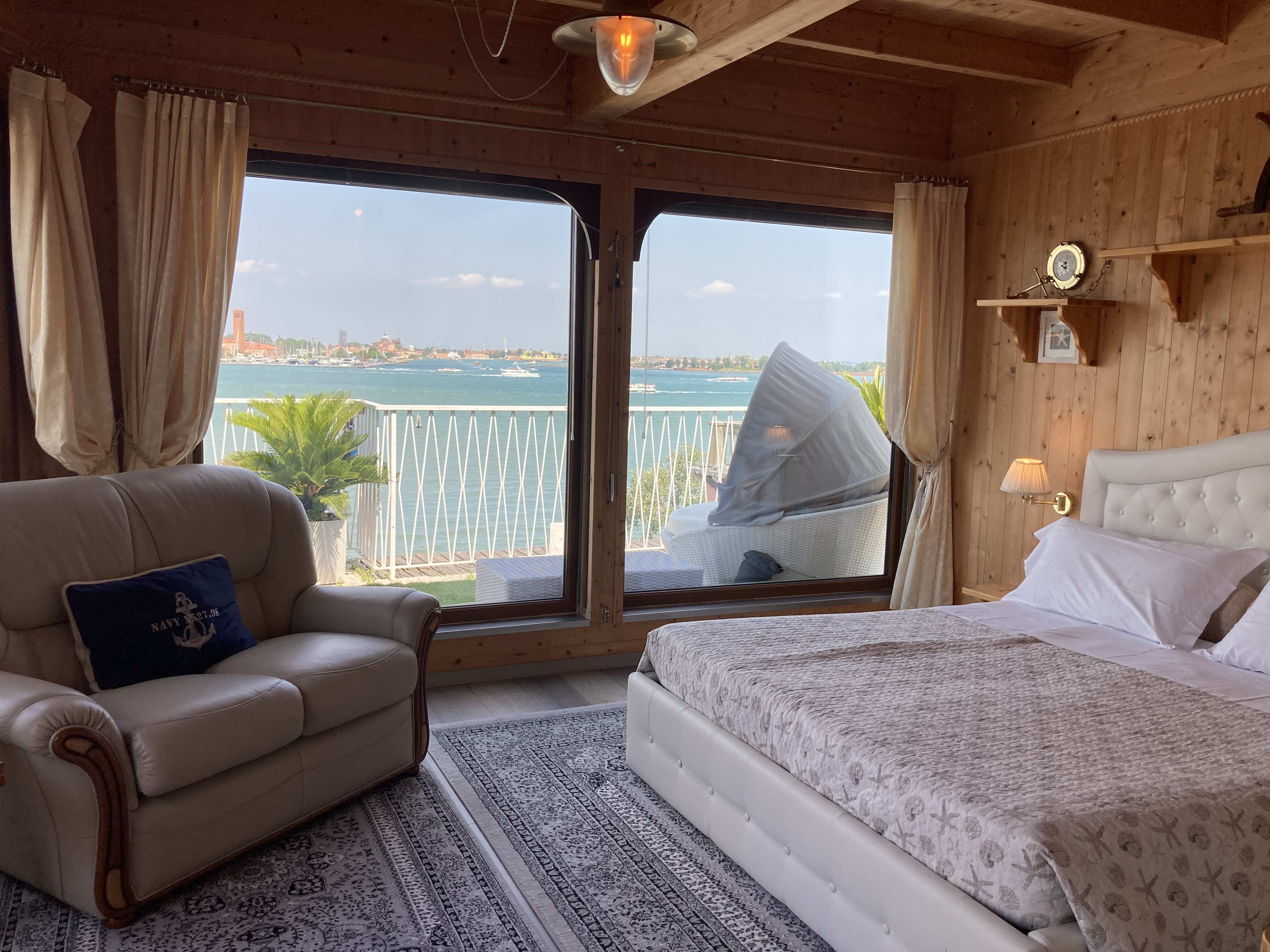 Matrimoniale con due balconi e splendida vista sulla laguna (180 gradi), bagno con doccia, in stile neo-liberty. Locazione ai sensi dell’art. 27 bis L.R. 11/2013
