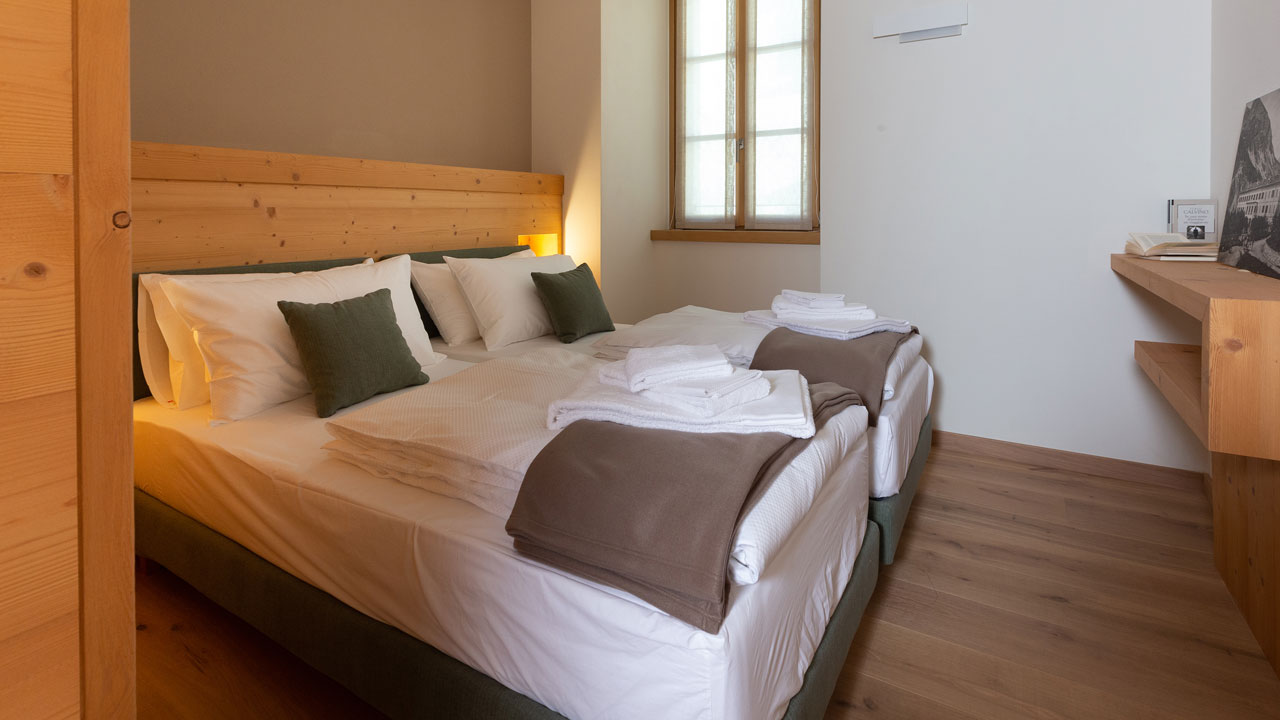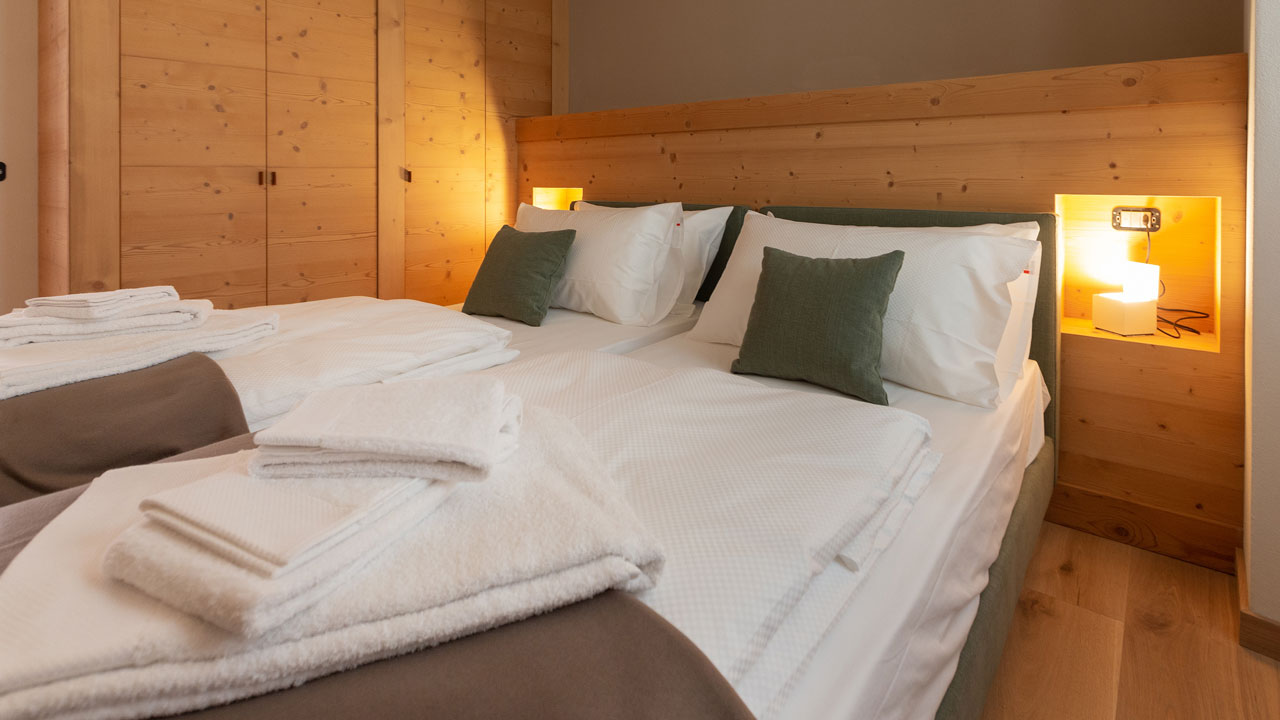 Die Schlafzimmer sind mit einem Doppelbett oder alternativ dazu mit zwei Einzelbetten ausgestattet. Je nach Verfügbarkeit kann ein Babybett angefordert werden.