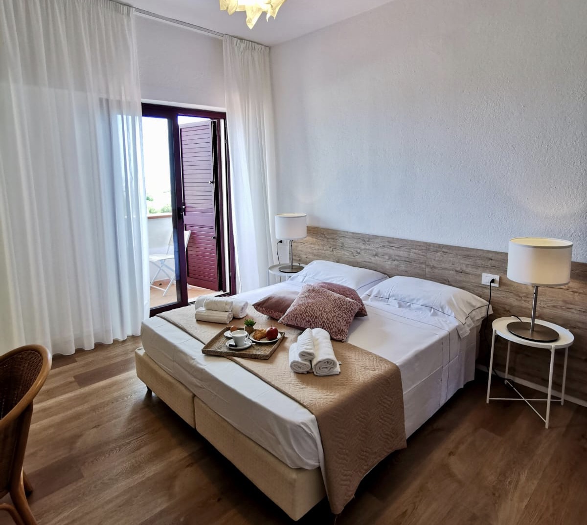 Diese Zimmer befinden sich im zweiten und dritten Stock und bieten einen herrlichen Panoramablick auf das Meer. Sie verfügen über einen privaten Balkon mit Tisch und Stühlen, von dem aus Sie bequem sitzend den Sonnenaufgang über dem Golf von San Teodoro und dem Strand La Cinta bewundern können.