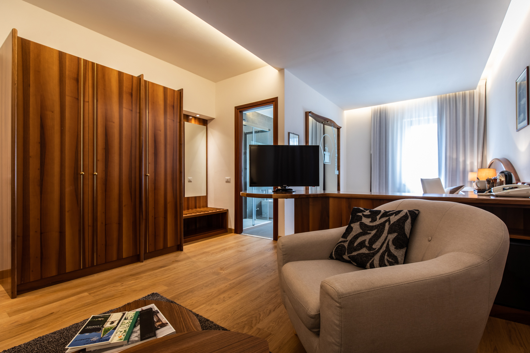 Bequeme und geräumige Lösung für Paare, die in ihrem Urlaub Platz und Komfort suchen. Die Suite enthält ein Wellness-Set mit Bademantel und Handtuch sowie eine Auswahl an Tee und Kaffee, die Sie in aller Ruhe in Ihrem Zimmer genießen können.