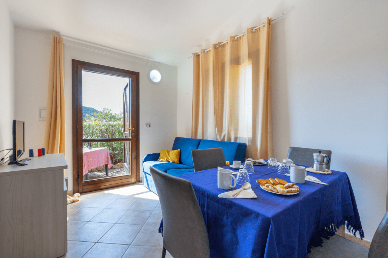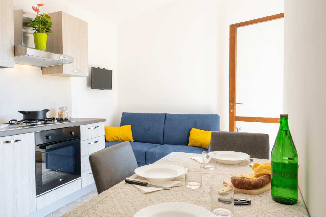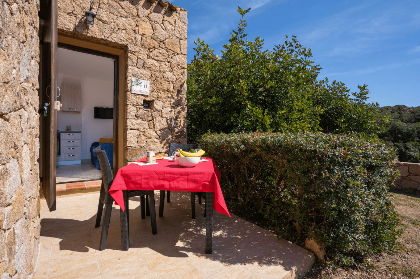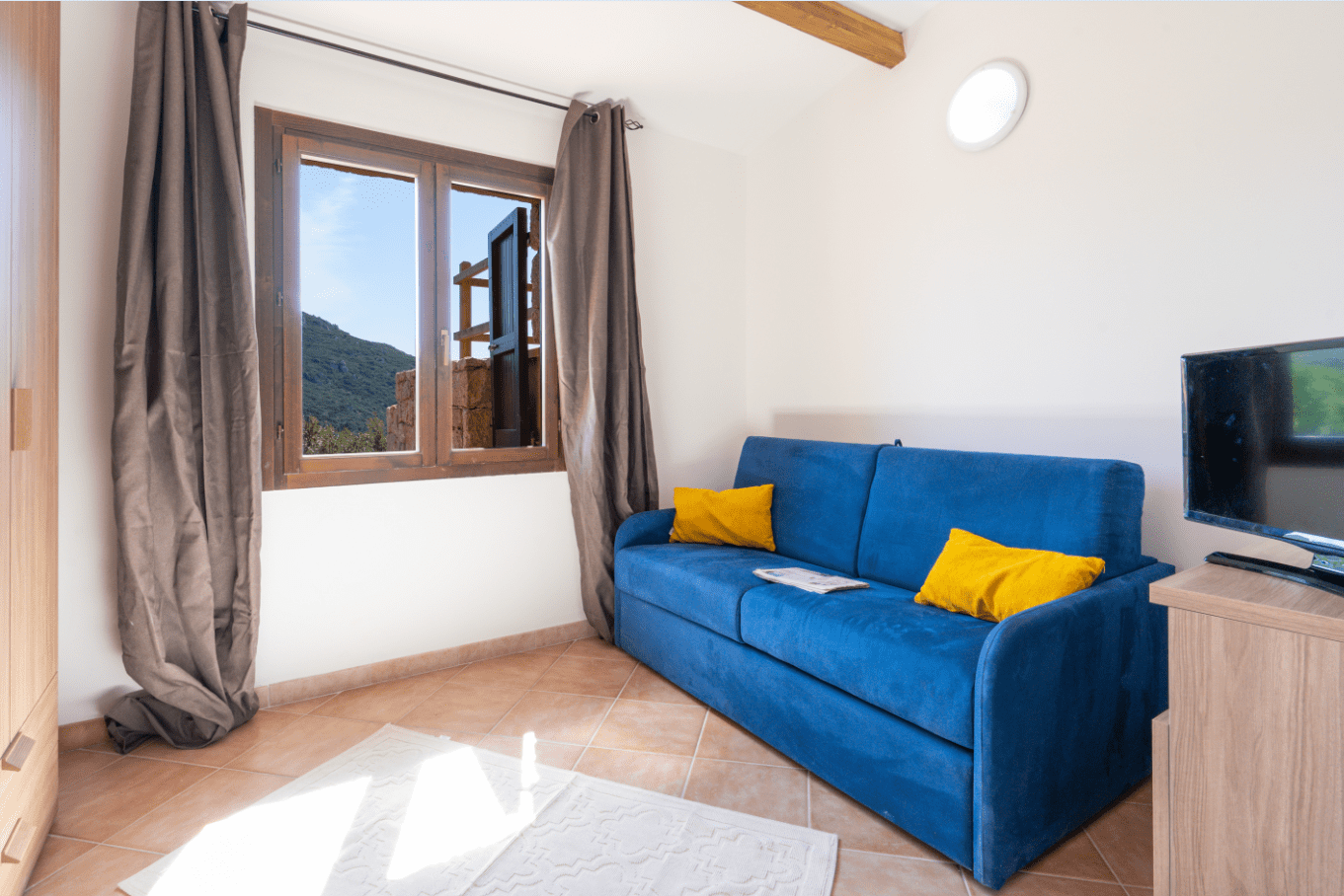 Evocative view, panoramic swimming pool and private outdoor space. Choose this two-room apartment immersed in the Mediterranean scrub. The apartment includes a double bedroom, a bathroom with shower and a living room with sofa bed and kitchenette. This apartment, which can accommodate up to three people, is furnished and equipped to make you enjoy your holiday to the fullest. All accommodations have an outdoor area for exclusive use, relaxation and tranquility are guaranteed. For you, among the extra special attention: bathroom and bed linen set included.