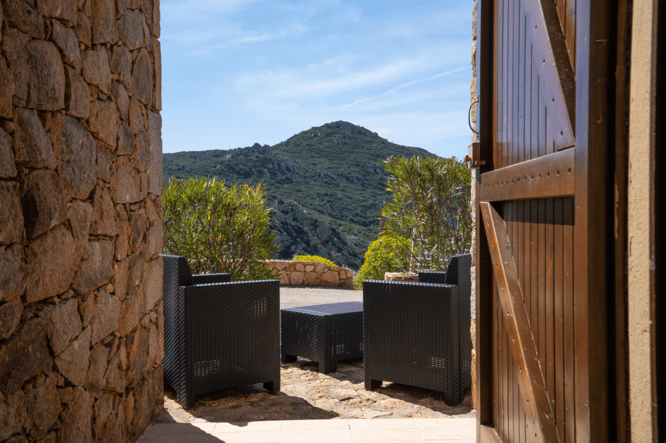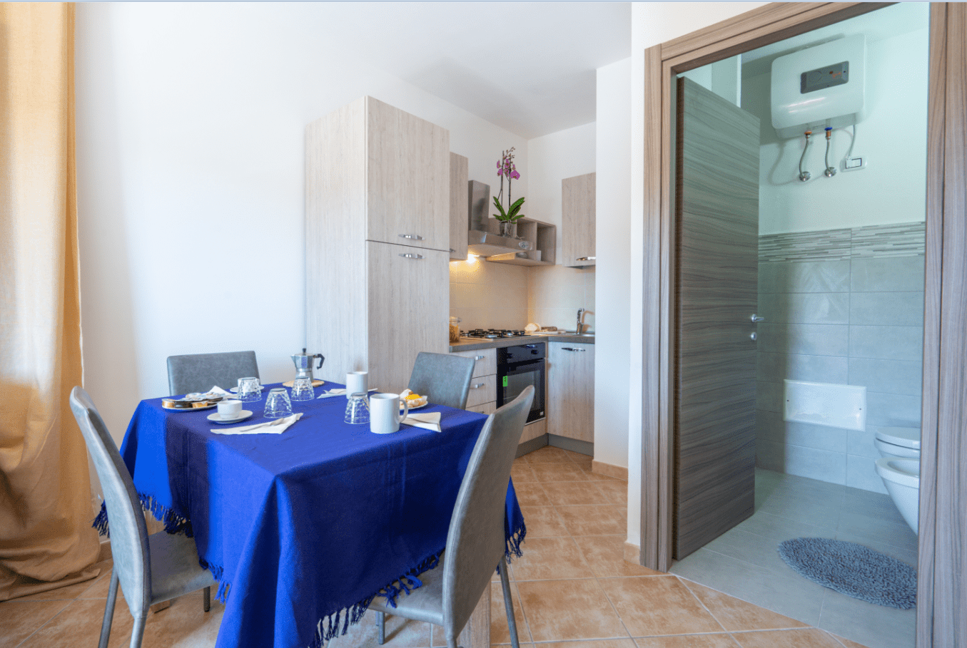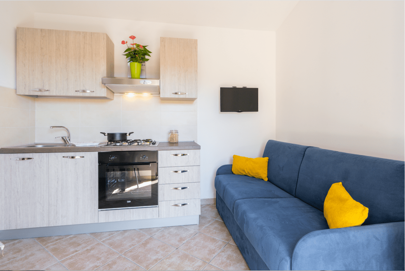 Evocative view, panoramic swimming pool and private outdoor space. Choose this two-room apartment immersed in the Mediterranean scrub. The apartment includes a double bedroom, a bathroom with shower and a living room with sofa bed and kitchenette. This apartment, which can accommodate up to three people, is furnished and equipped to make you enjoy your holiday to the fullest. All accommodations have an outdoor area for exclusive use, relaxation and tranquility are guaranteed. For you, among the extra special attention: bathroom and bed linen set included.